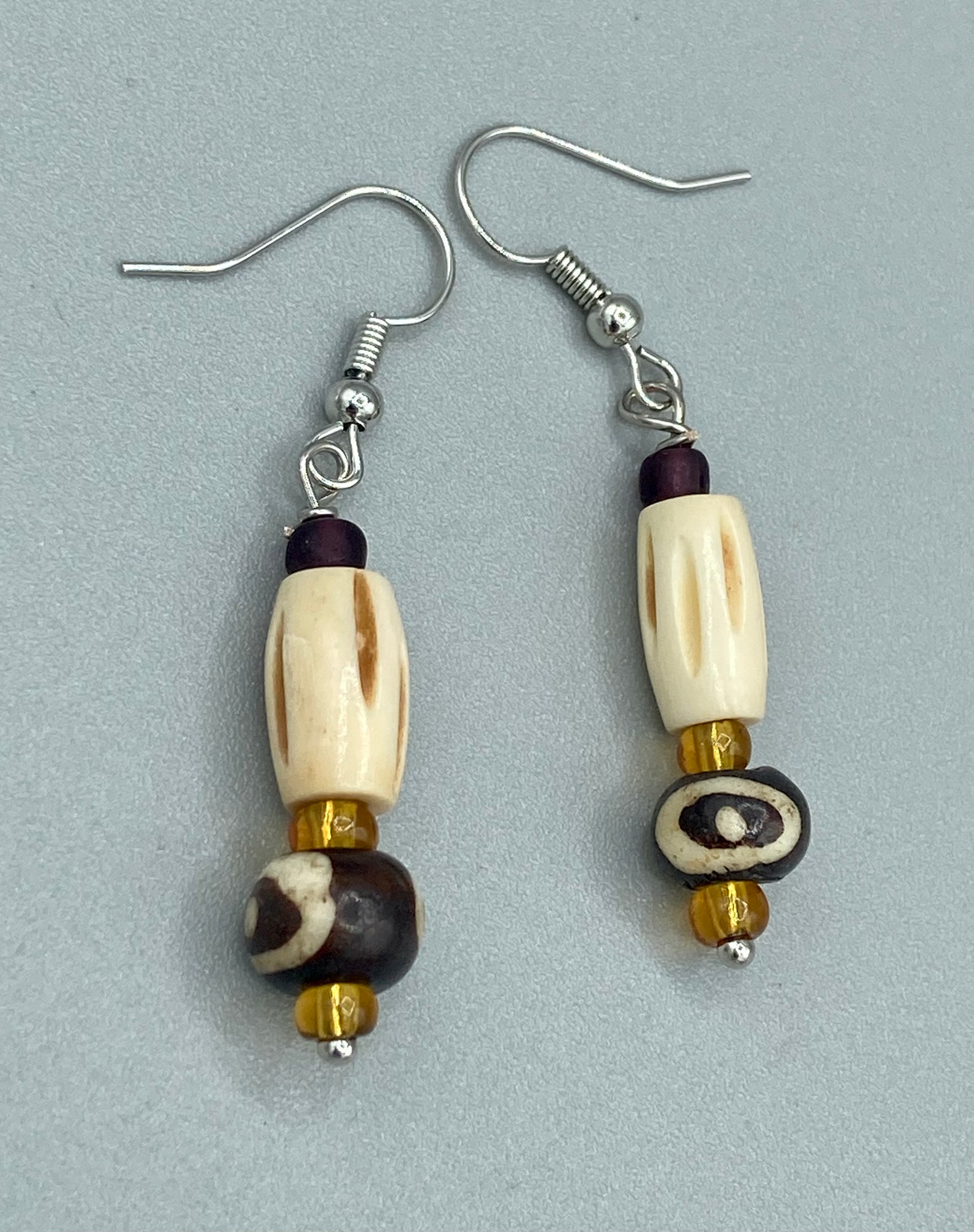 This set of earrings features a cylinder bone bead and round bone bead with eye design and a gold-tone glass bead. Neutral colors allow for versatile styling; the resulting look is sure to be unique.