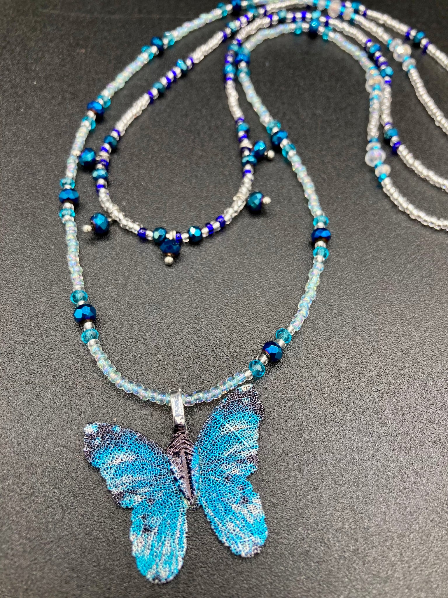This Sterling Silver Bright Sky Blue and Silver Butterfly Pendant is detailed with a basil leaf motif. With vibrant hues of blue and silver, the pendant is complimented by multi-color glass beads to create the ideal summer jewelry piece.