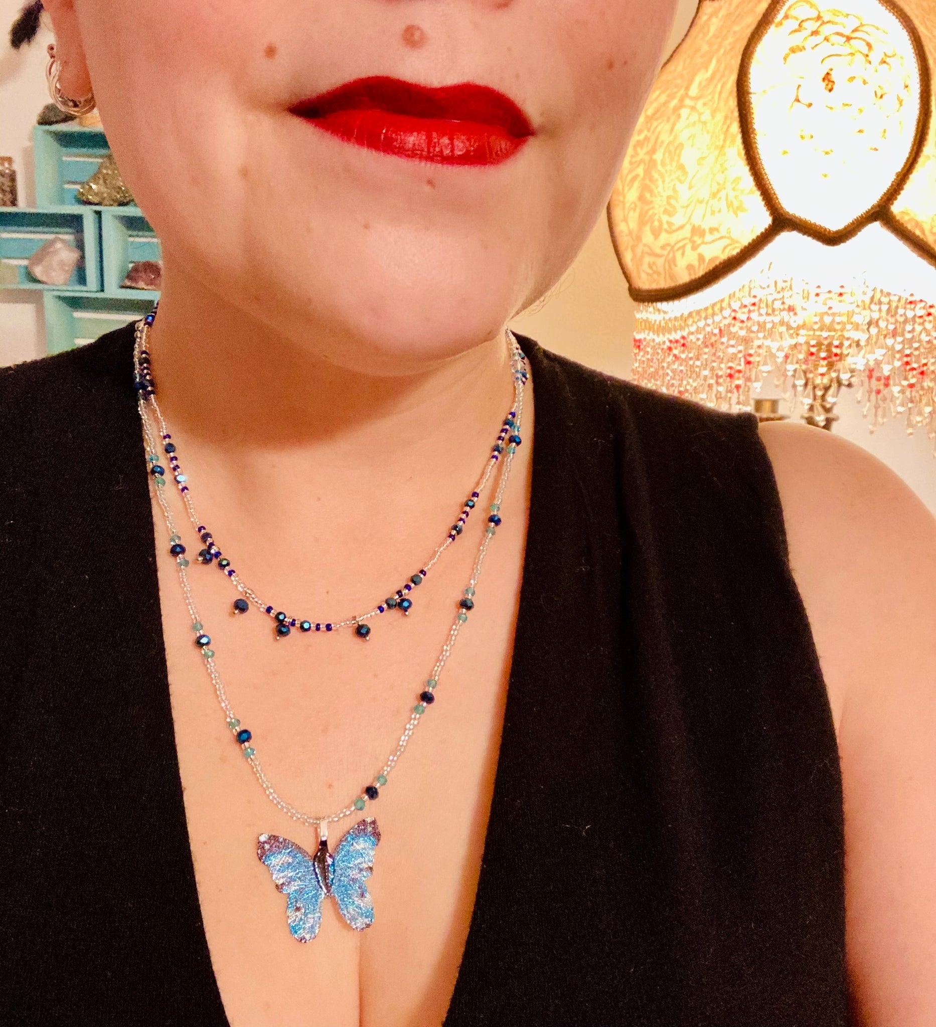 Due to small glass beads in between larger beads, make sure you hang your necklace to retain its shape. One of a kind jewelry, I do not duplicate designs exactly like each other. Dark, beautiful, unique gift for the bold.