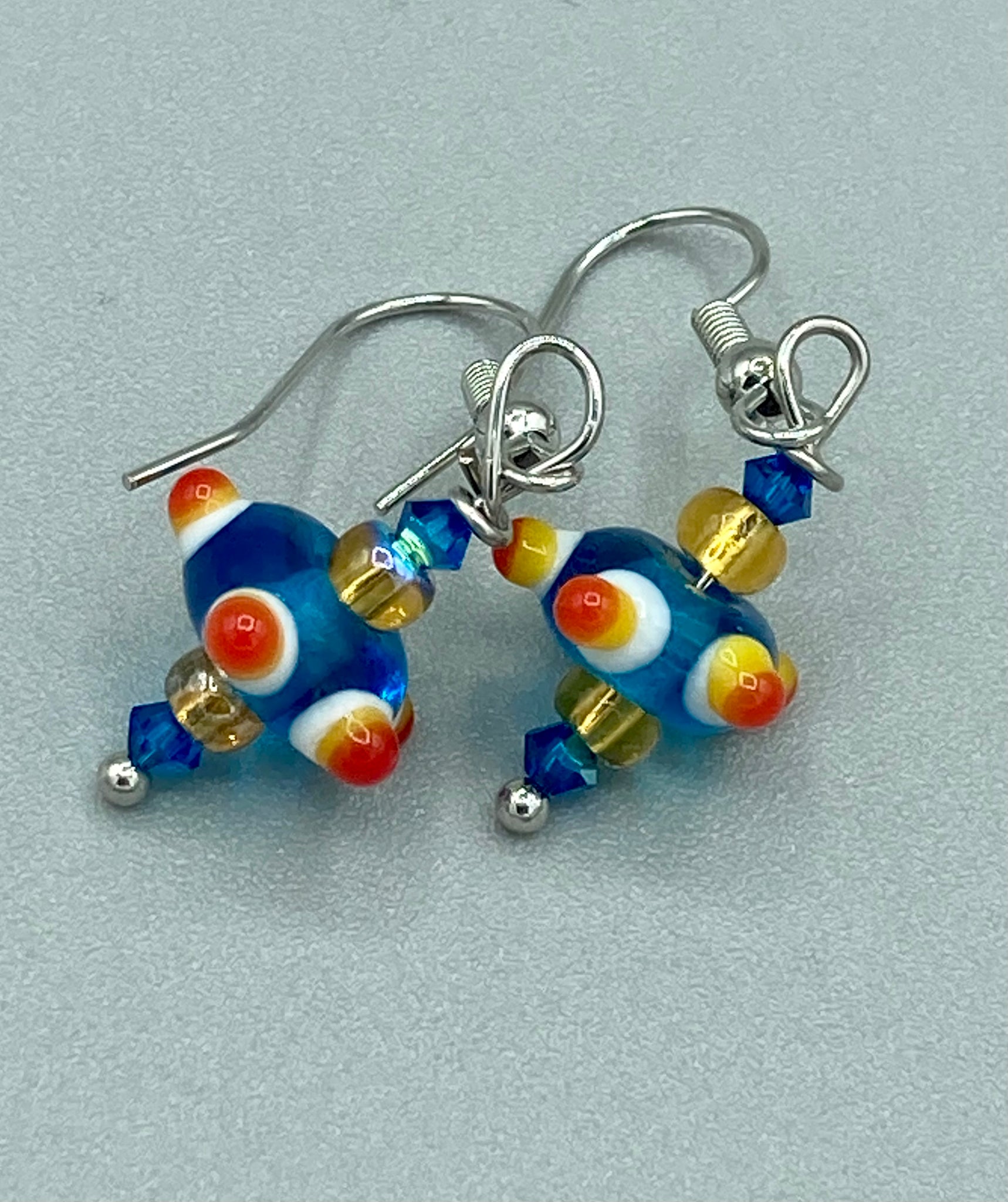 Vibrant color bumpy round lampworked glass bead set of earrings. Colorful teal, white, yellow, and bright orange festive piñata shaped bead. This also reminds me of the shape of a virus. Either way, this is a super fun, unique, bold piece of jewelry, it's sure to make a statement piece.