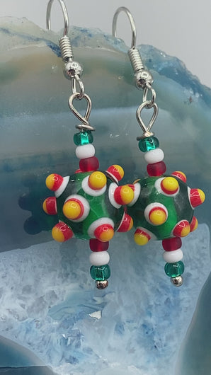 Vibrant color bumpy round lampworked glass bead set of earrings. Colorful green, white, red, and bright yellow festive piñata shaped bead. This also reminds me of the shape of a virus. Either way, this is a super fun, unique, bold piece of jewelry, it's sure to make a statement piece.