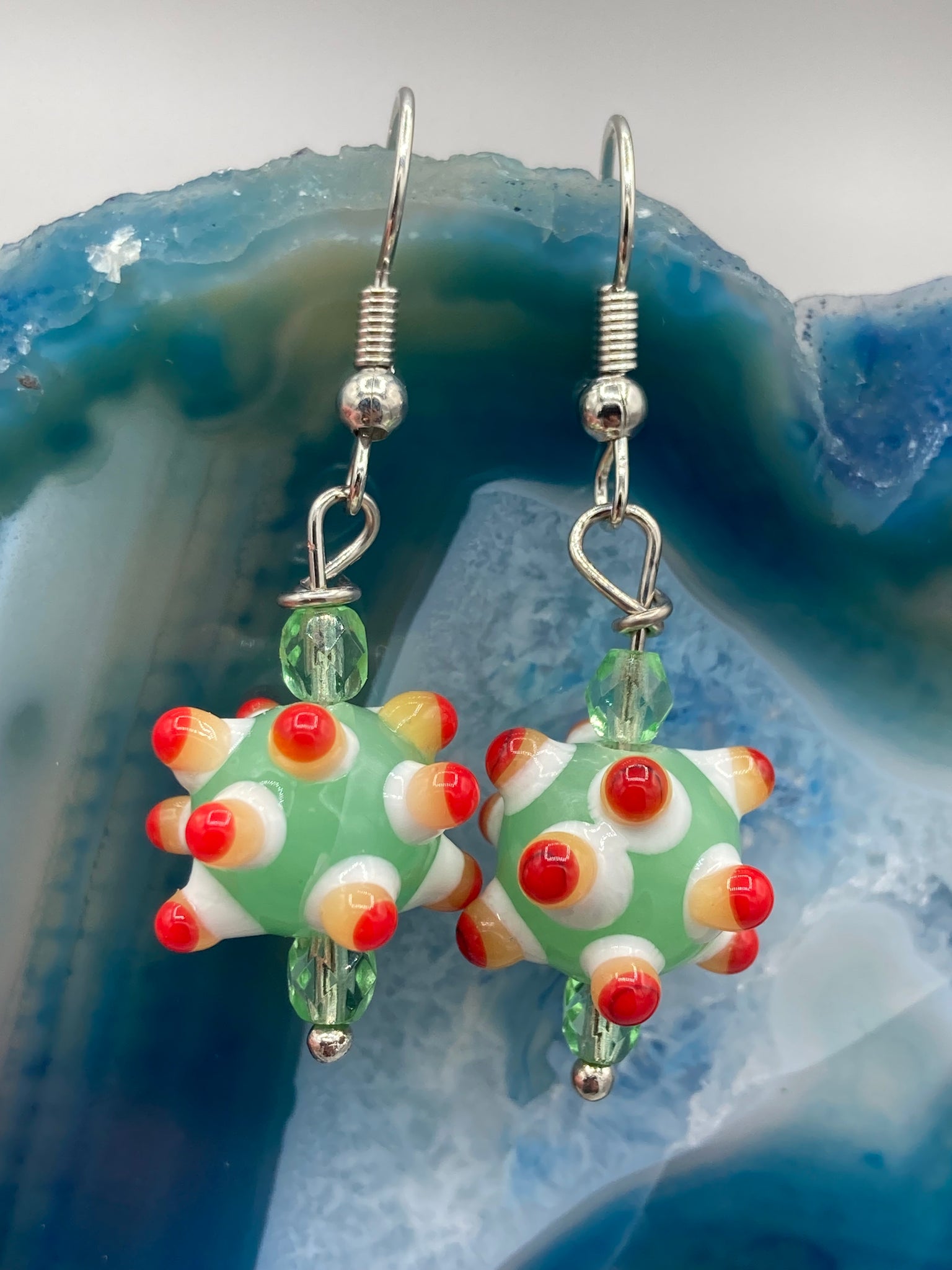 Vibrant color bumpy round lampworked glass bead set of earrings. Colorful light green, white, yellow, and bright red festive piñata shaped bead. This also reminds me of the shape of a virus. Either way, this is a super fun, unique, bold piece of jewelry, it's sure to make a statement piece.