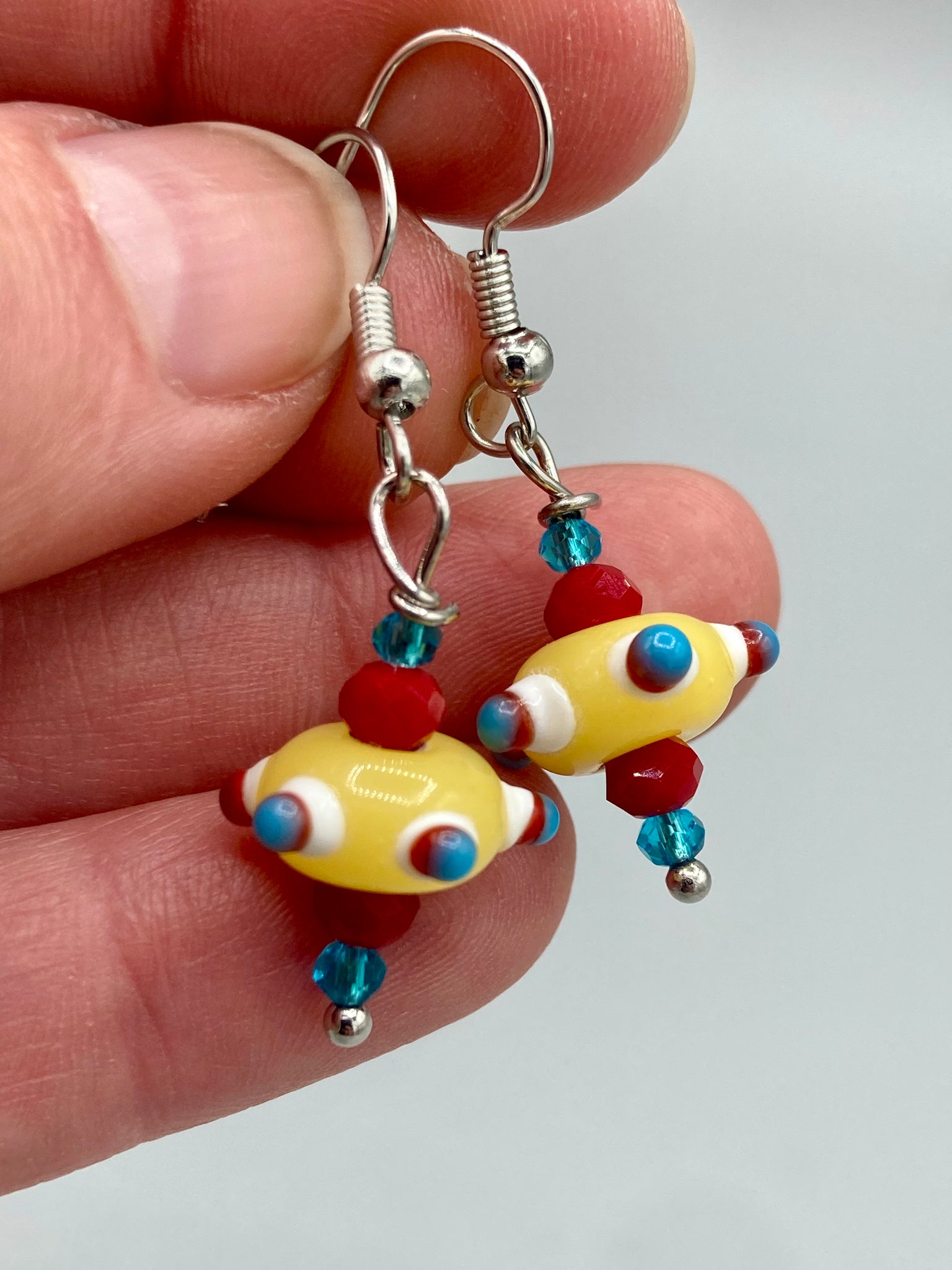 Vibrant color bumpy round lampworked glass bead set of earrings. Bright canary yellow, white, teal blue, and dark red festive piñata shaped bead. This also reminds me of the shape of a virus. Either way, this is a super fun, unique, bold piece of jewelry, it's sure to make a statement piece.