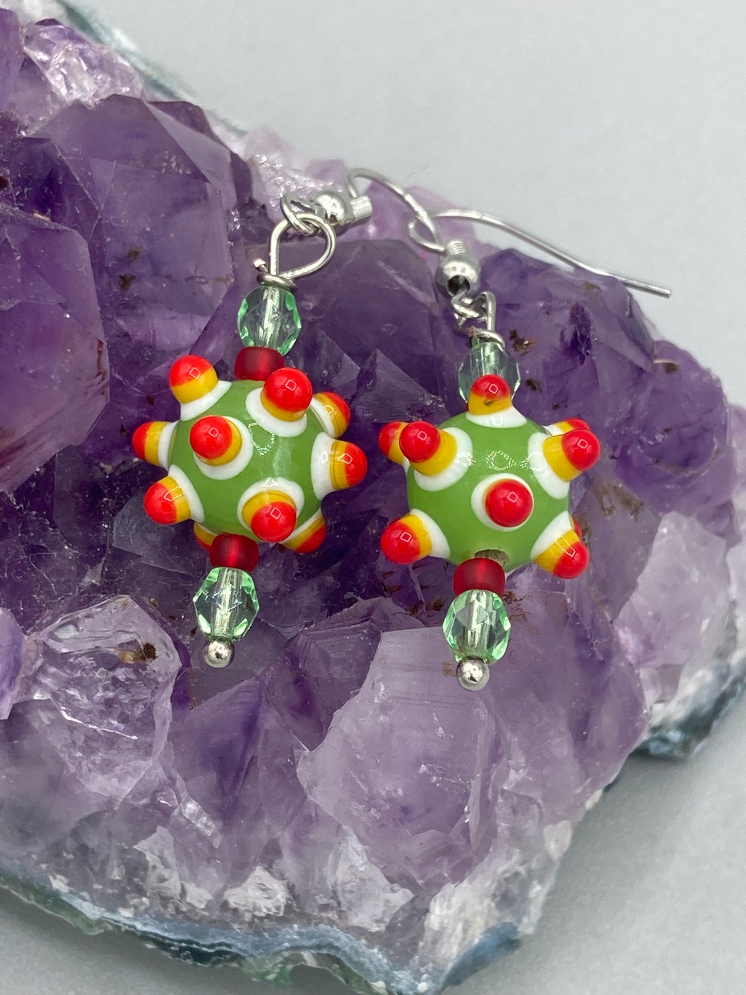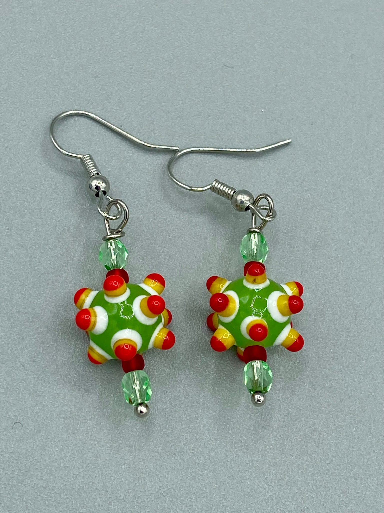 Vibrant, bumpy round lampworked glass beaded earrings in an array of colors including light green, white, yellow, dark red and bright orange. The fiesta piñata-shaped bead invokes a festive vibe, while its unique virus-shaped design promotes a bold statement. An eye-catching and unique piece of jewelry sure to turn heads.