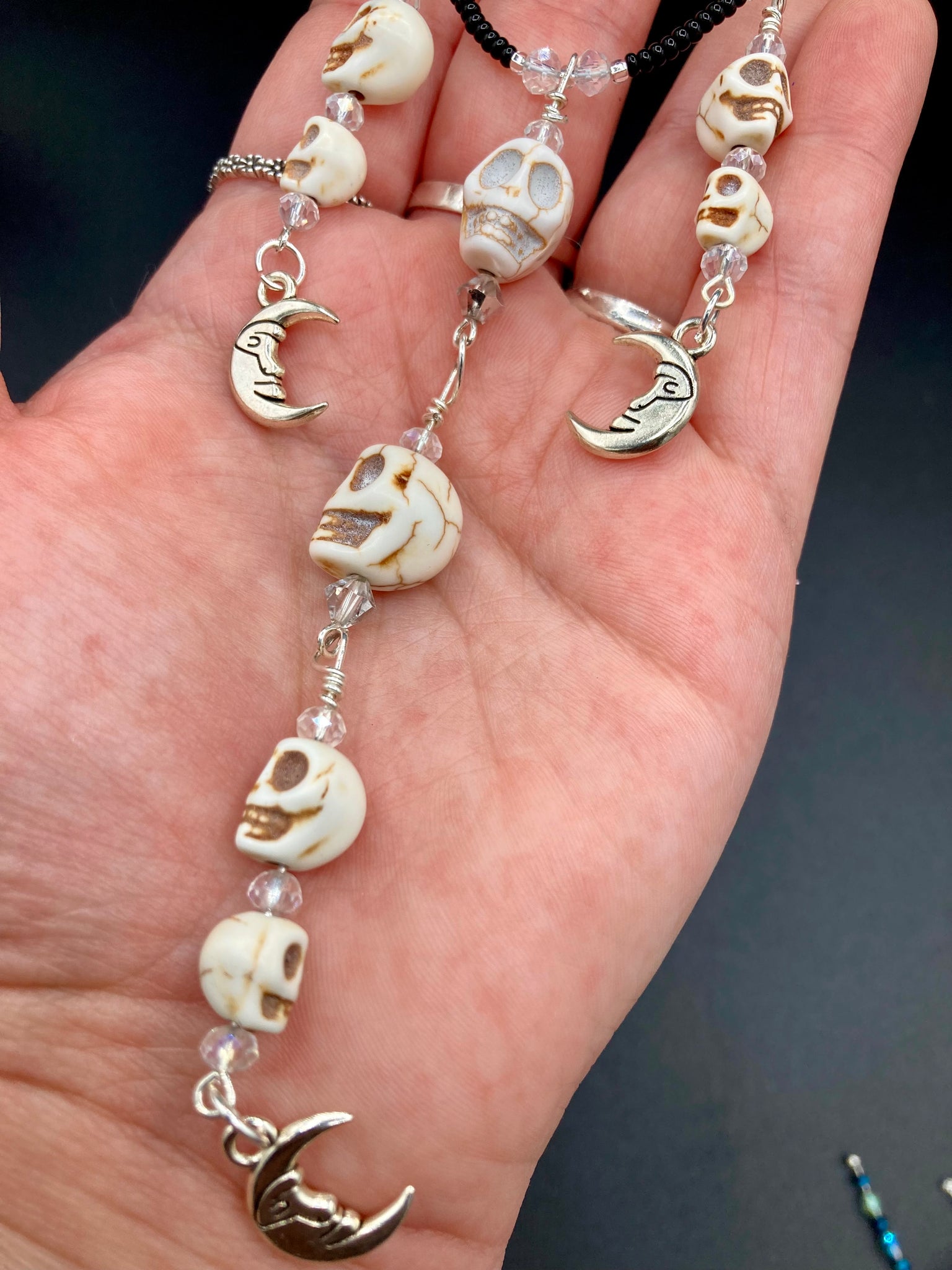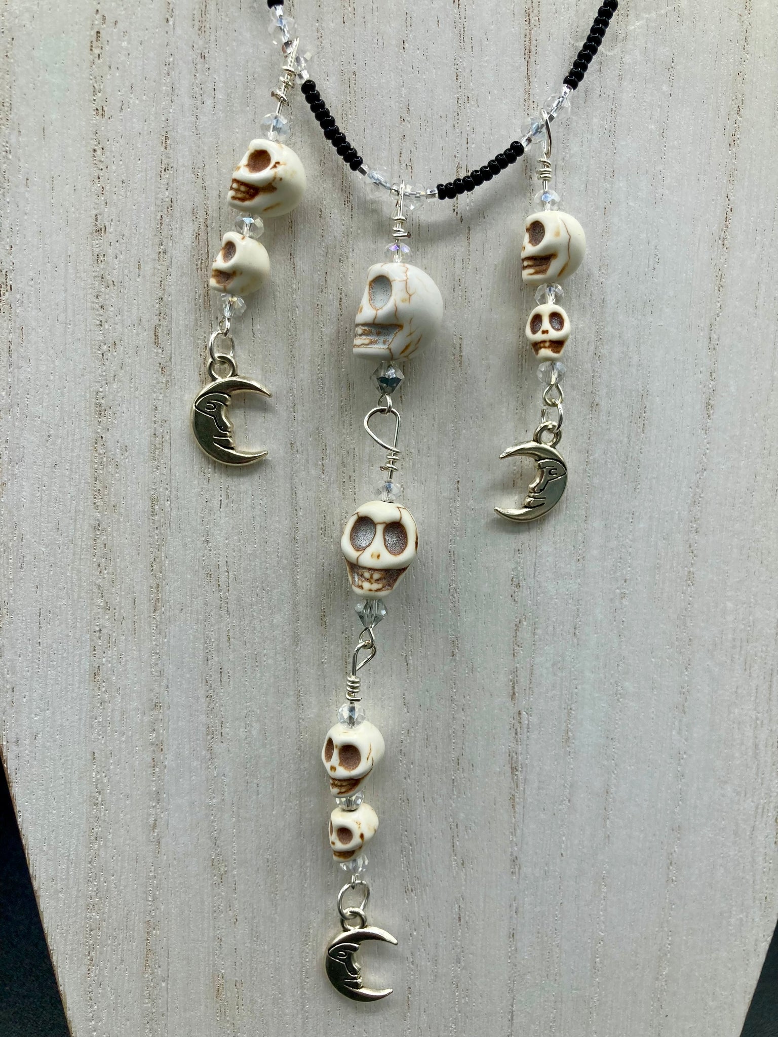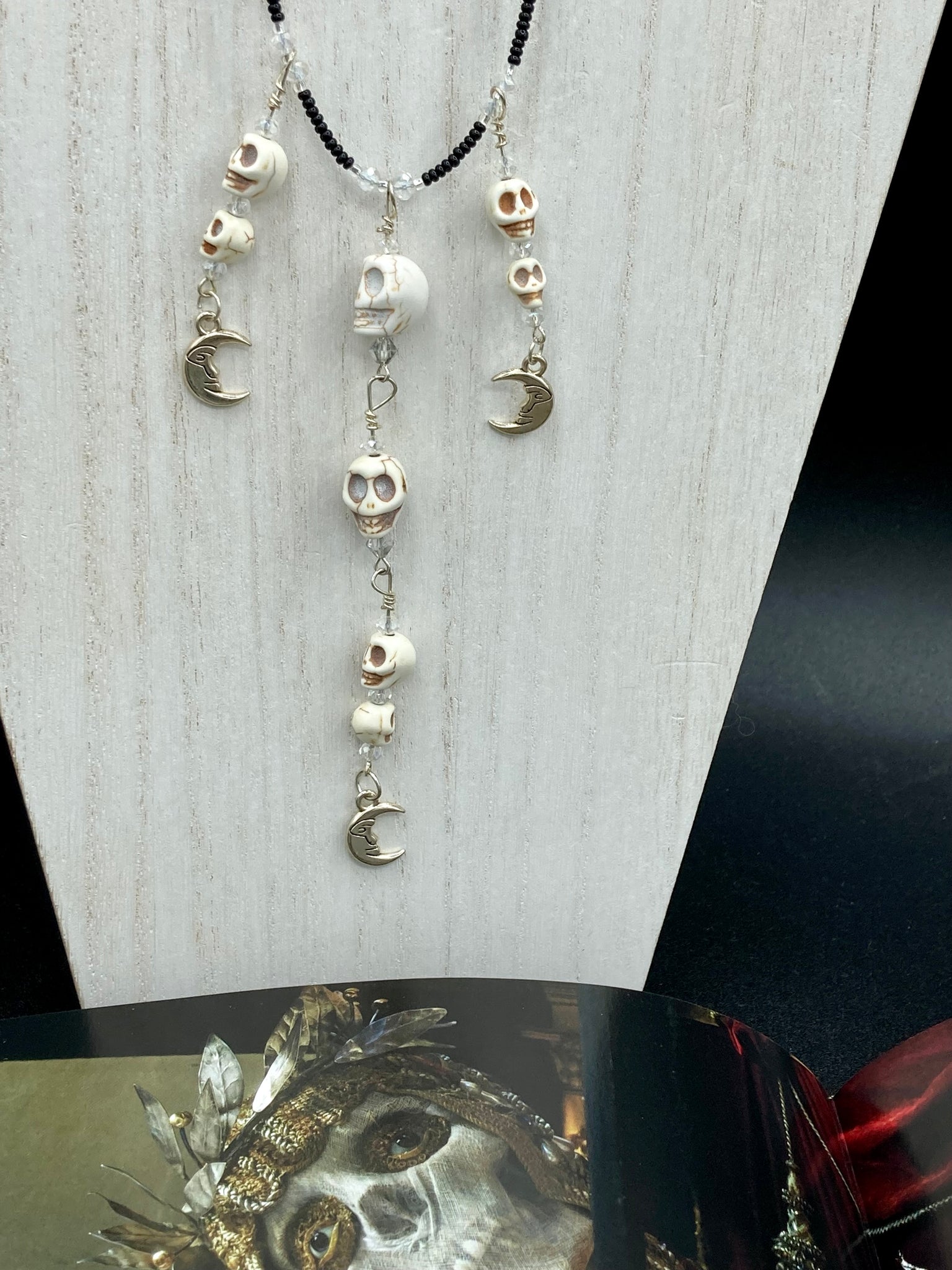 This exceptional necklace is sure to add a stylish flair to any look - perfect for anyone looking to stand out from the crowd. Featuring 3 strands of bold Howlite skull beads with smiling crescent moon charms, this massive, beautiful cascade of skulls is the ultimate statement piece for any jewelry collection. Goth, vampire goth, and dark witchy style all come together for an unforgettable aesthetic, allowing for versatile wear and an individualized touch.