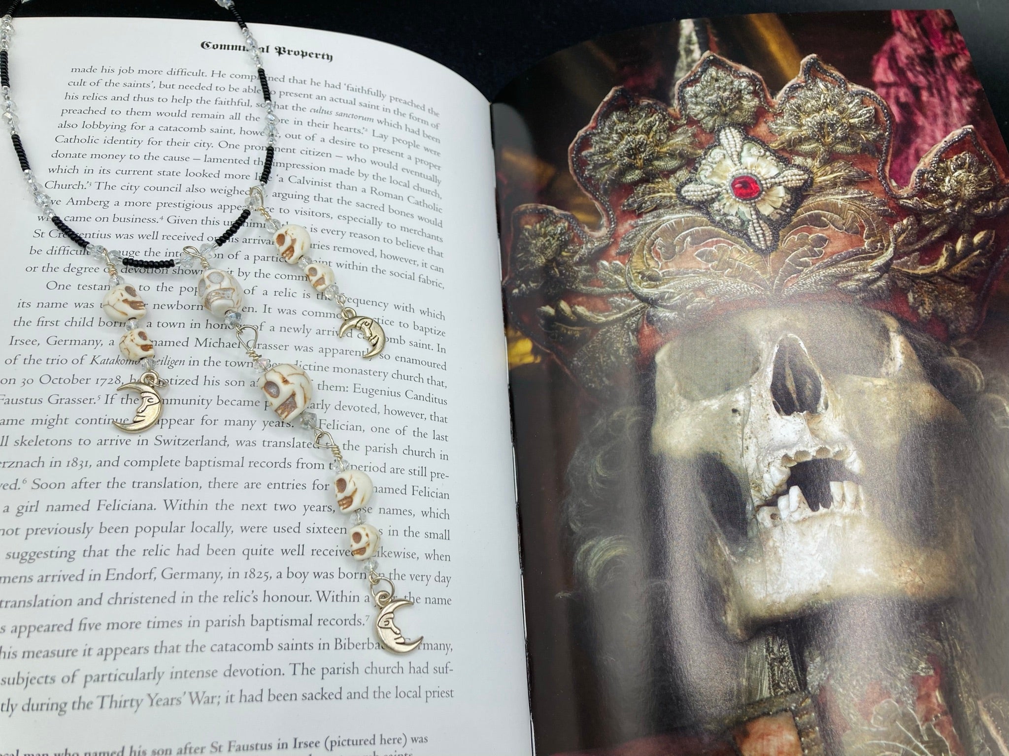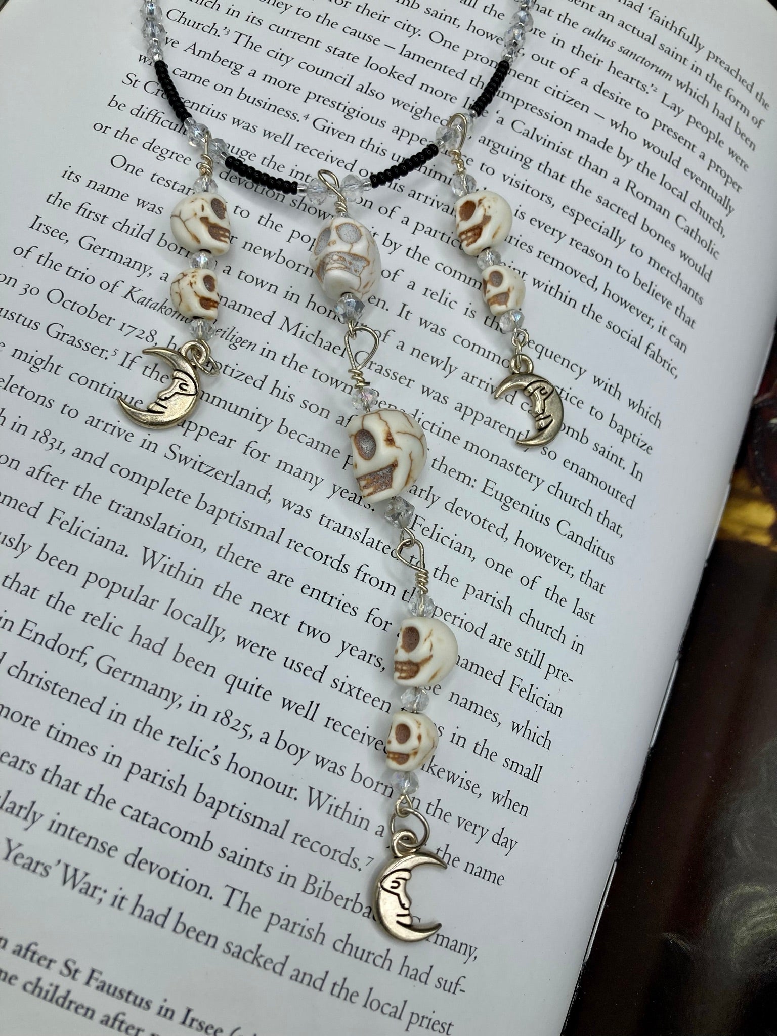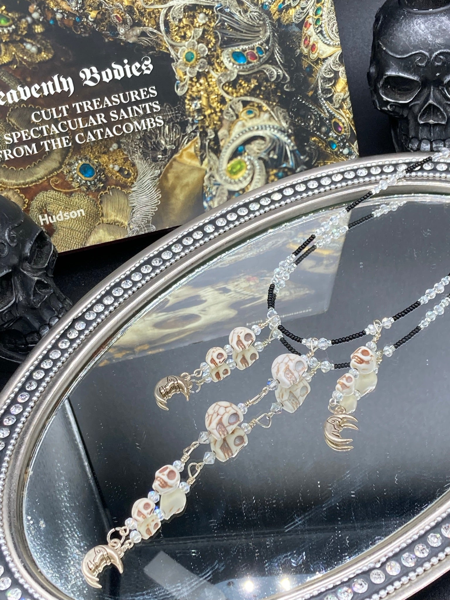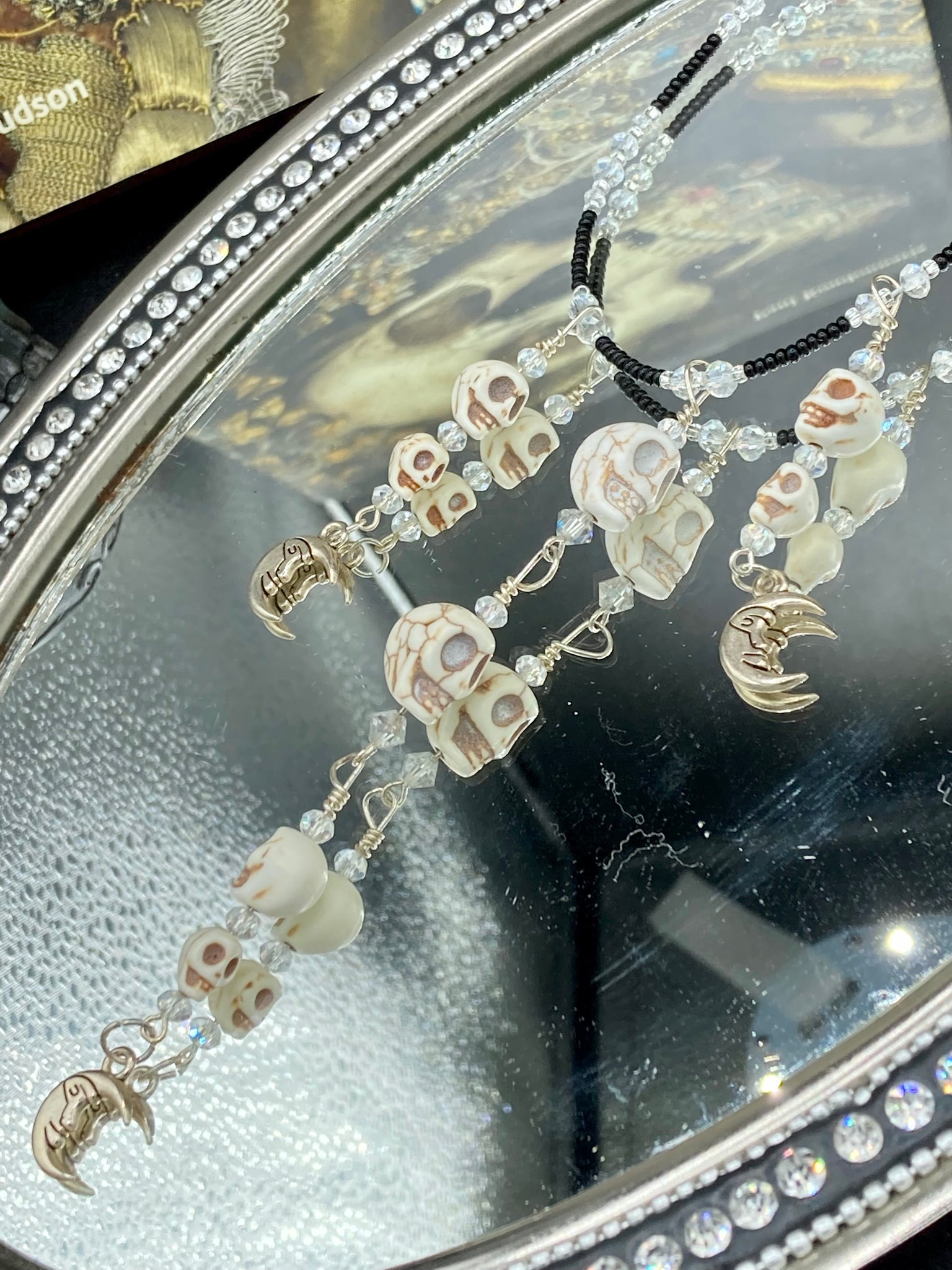 This exceptional necklace is sure to add a stylish flair to any look - perfect for anyone looking to stand out from the crowd. Featuring 3 strands of bold Howlite skull beads with smiling crescent moon charms, this massive, beautiful cascade of skulls is the ultimate statement piece for any jewelry collection. Goth, vampire goth, and dark witchy style all come together for an unforgettable aesthetic, allowing for versatile wear and an individualized touch.