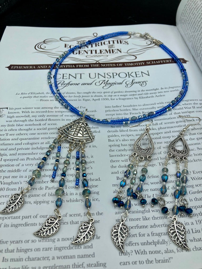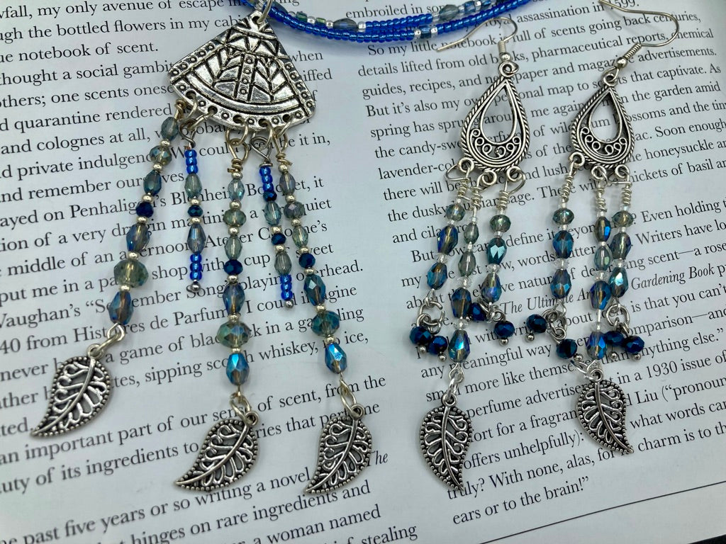 Blue Moroccan Inspired Large Chandelier Earrings. Three strands of beautiful blue and iridescent glass beads with intricate silver plated leaf charms create a lot of movement. Versatile, perfect for whimsical fairy princes, good witch, hippie nature lovers looks. These earring will compliment any look.