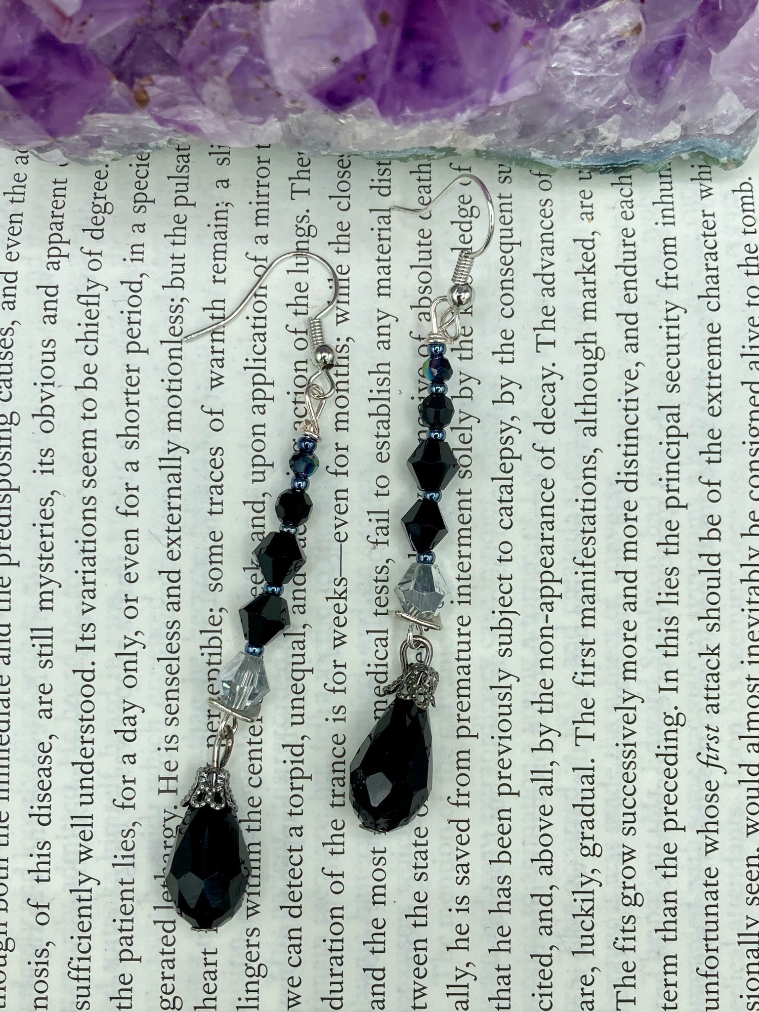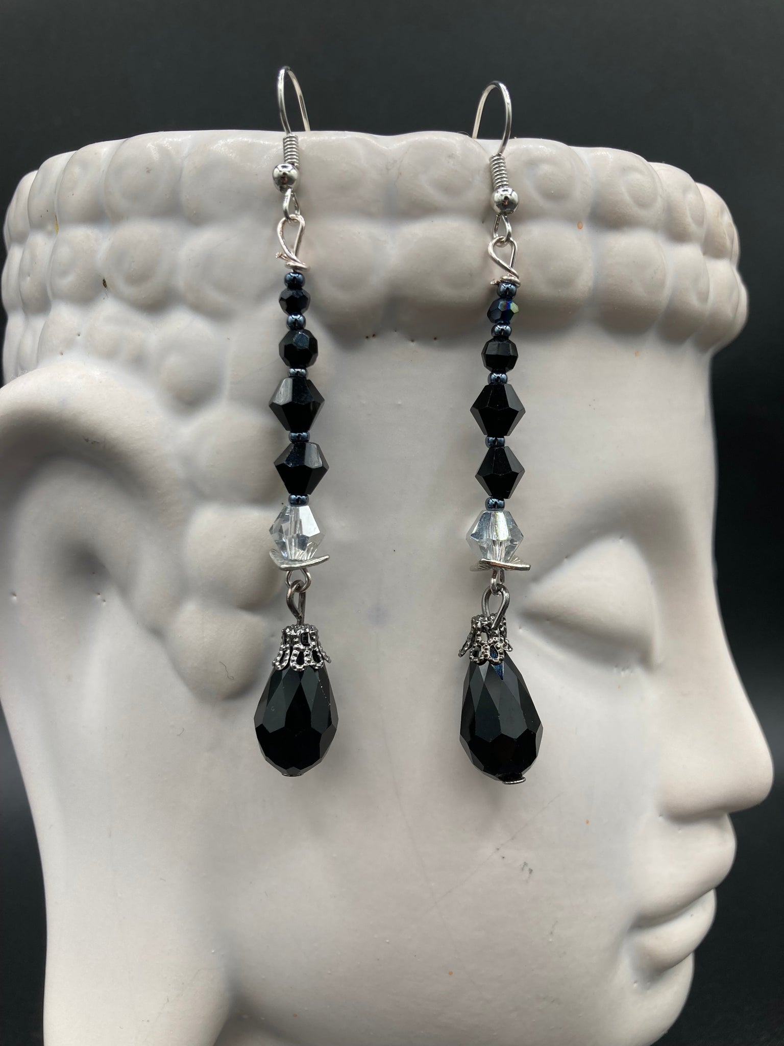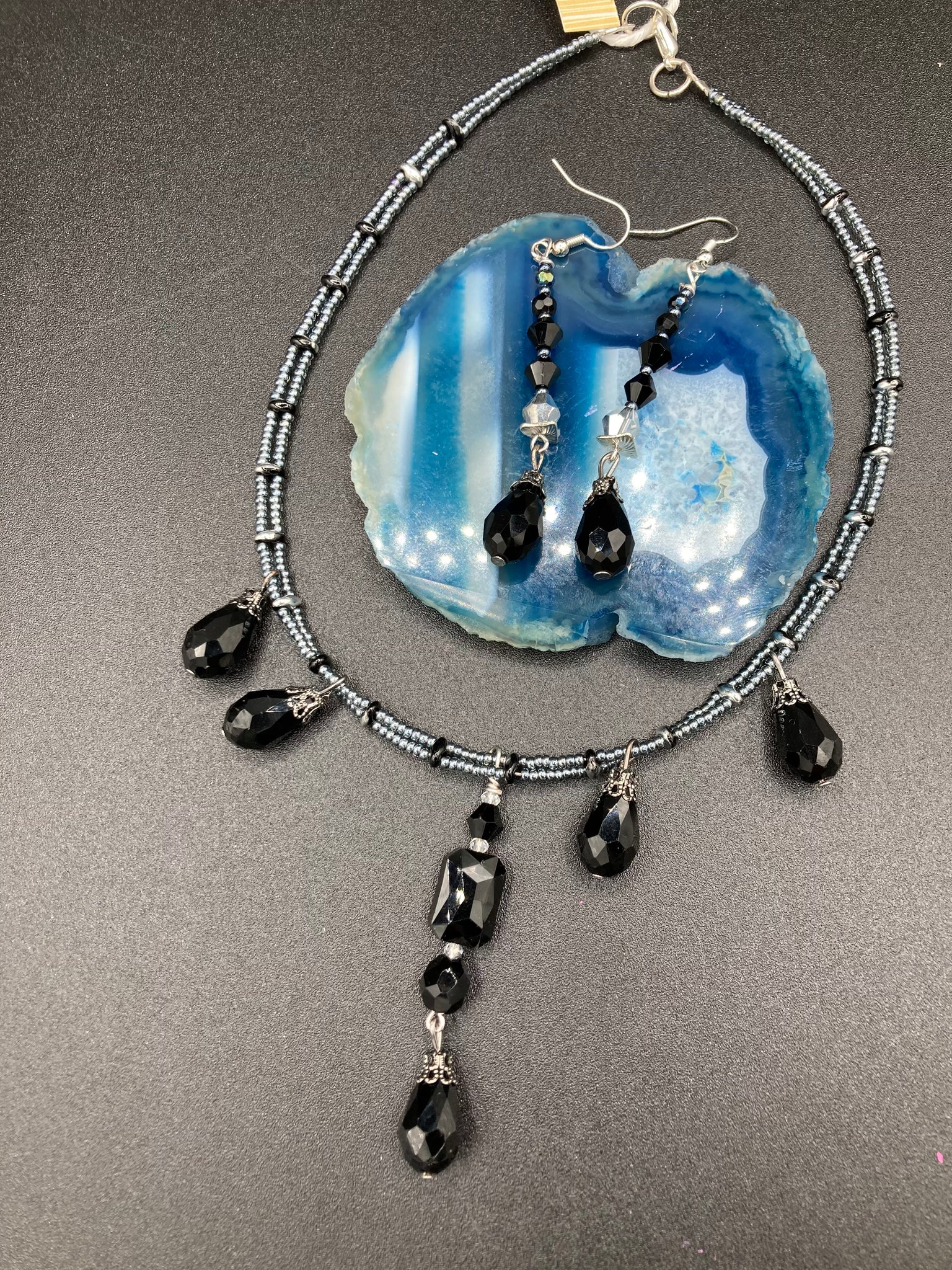 This adjustable collar-style necklace features silver and black glass beads in a combination of both teardrop and rectangular shapes, designed to create visual complexity and depth. The two strands are held together with two-hole silver and black beads, creating a stunningly bold and elegant draped collar that enhances any outfit.