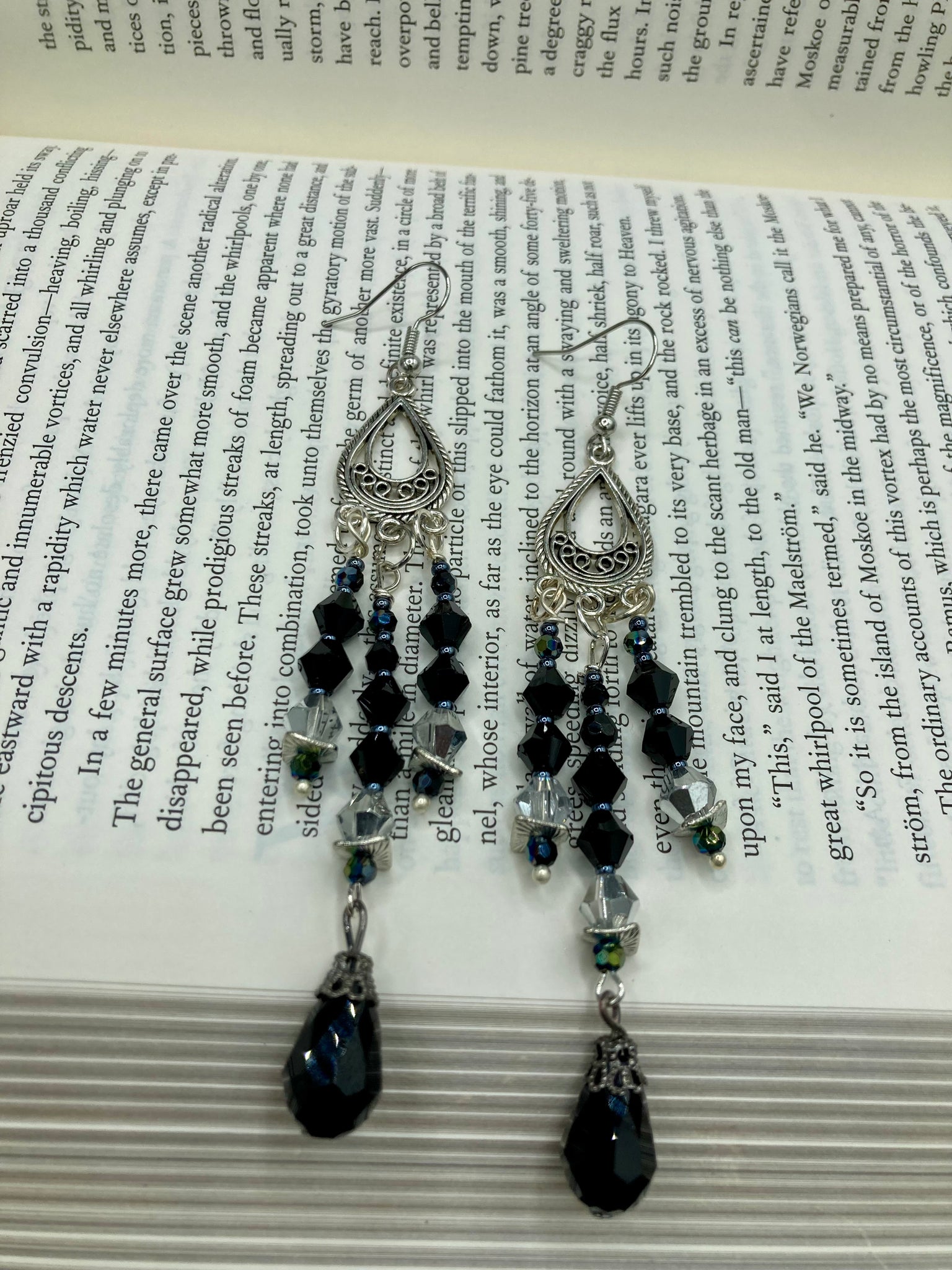 This stylish three-strand black and silver glass beaded earring design presents a beautiful dancing effect, boasting a large black teardrop glass bead. A versatile accessory, it suits a variety of ensembles from cocktail chic to wedding fineries, and its minimalist aesthetic lends a modern charm.