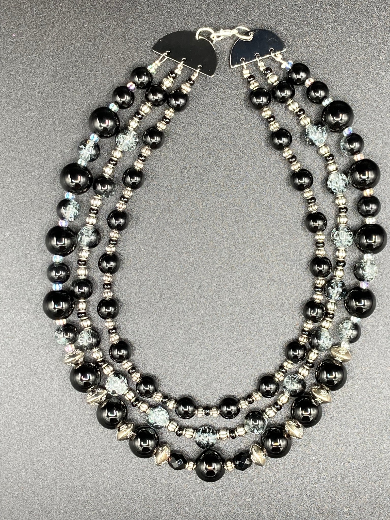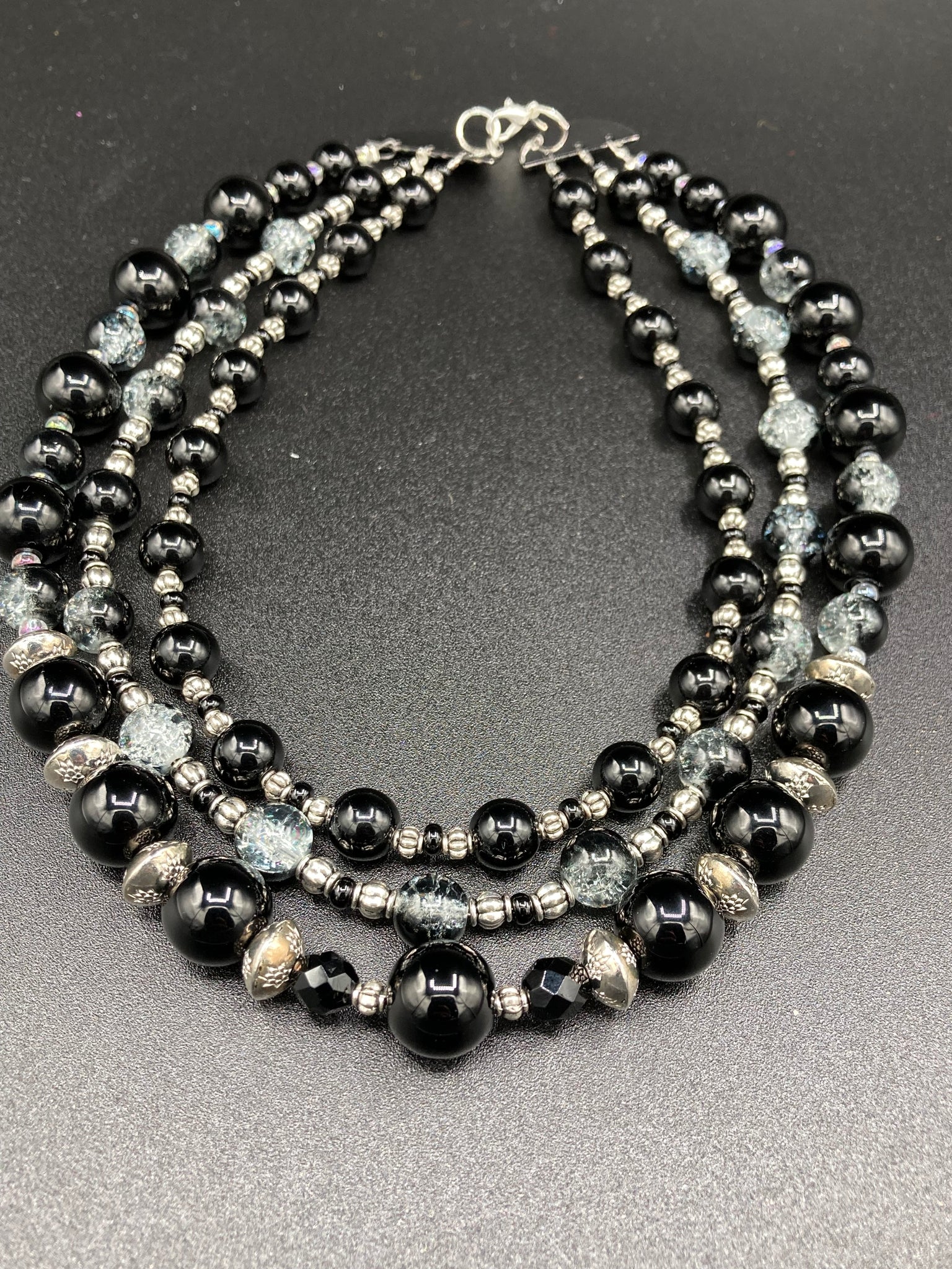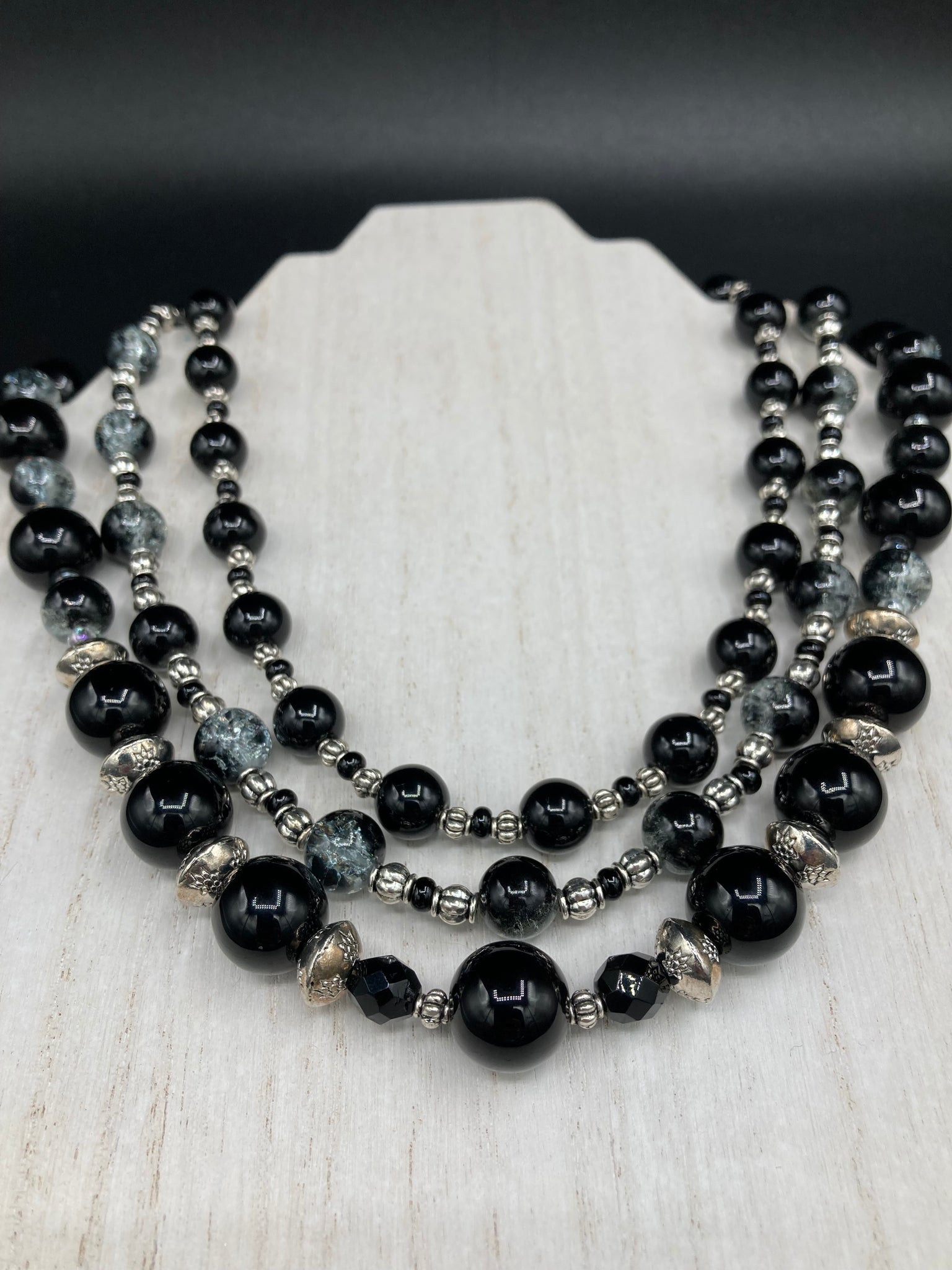 This stunning Shimmery black glass and floral metal beaded necklace features three long strands which gracefully drape around the neck. Its bold elegance is the perfect accessory for a cocktail chic outfit, a wedding, or a more minimalist look.