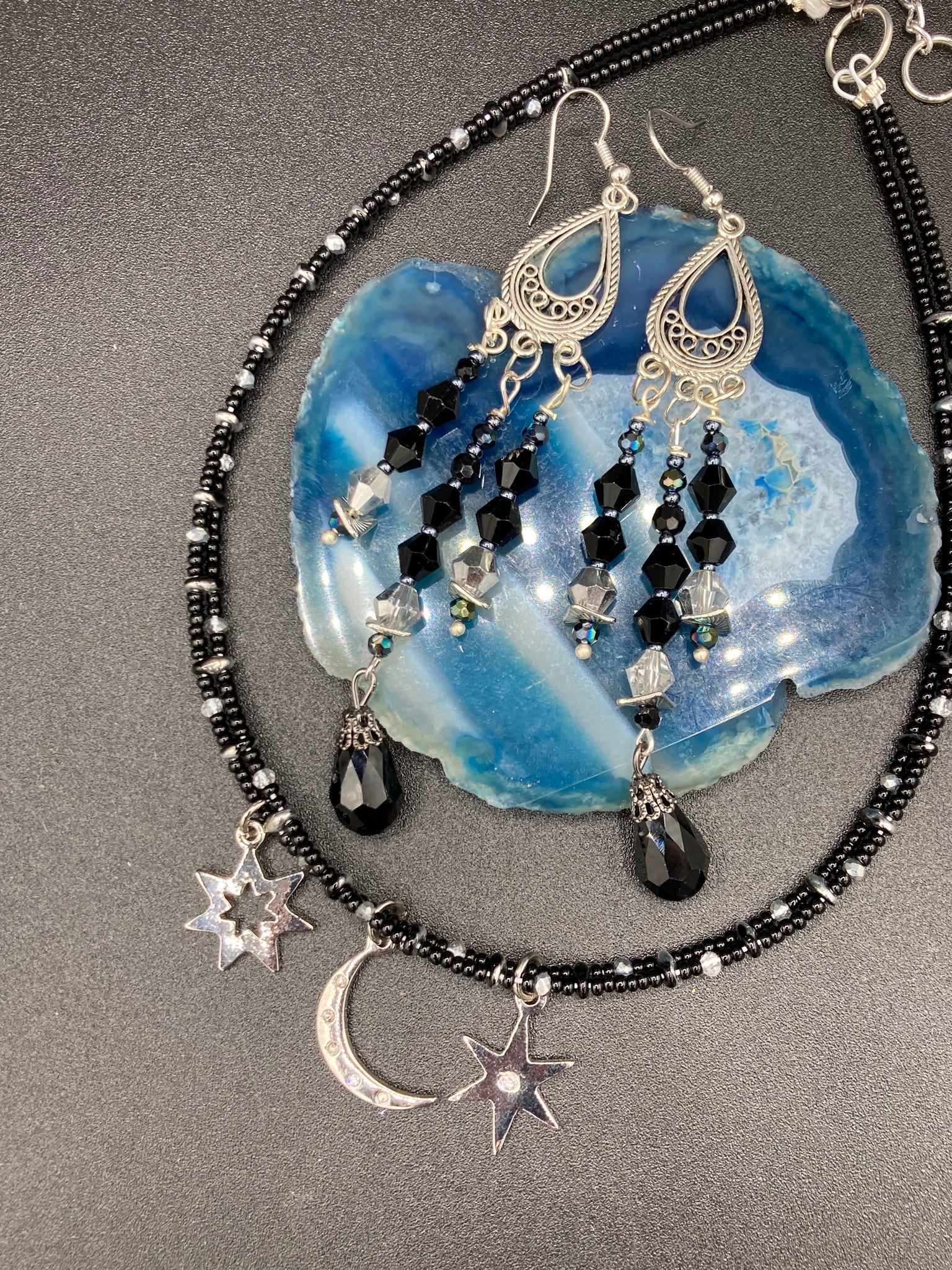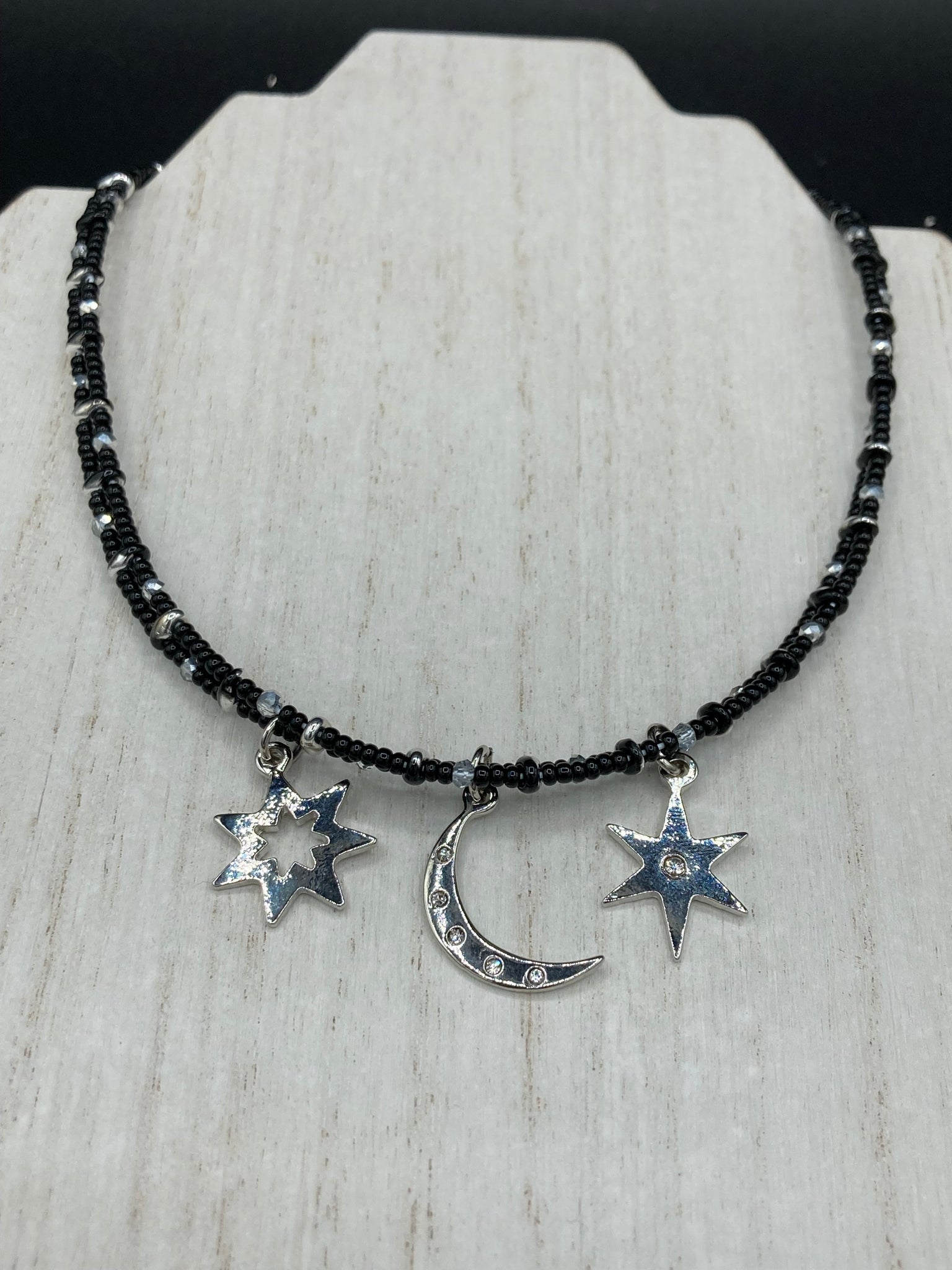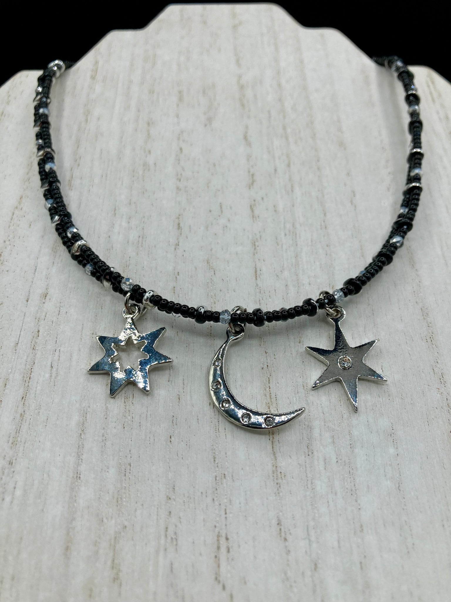 Whimsical Celestial Crescent Moon And Stars Collar Stye Adjustable Glass Beaded Necklace. Two strands are held together with double-hole black and silver beads to keep a collar shape. This necklace beautifully drapes across your neck, a fierce, bold and elegant piece of jewelry. Perfect for Goth, Witchy, and Stardust Celestial Styles.