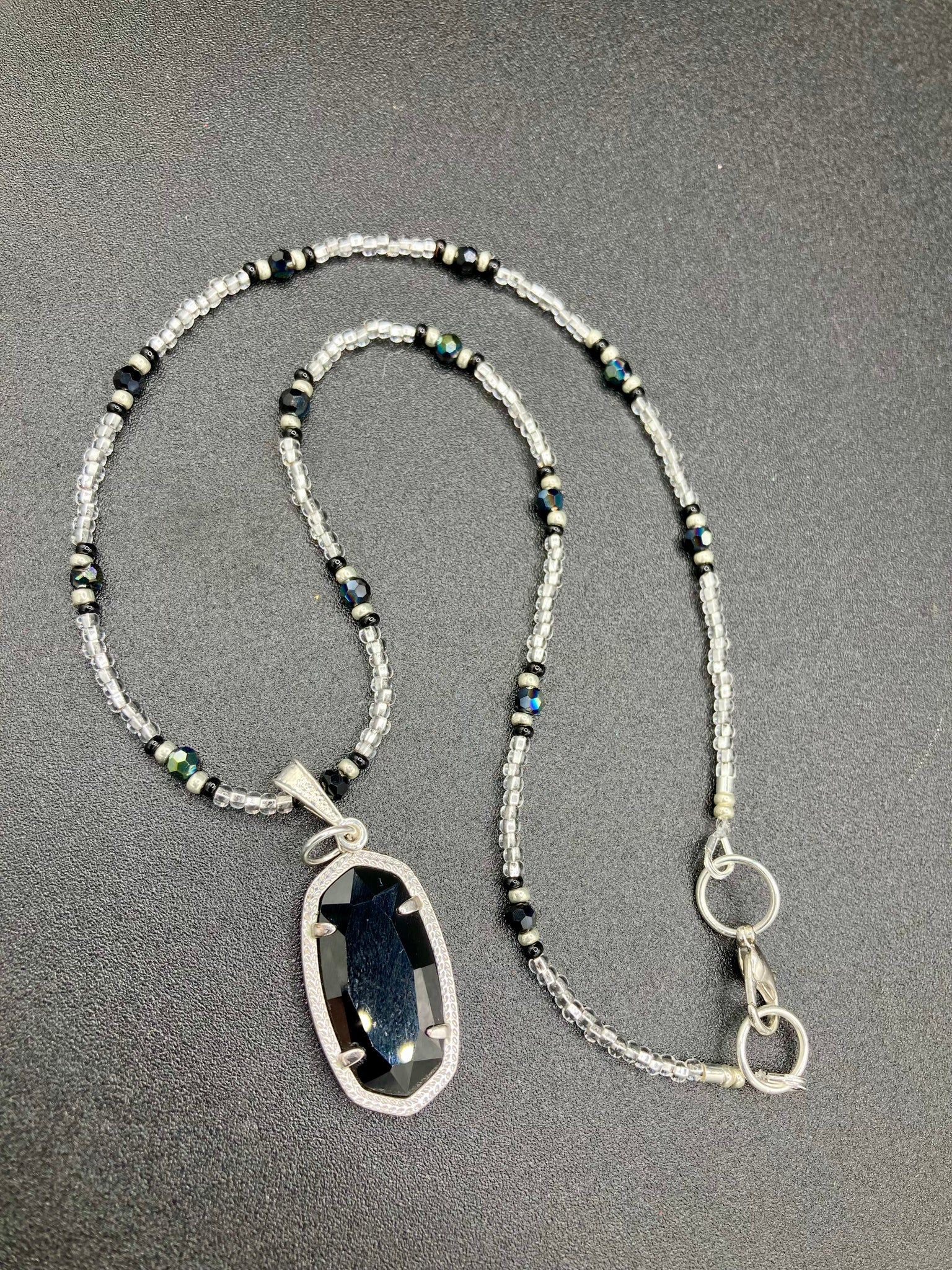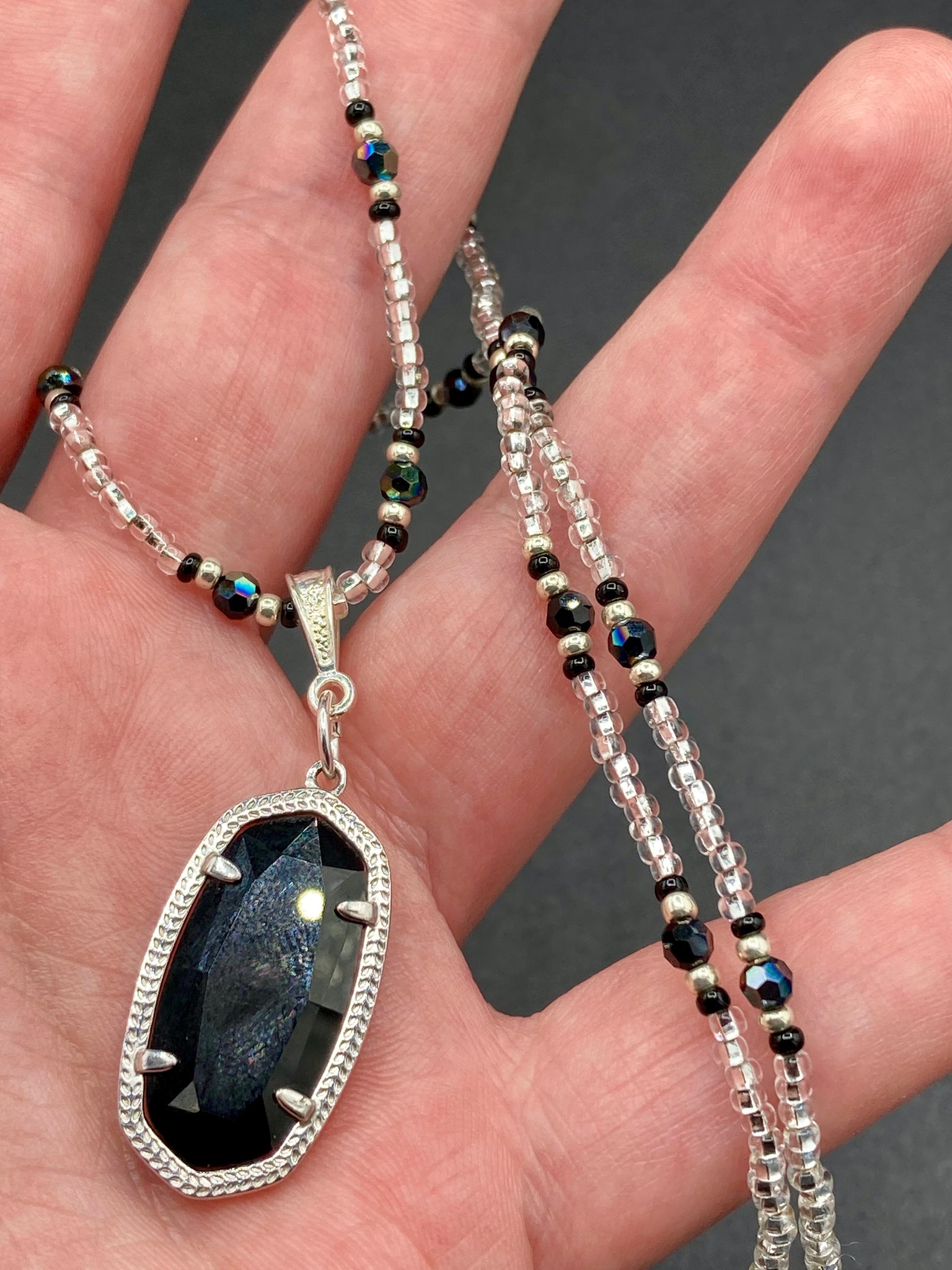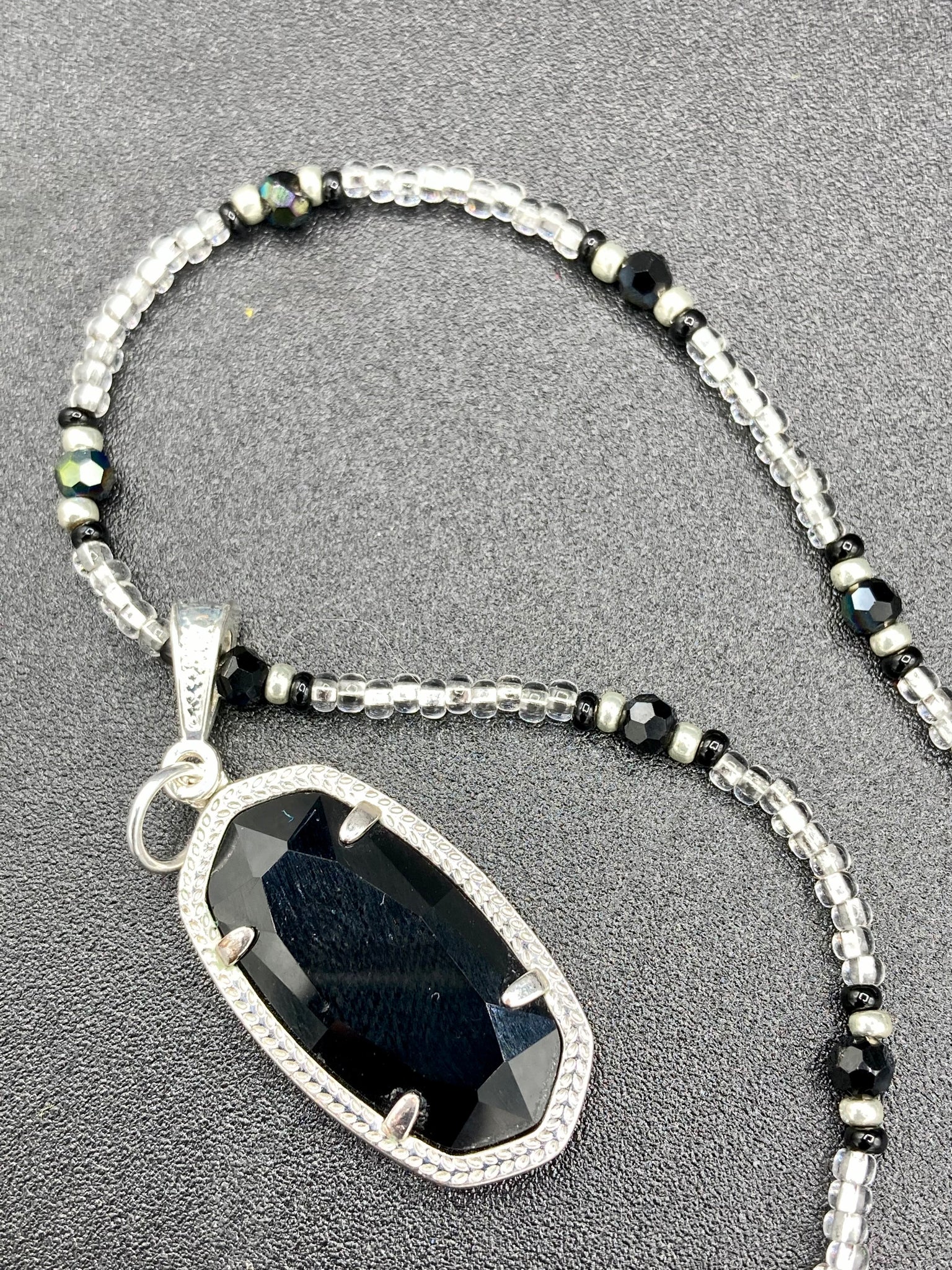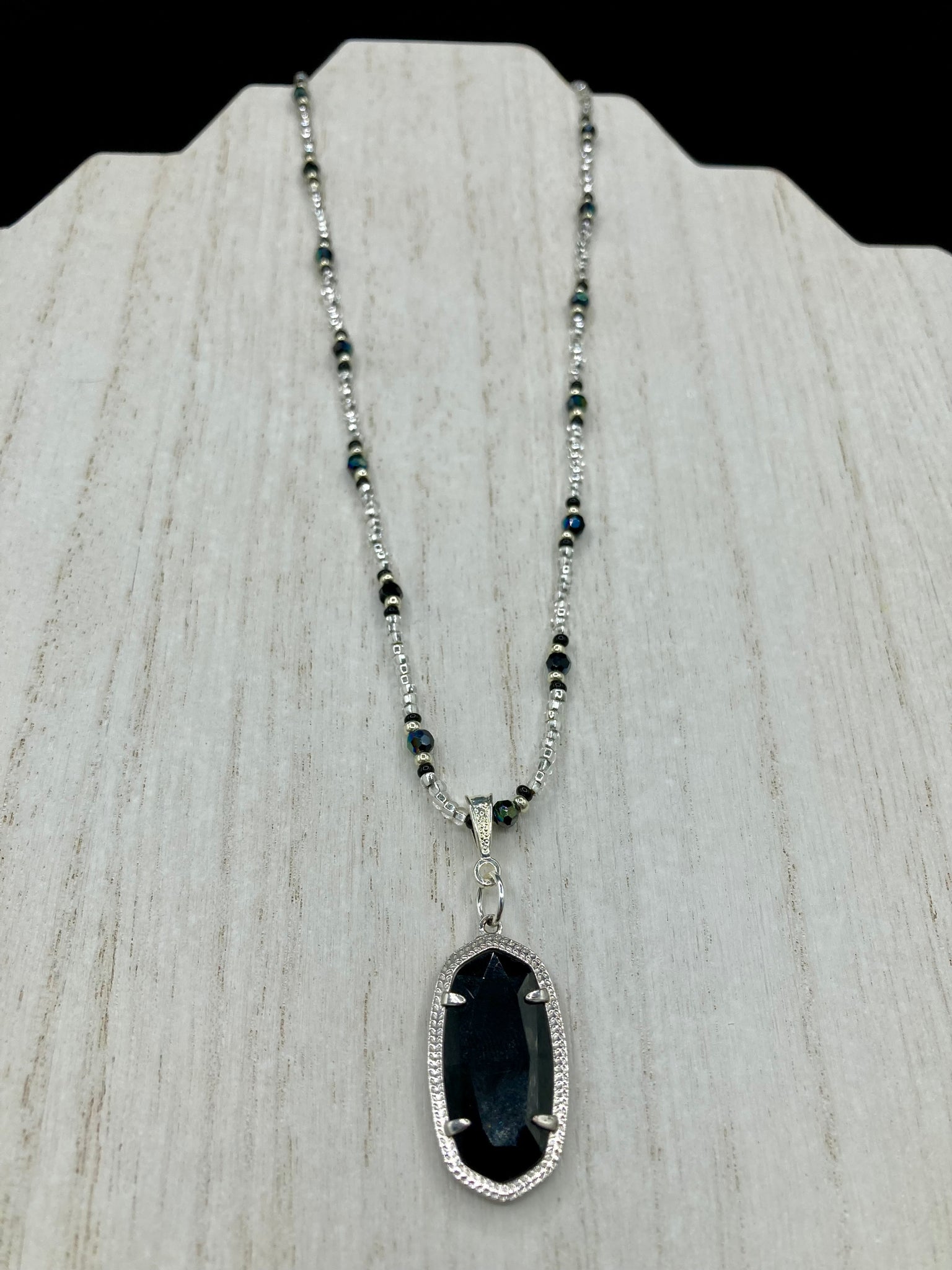 This dainty necklace is full of black and silver shimmery glass beads. A length black oval shaped glass bead hangs low to add length to this necklace. It's the perfect necklace to add a little elegance to any outfit. Will go with any outfit, dress it up or down, this necklace will complete any look. This beauty is a must-have, add it to your jewelry collection.