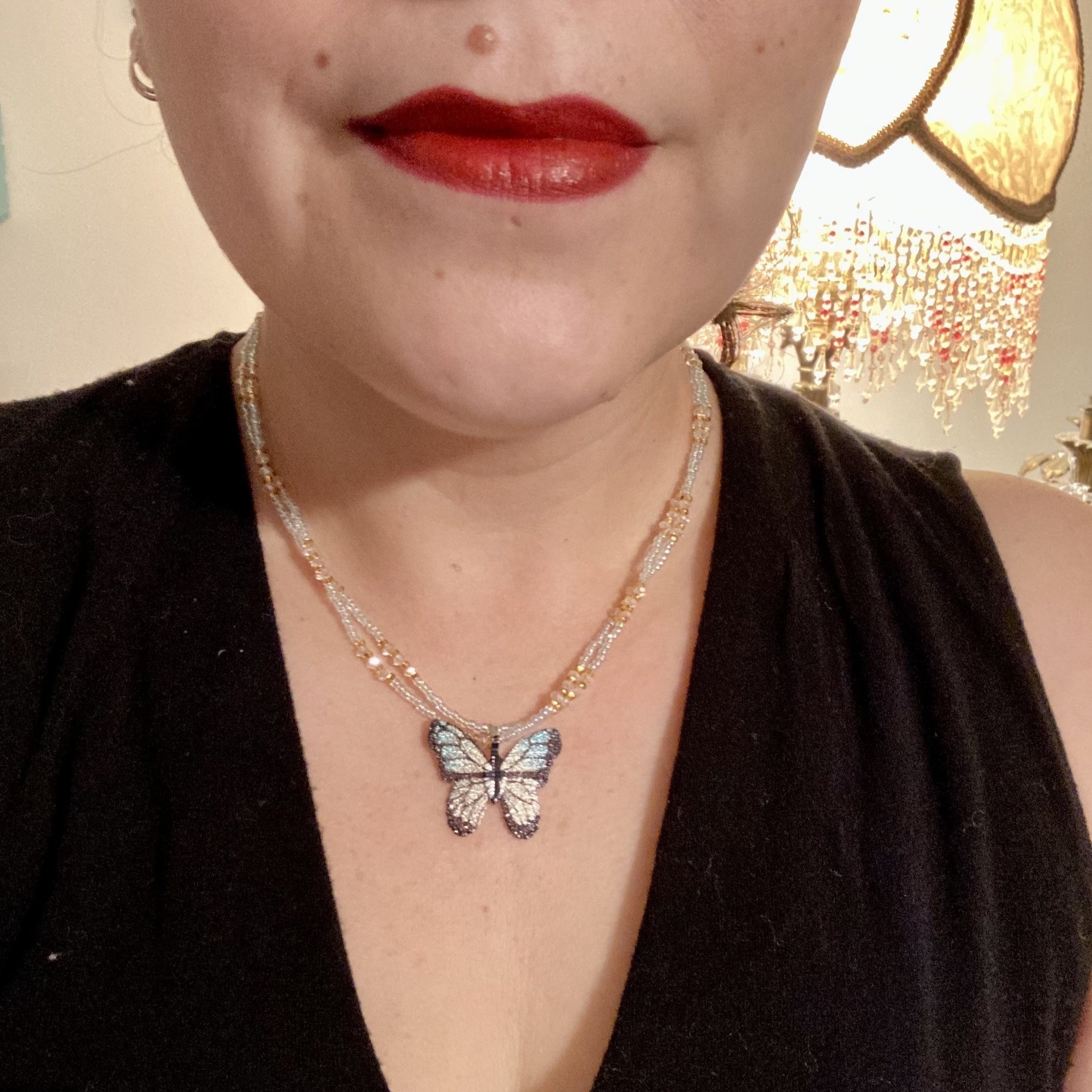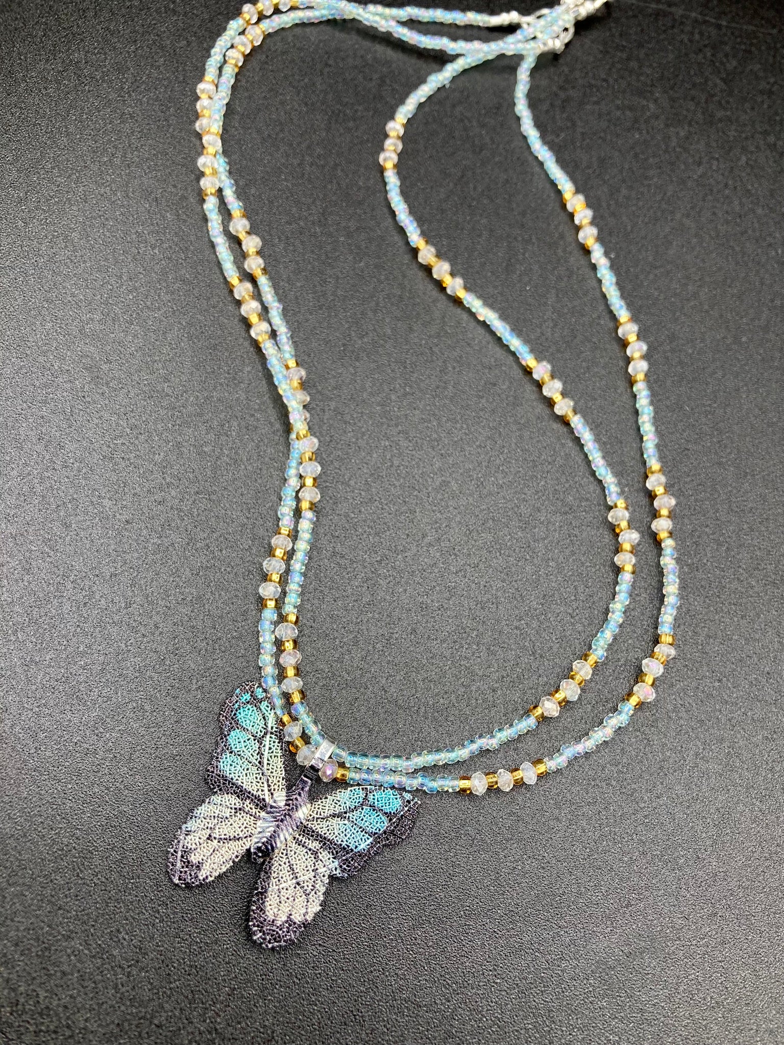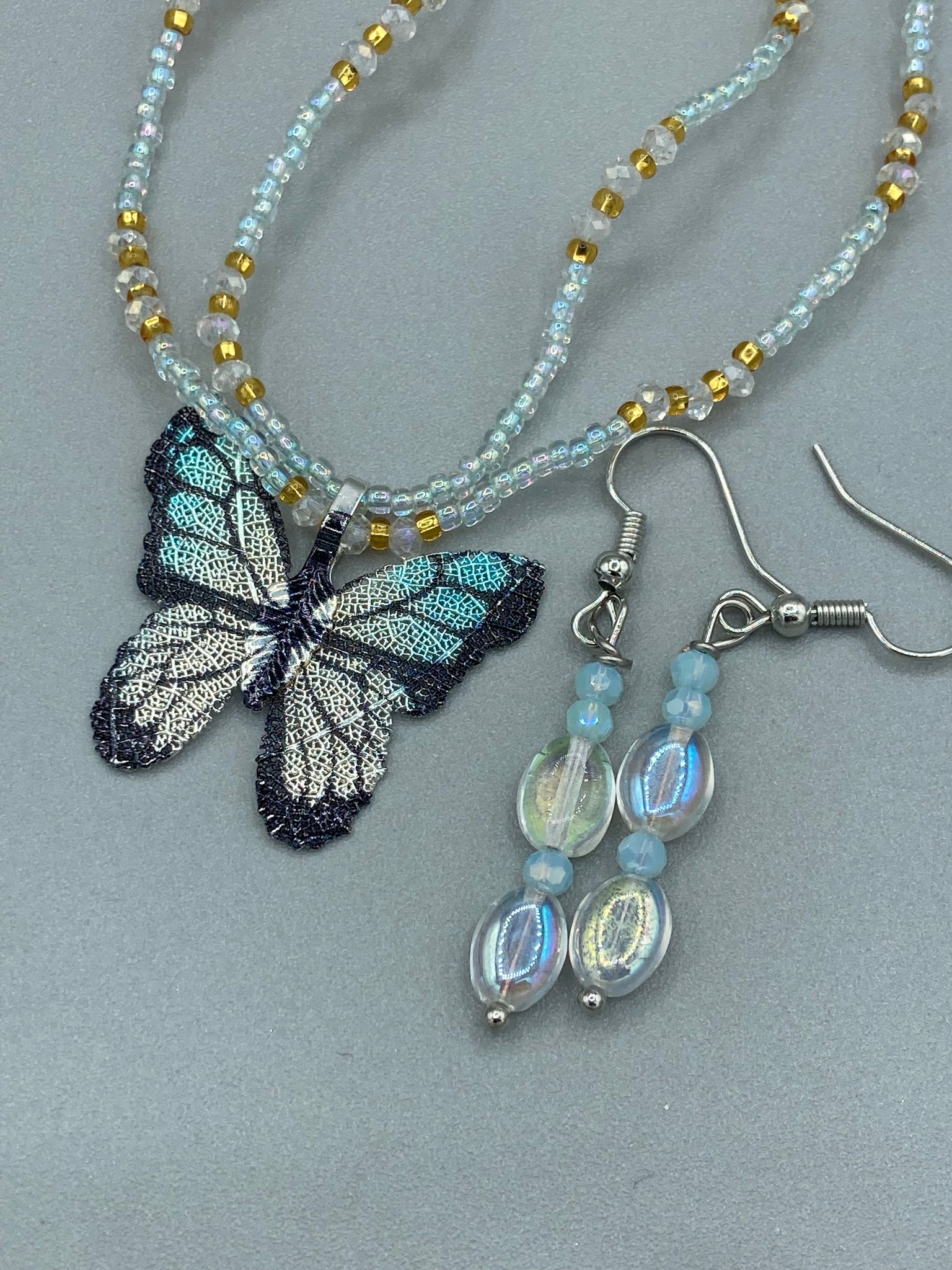 This precious sterling silver pendant features a hand-crafted butterfly whose wings have been artistically molded from a basil leaf and painted in a trio of light blue, silver, and gold hues. Accompanying the butterfly pendant are two glass beaded necklaces in an alluring combination of light blue, gold, and medium-small clear glass beads. A stunning summer accessory.