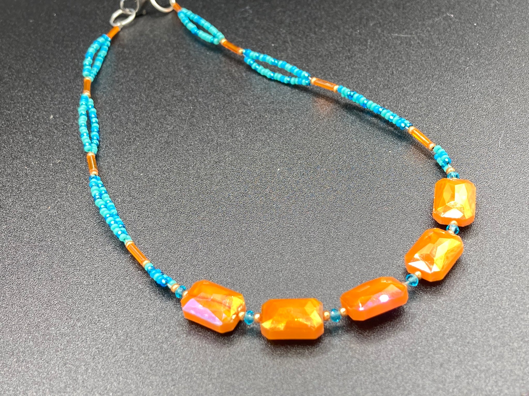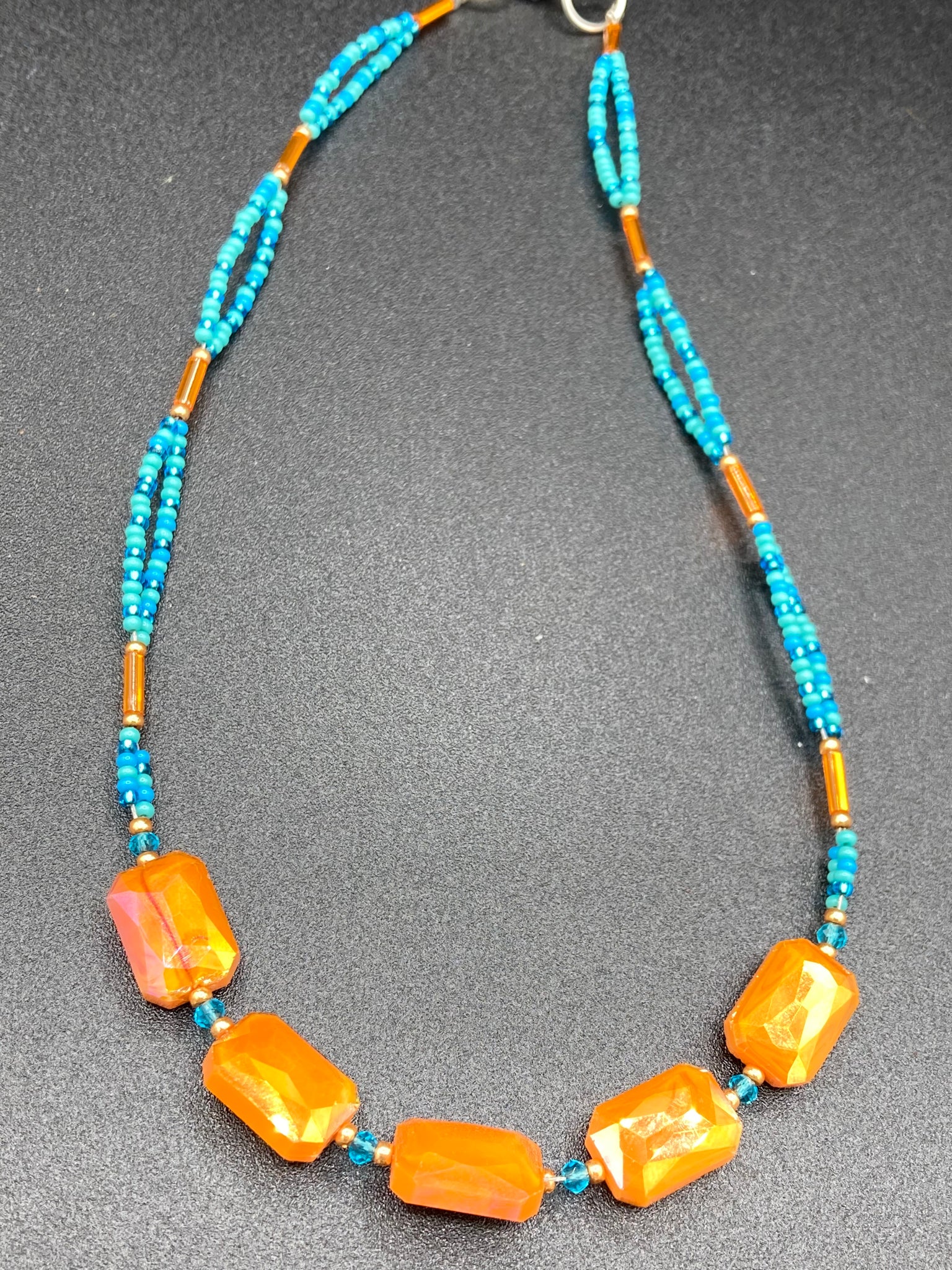 Super shimmery, vibrant, bold double strand necklace was created by using a blue turquoise and rectangular faceted orange glass beads. This dramatic look is perfect for a summer look, it will compliment any outfit.