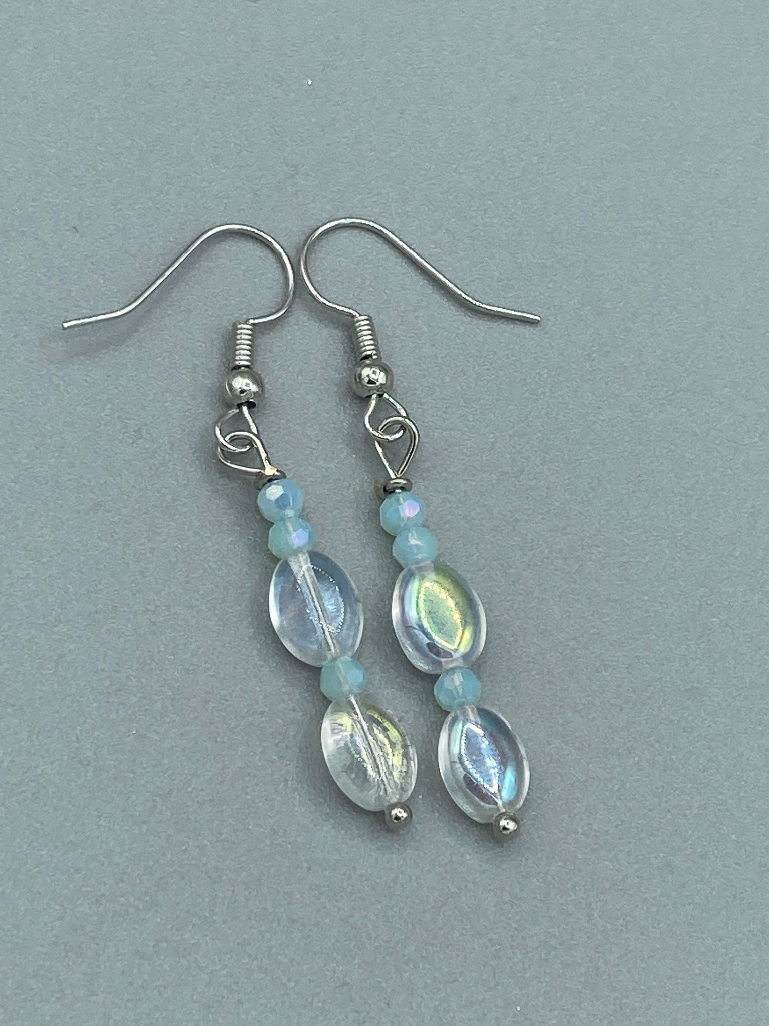 Elevate your style with these simple yet dainty beaded earrings boasting a gentle iridescent and frosty light blue hue. Perfectly versatile, they will add a refined touch to any outfit.