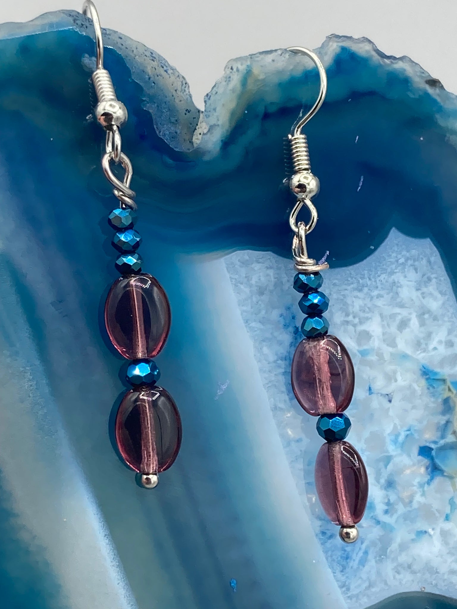 These dainty earrings feature a combination of light purple and dark blue glass beading for a sophisticated, versatile look. Perfect for a chic aesthetic, these earrings can easily complement any outfit.