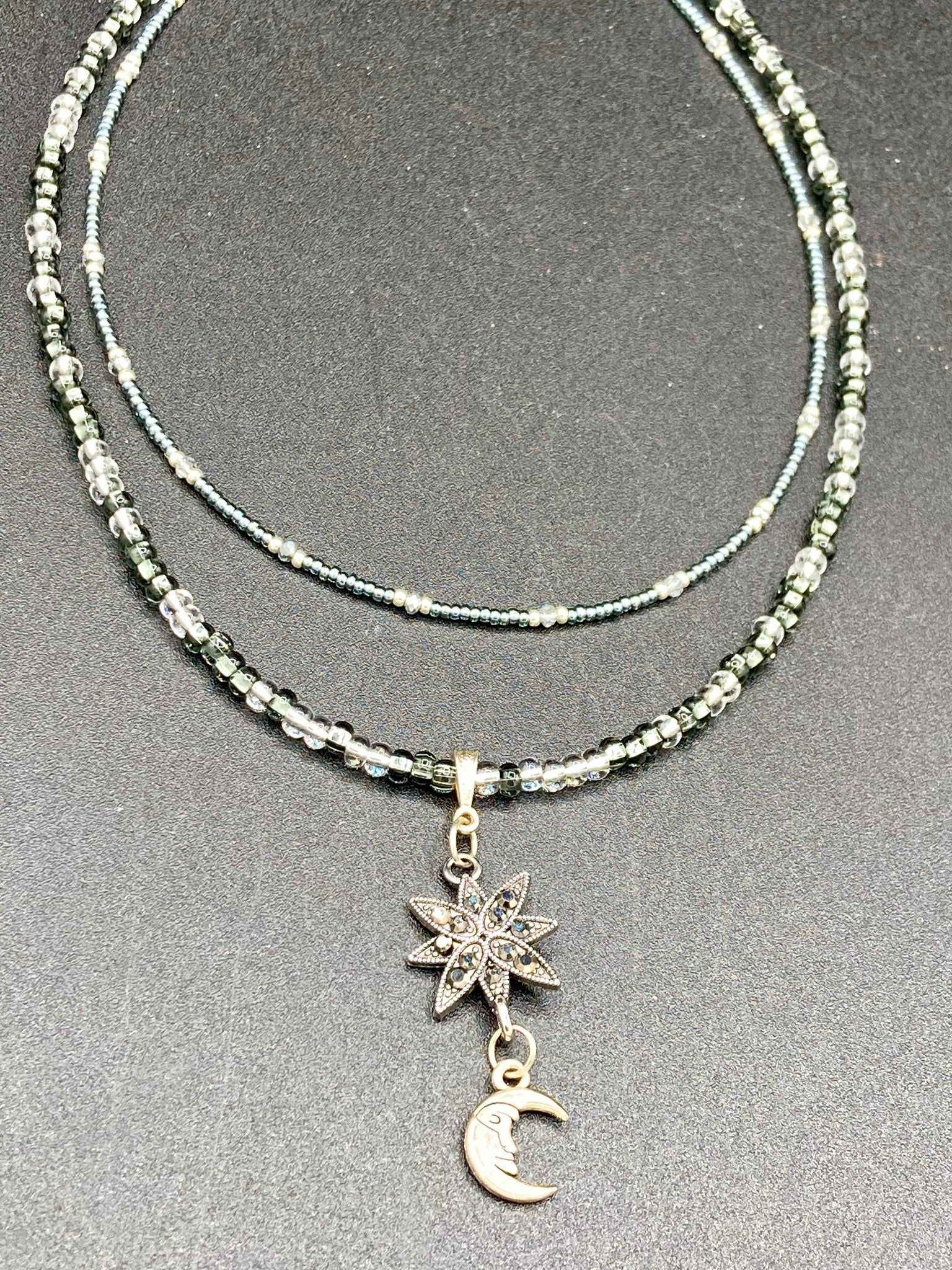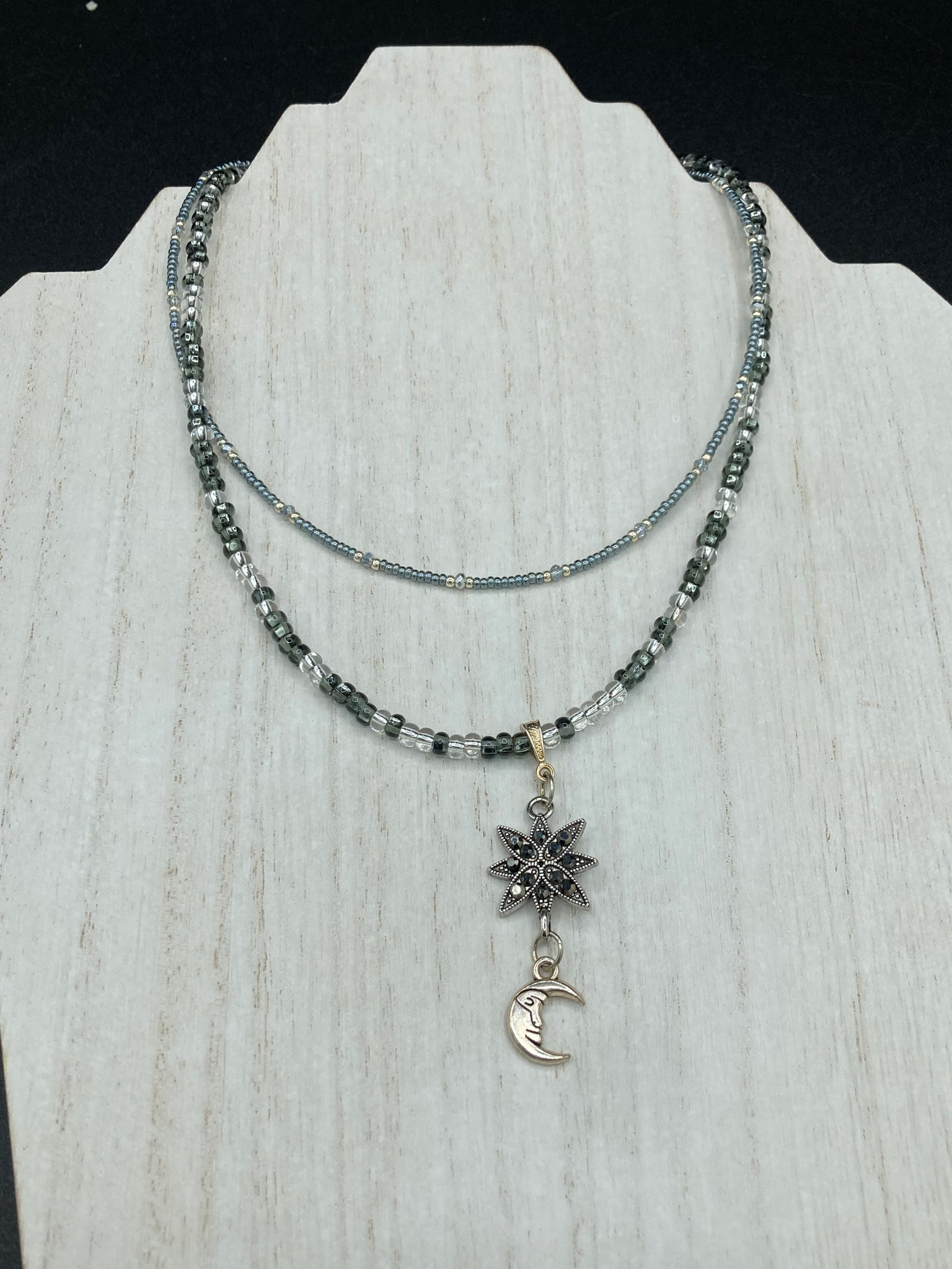 This Dainty Smiling Crescent Moon And Star Silver And Gray Choker Style Necklace features a variety of shimmering glass beads in light silver and gray tones. Varying in shape and size, these beads lend a unique and witchy celestial vibe to the necklace.