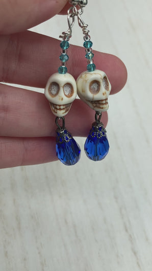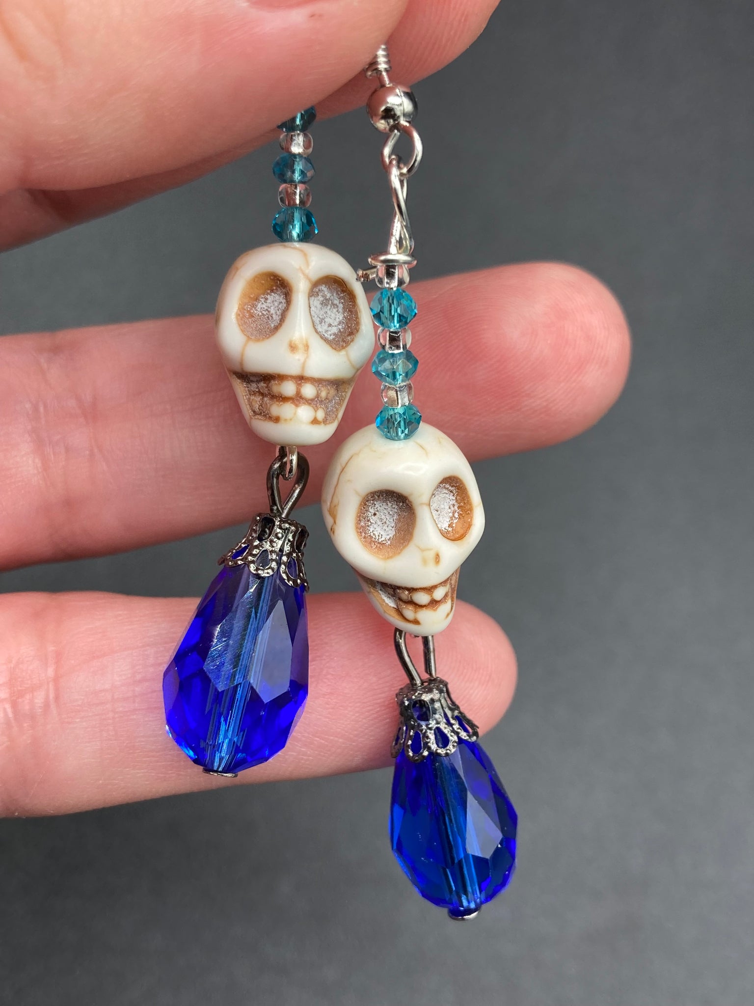Mini Howlite Skull Bead Earrings and large bright blue teardrop shaped glass bead for major shimmery movement. Ultimate Chingona, Cabrona, Latina Chicana, Goth, Vampire Goth, Dark Witchy, La Bruja Style. You can dress these up or down, it will definitely give your outfit a unique look.