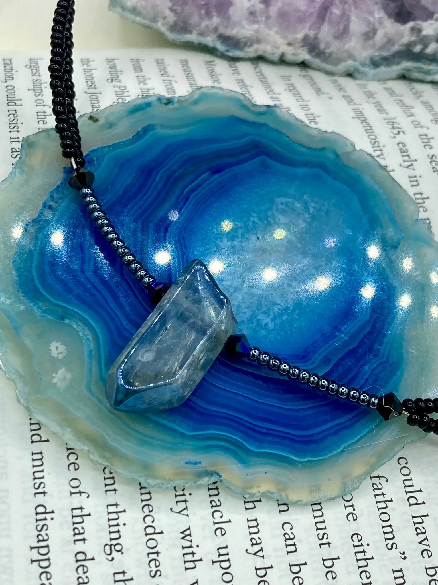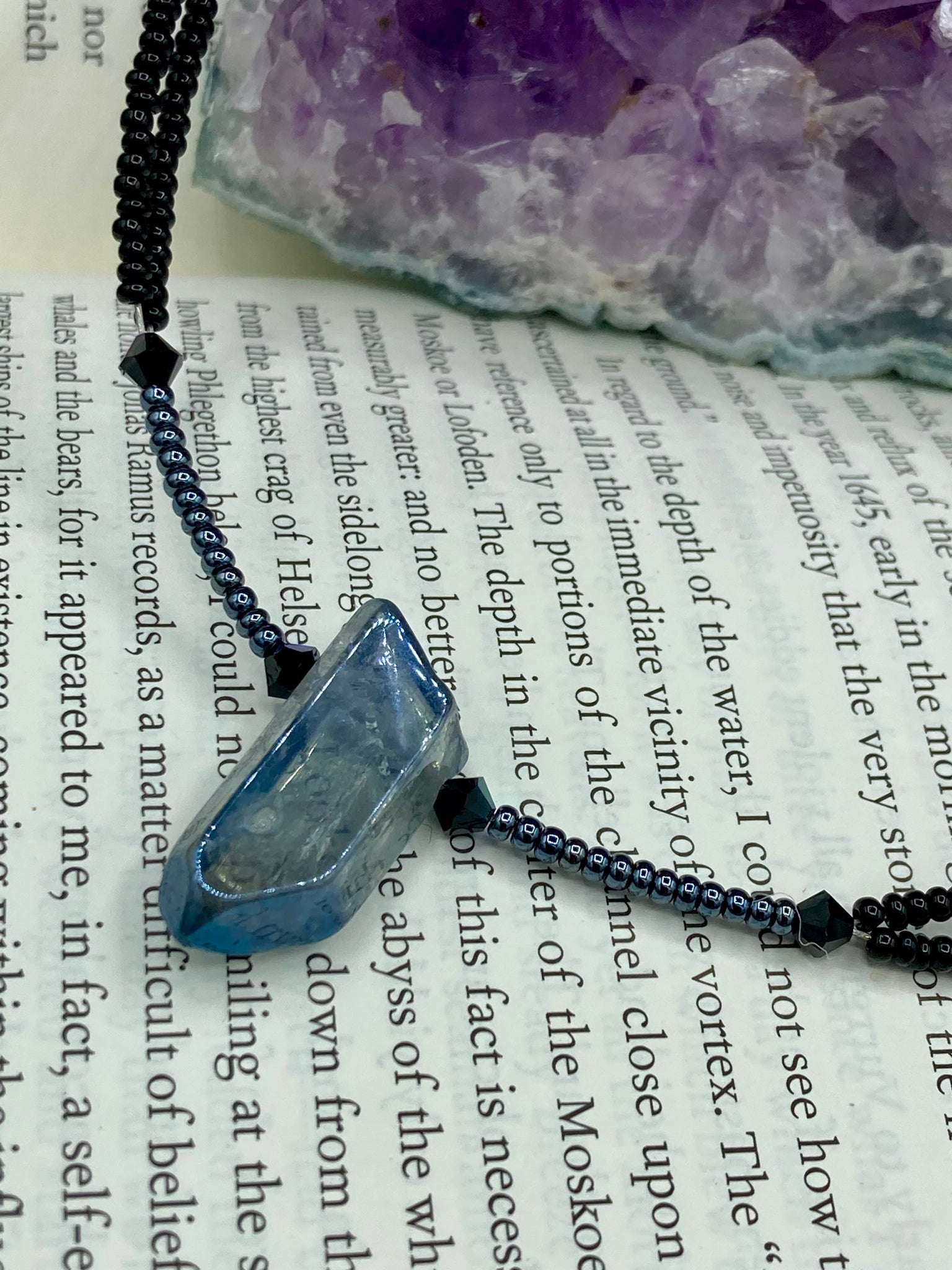 This stunningly elegant double strand necklace features a luster blue crystal stone nugget, creating a sophisticated, yet dainty look that beautifully drapes across the neck.