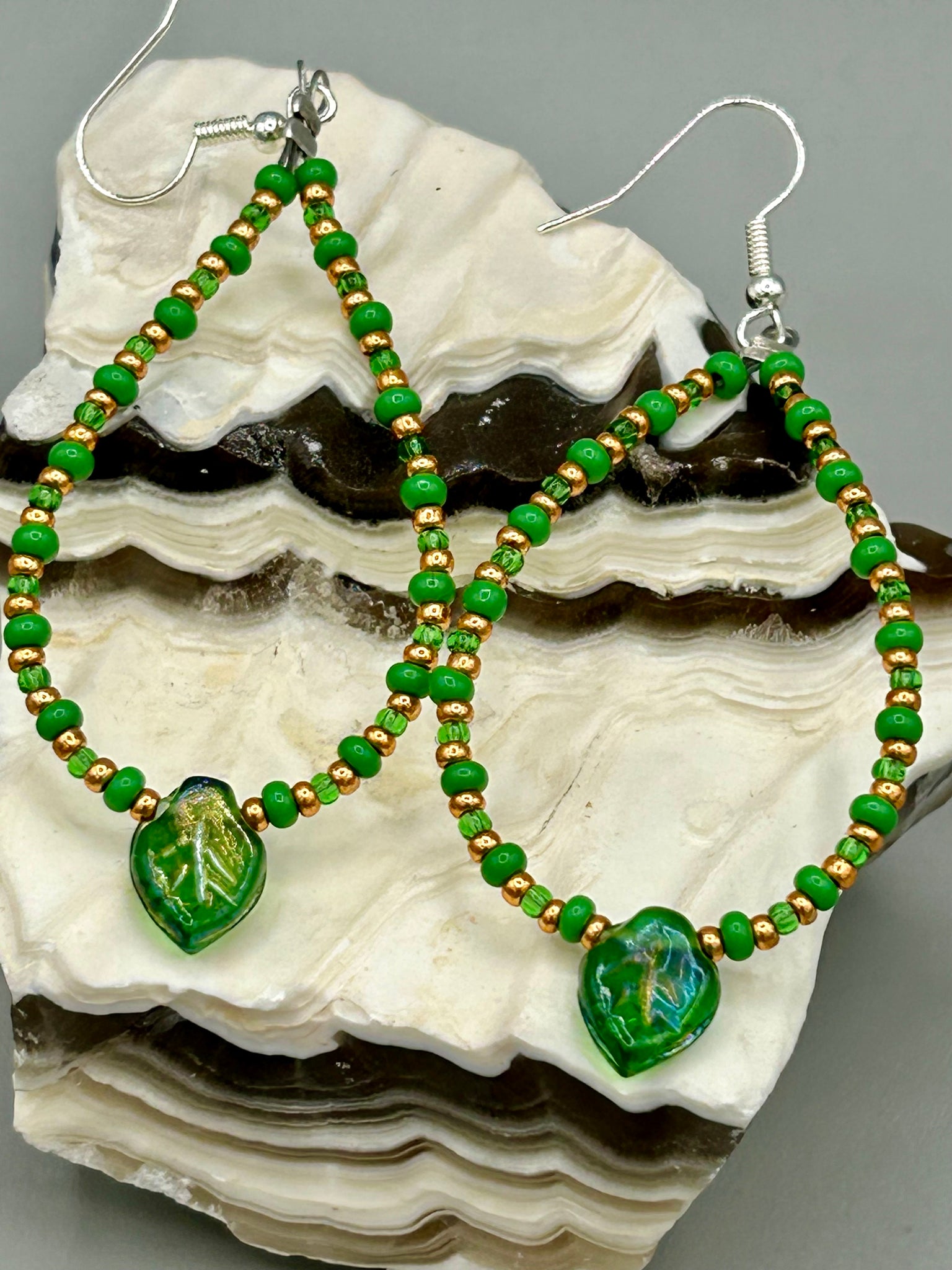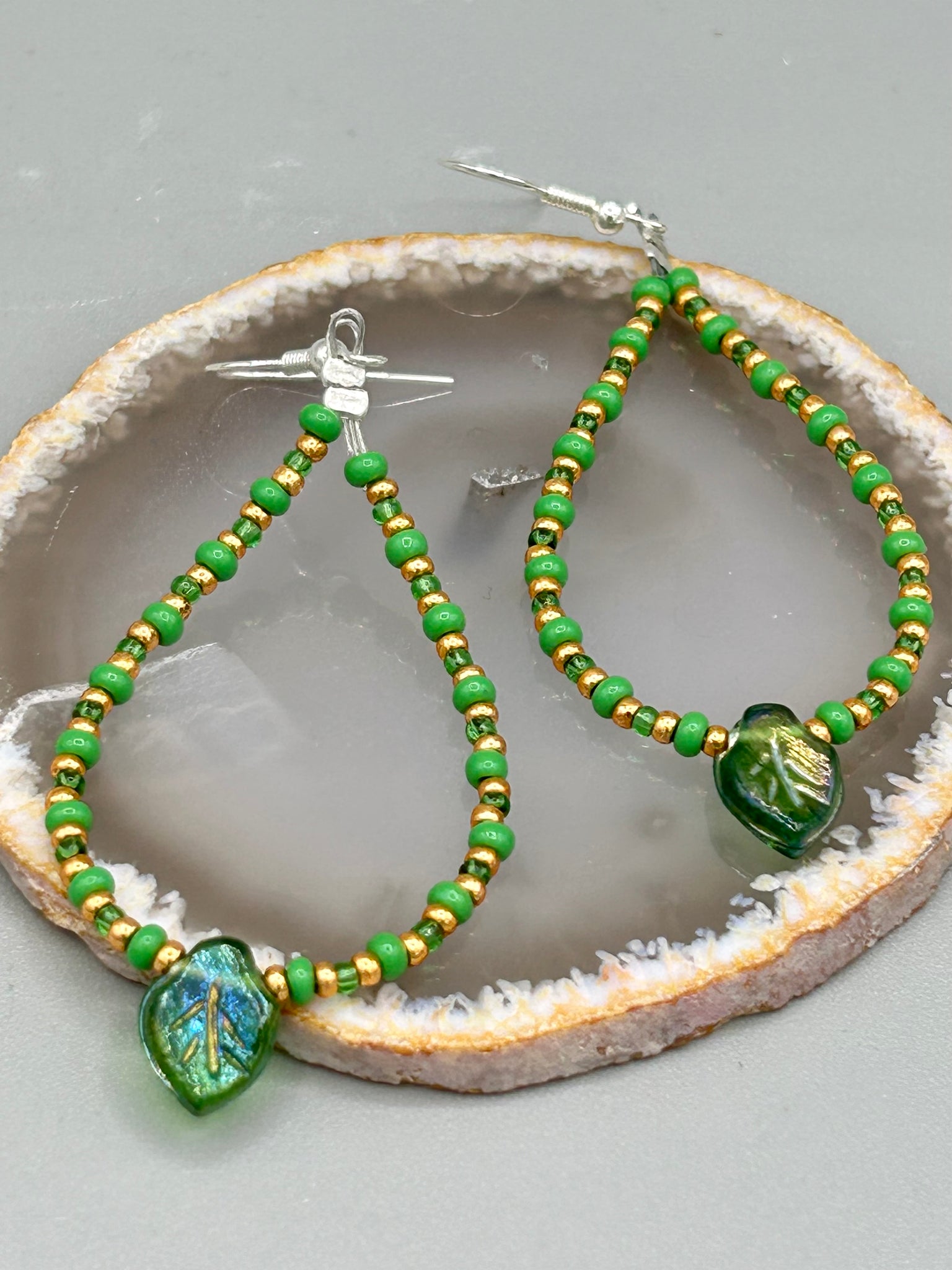 This pair of earrings features a dark green, pressed glass leaf charm in an iridescent finish that gives off subtle hues of gold, purple, blue, and pink. Complemented with green and gold glass beaded hoop earrings, this set is sure to sparkle.