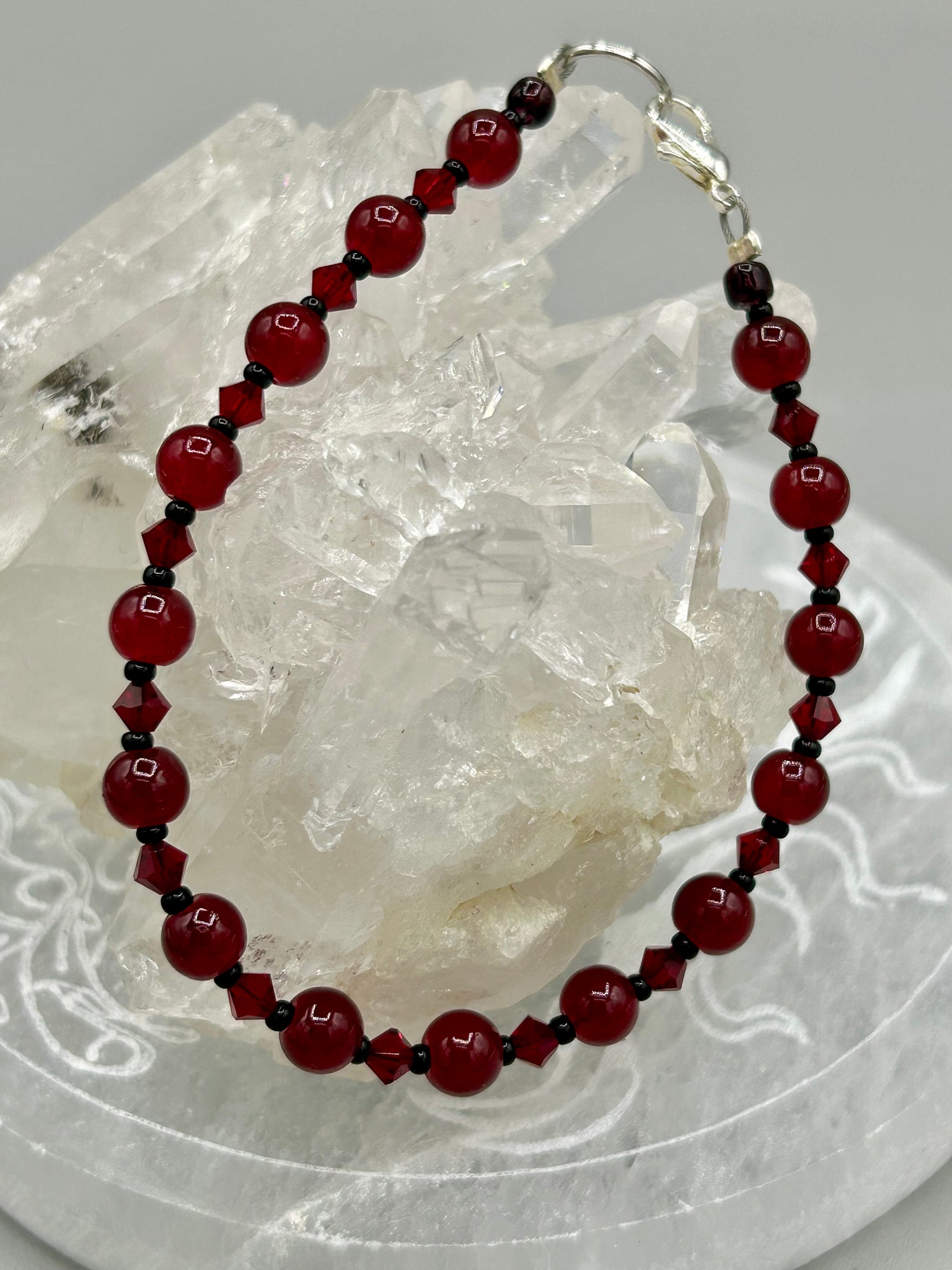Single-strand dark red round glass beaded bracelet with dark red faceted crystals. Crafted with metal wire and fastened with a lobster claw clasp.