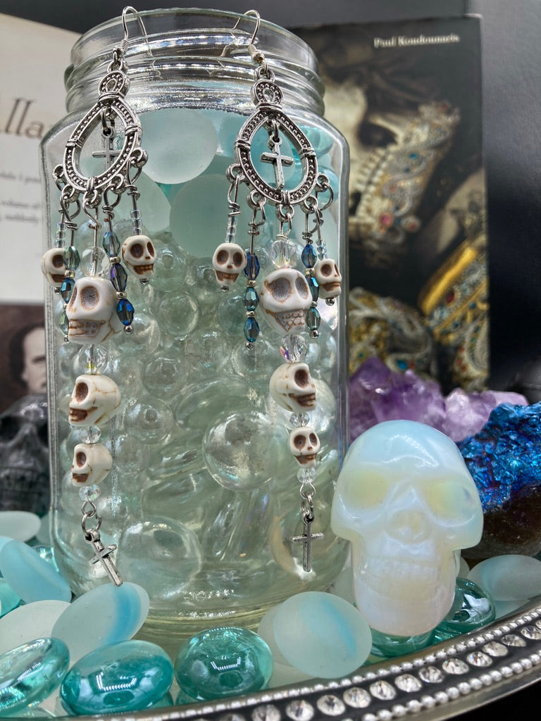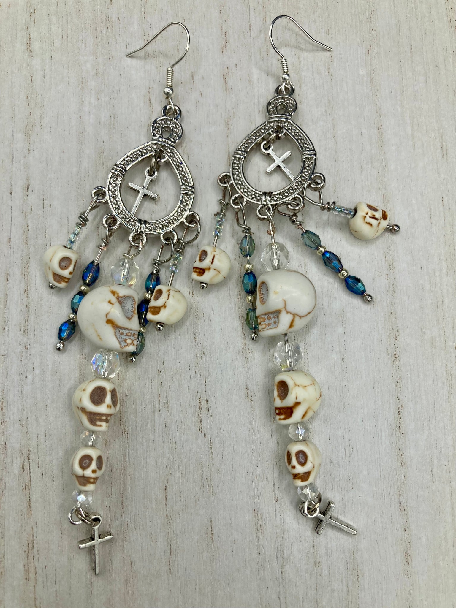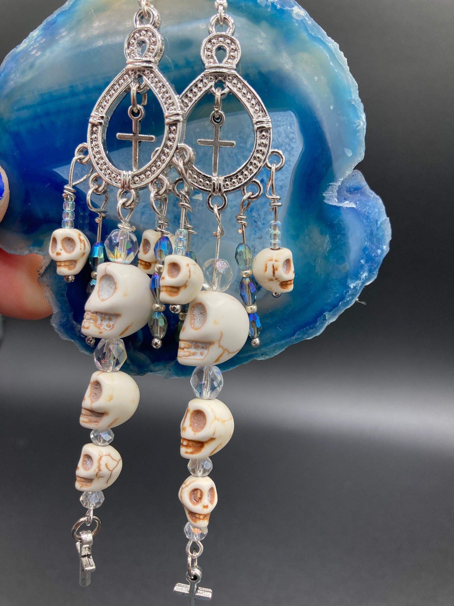 Large Chandelier Style Earrings Howlite Skull Beads Silver Plated Crosses. Ultimate Chingona, Cabrona, Latina Chicana, Goth, Vampire Goth, Dark Witchy Style. You can dress these up or down, it will definitely give your outfit a unique look. Cascade of dangling skulls and crosses have plenty of fun movement.