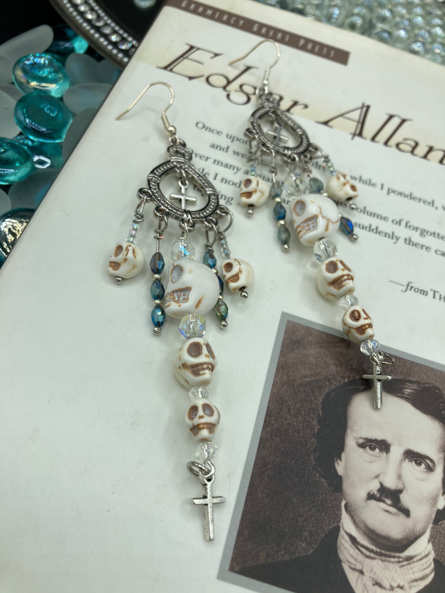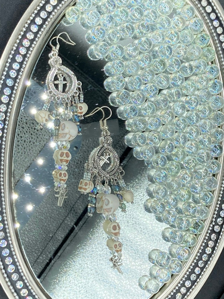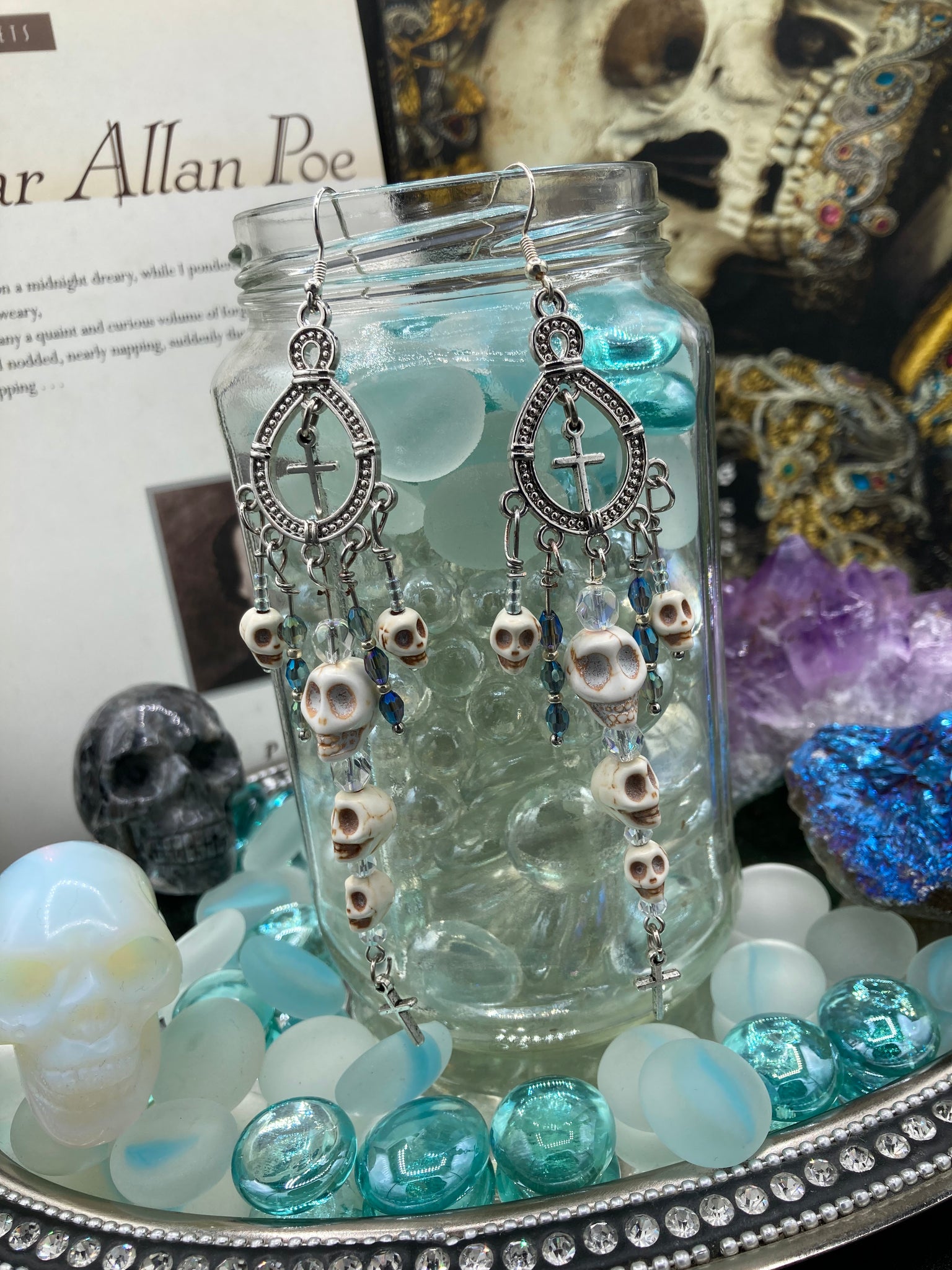 Large Chandelier Style Earrings Howlite Skull Beads Silver Plated Crosses. Ultimate Chingona, Cabrona, Latina Chicana, Goth, Vampire Goth, Dark Witchy Style. You can dress these up or down, it will definitely give your outfit a unique look. Cascade of dangling skulls and crosses have plenty of fun movement.