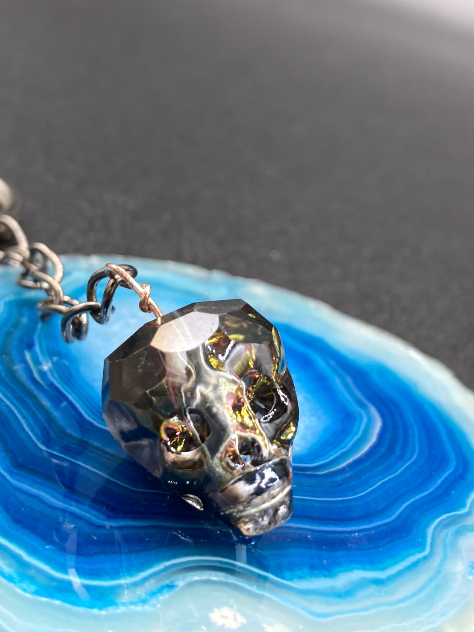 This beautiful edgy gun metal faceted shimmery multi-color glass skull bead keychain is full of hues of silver, purple, pink, blue, and gold. The split nickel key ring is 1 1/4" in diameter and the entire key chain is 4 1/2" in length (from key ring to skull bead)