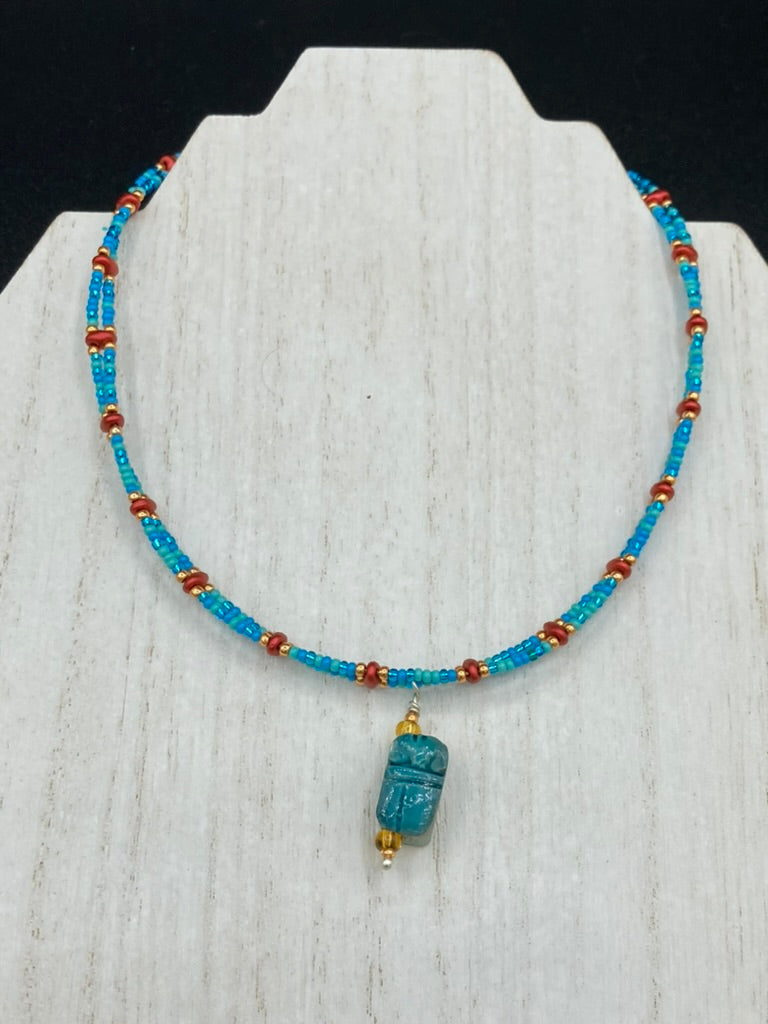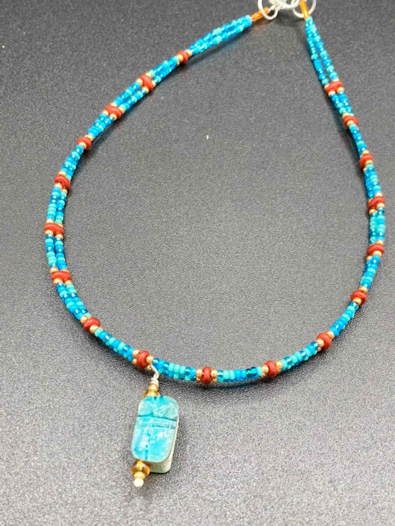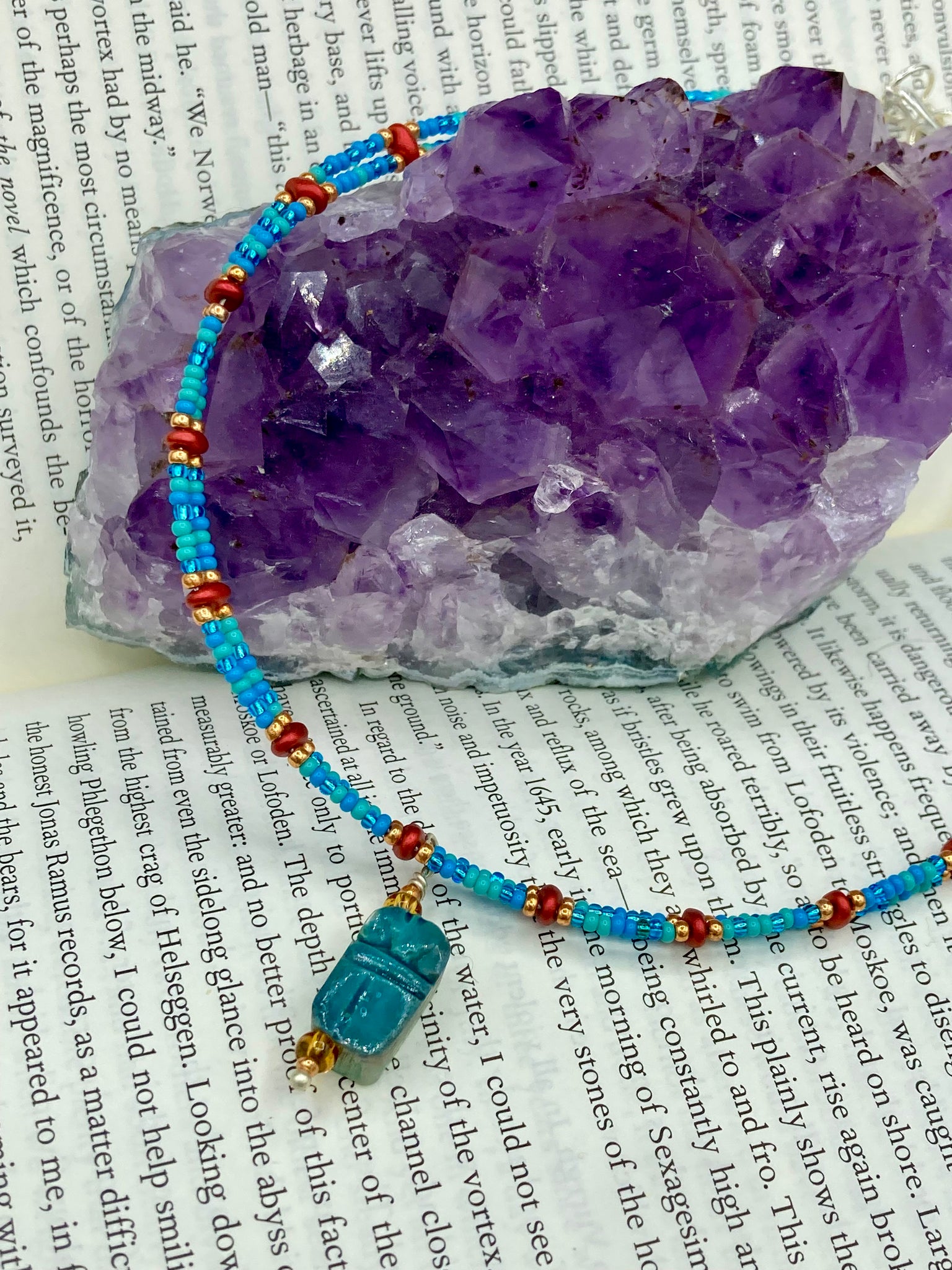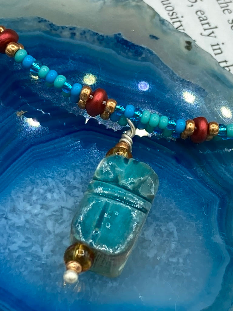 This adjustable choker style necklace features an eye-catching teal wood scarab beetle pendant and glass beaded strands. This dramatic necklace is kept together by double-hole flat matte lava-red beads, providing a collar shape. The necklace artfully wraps around the neck, conveying an elegant and bold style.