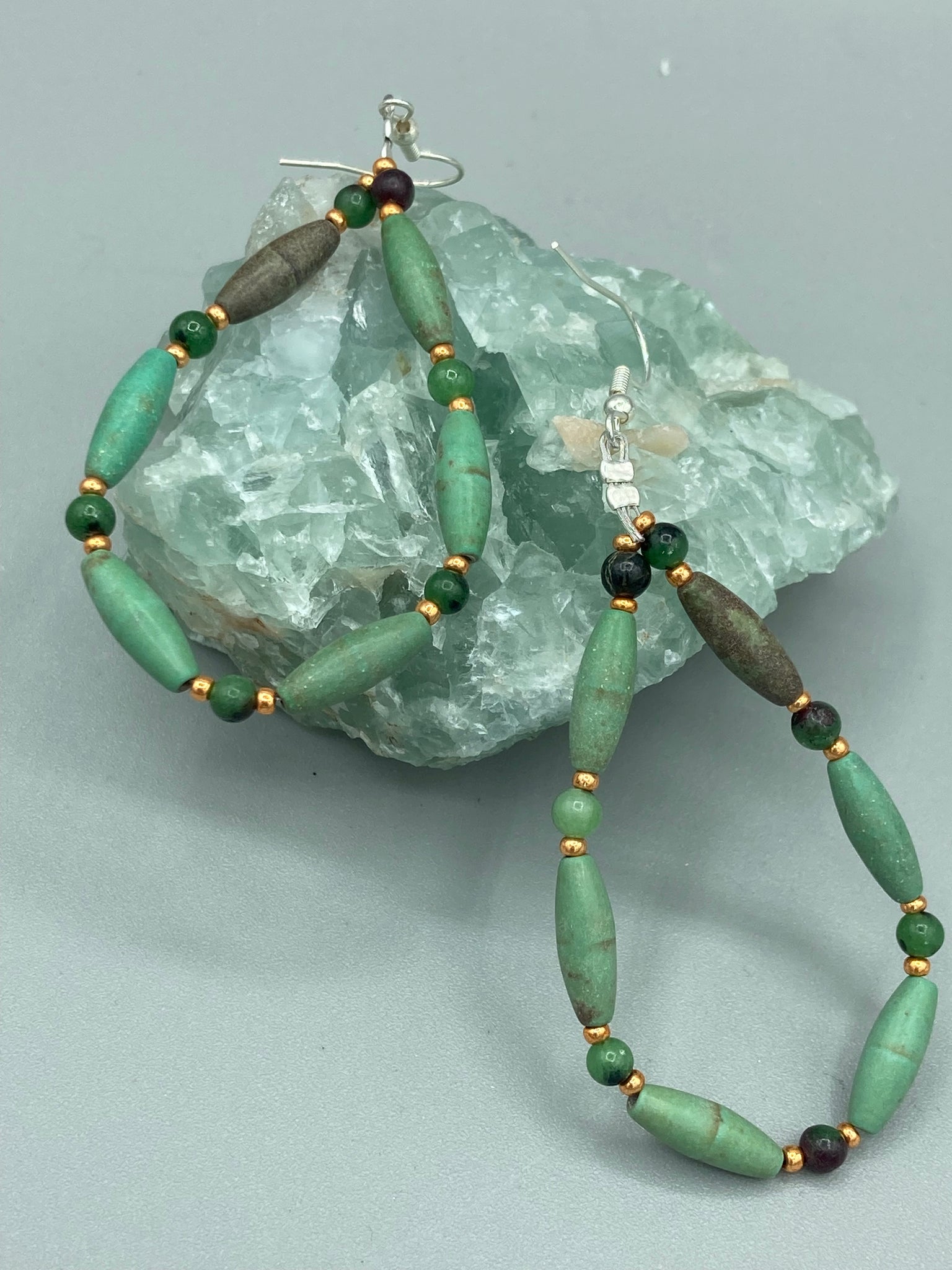 These stylish fish hook style earrings feature intricate beadwork crafted with forest green magnesite and ruby zoisite stones.