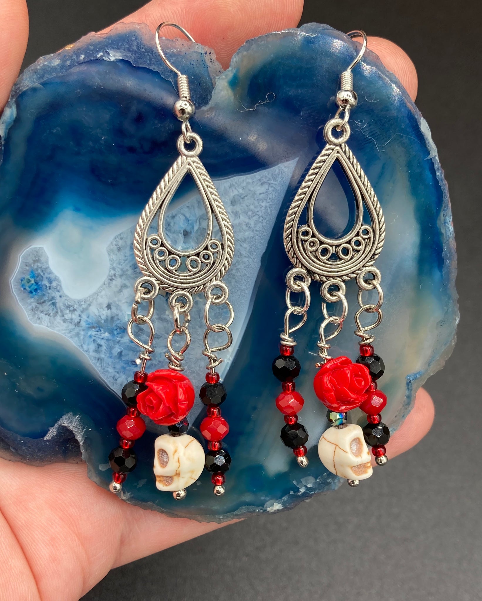 Frida Kahlo Inspired Earrings, Tiny Howlite Skull Beads With Red Quartize Rose Beads. Elegant set of earrings captures Frida Kahlo's signature floral crown on her head. Red and black shimmery glass beads to give a little pop of color and incorporated some movement. These are a beautiful piece of jewelry to wear for inspiration or a great Dia De Los Muertos jewelry piece. You can dress these up or down, it will definitely give your outfit a unique look.