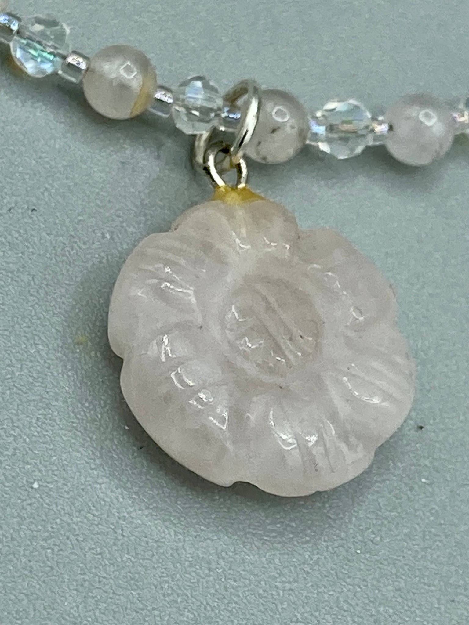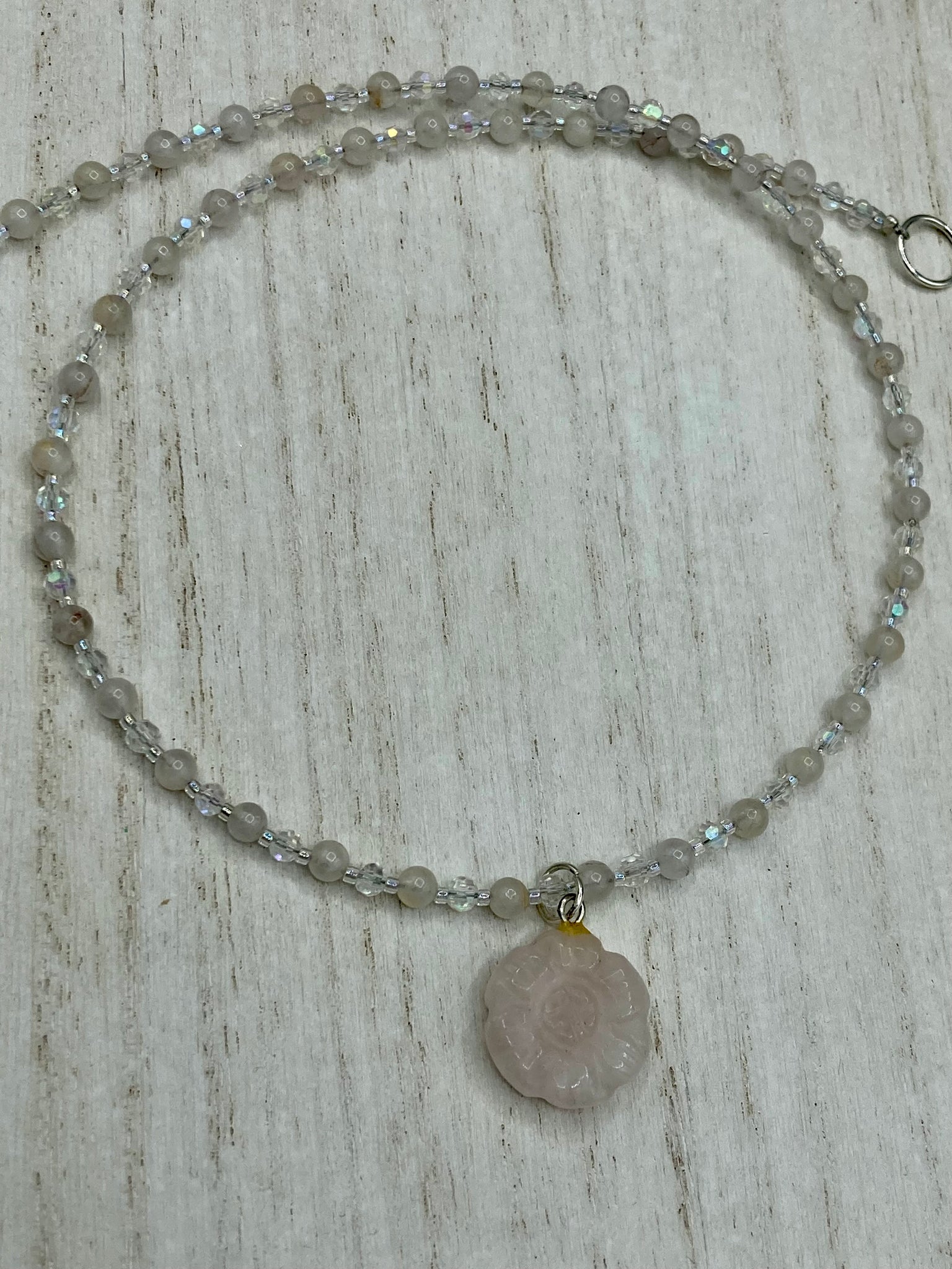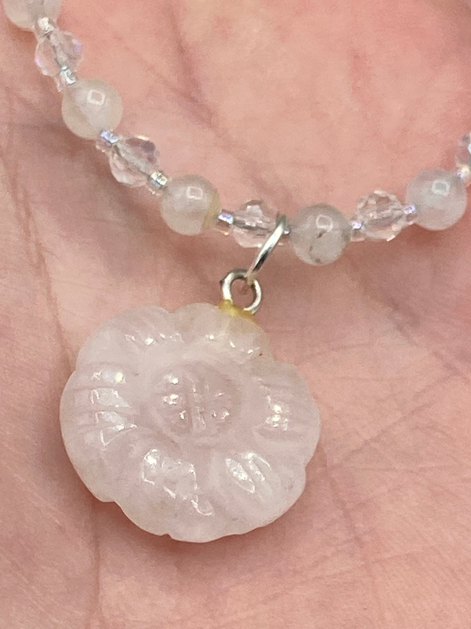 This elegant necklace is adorned with a beautiful rose quartz pendant featuring an intricate floral cutout, complemented by small round rose quartz beads with an iridescent glass finish.