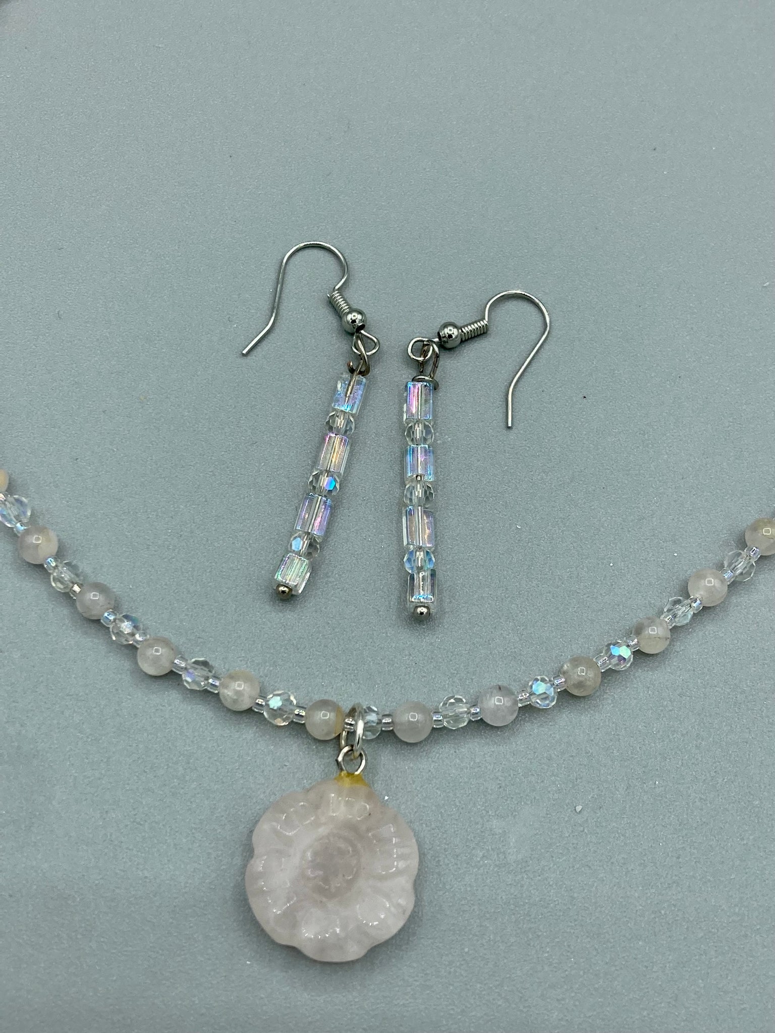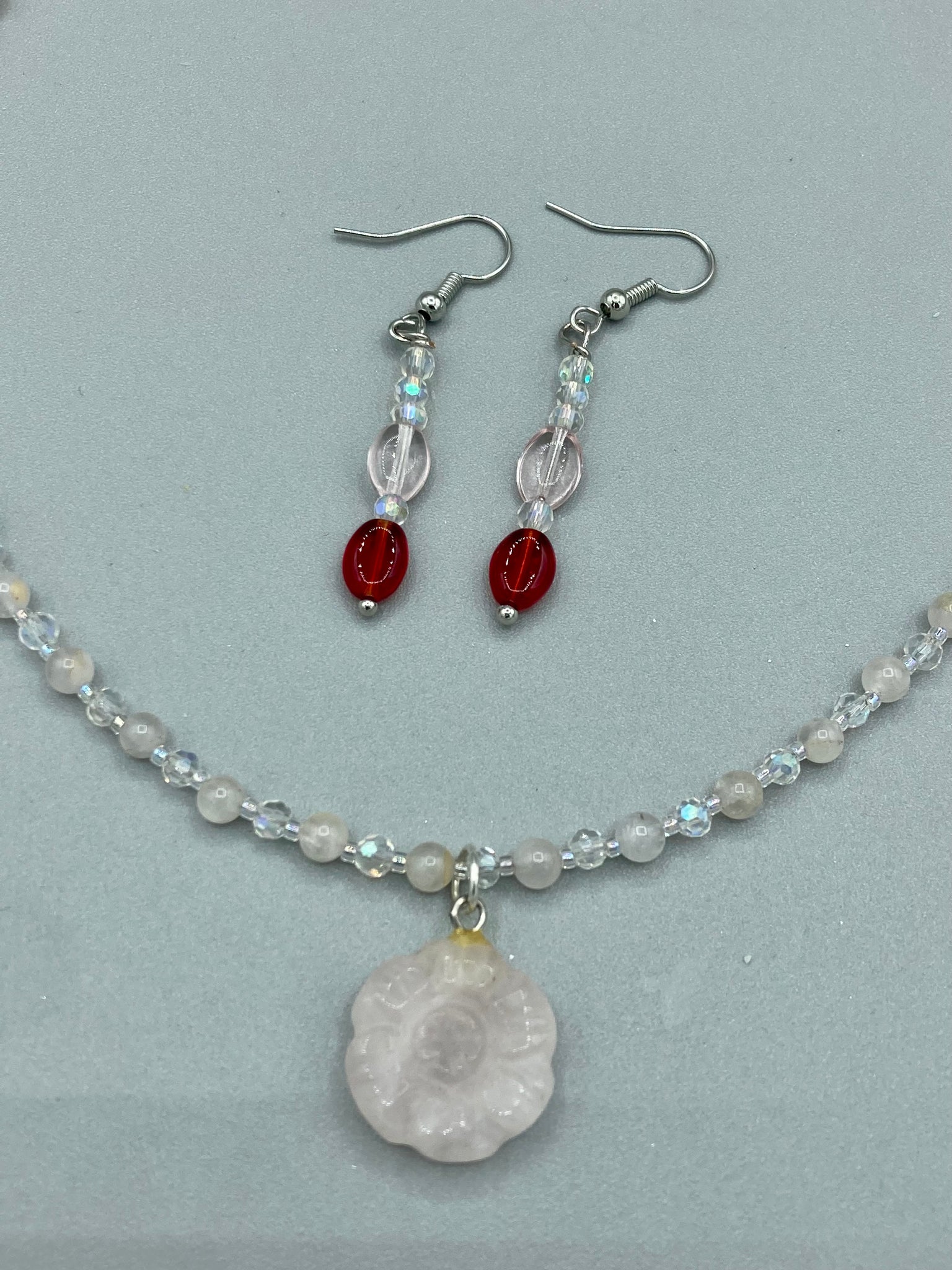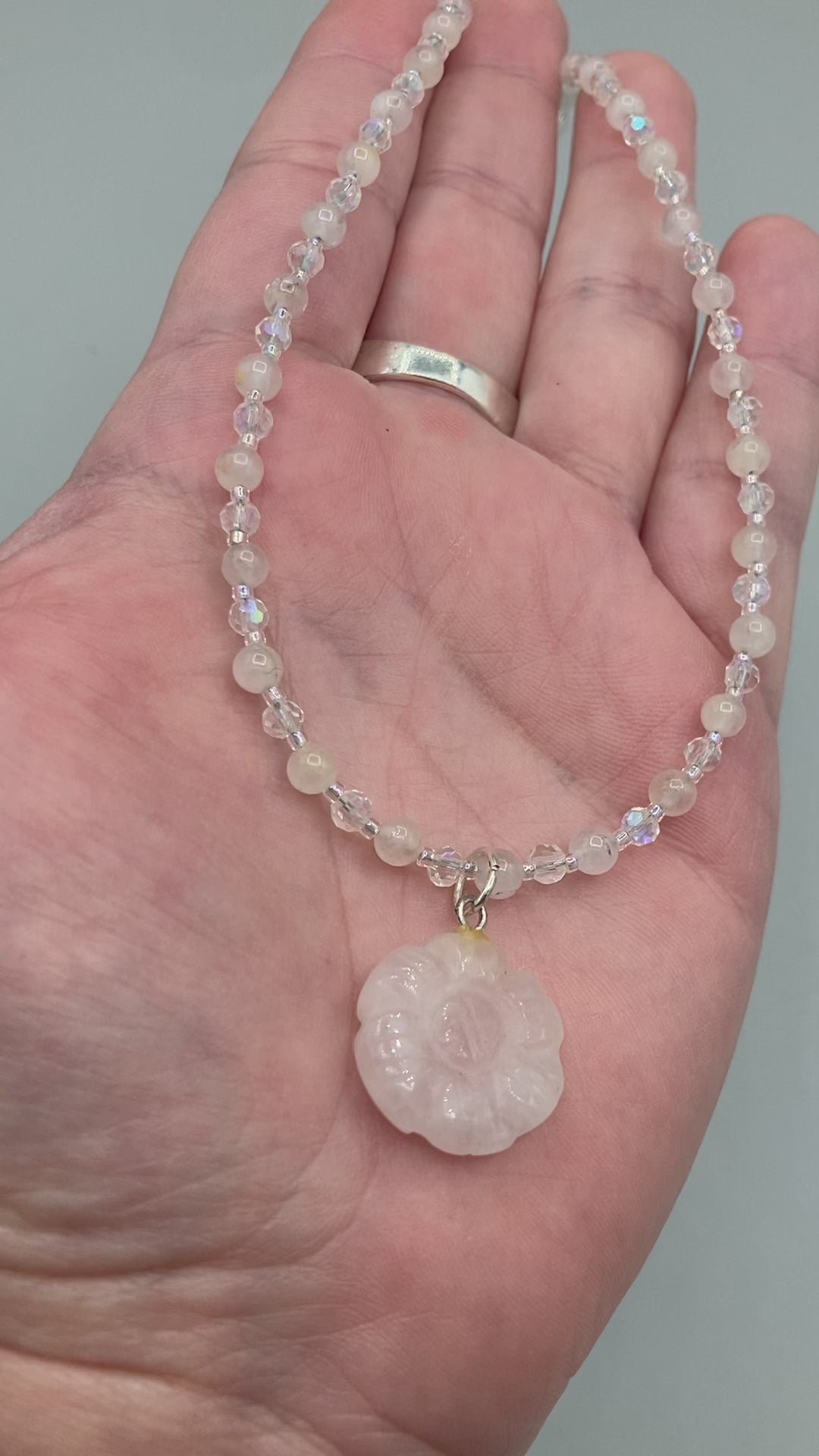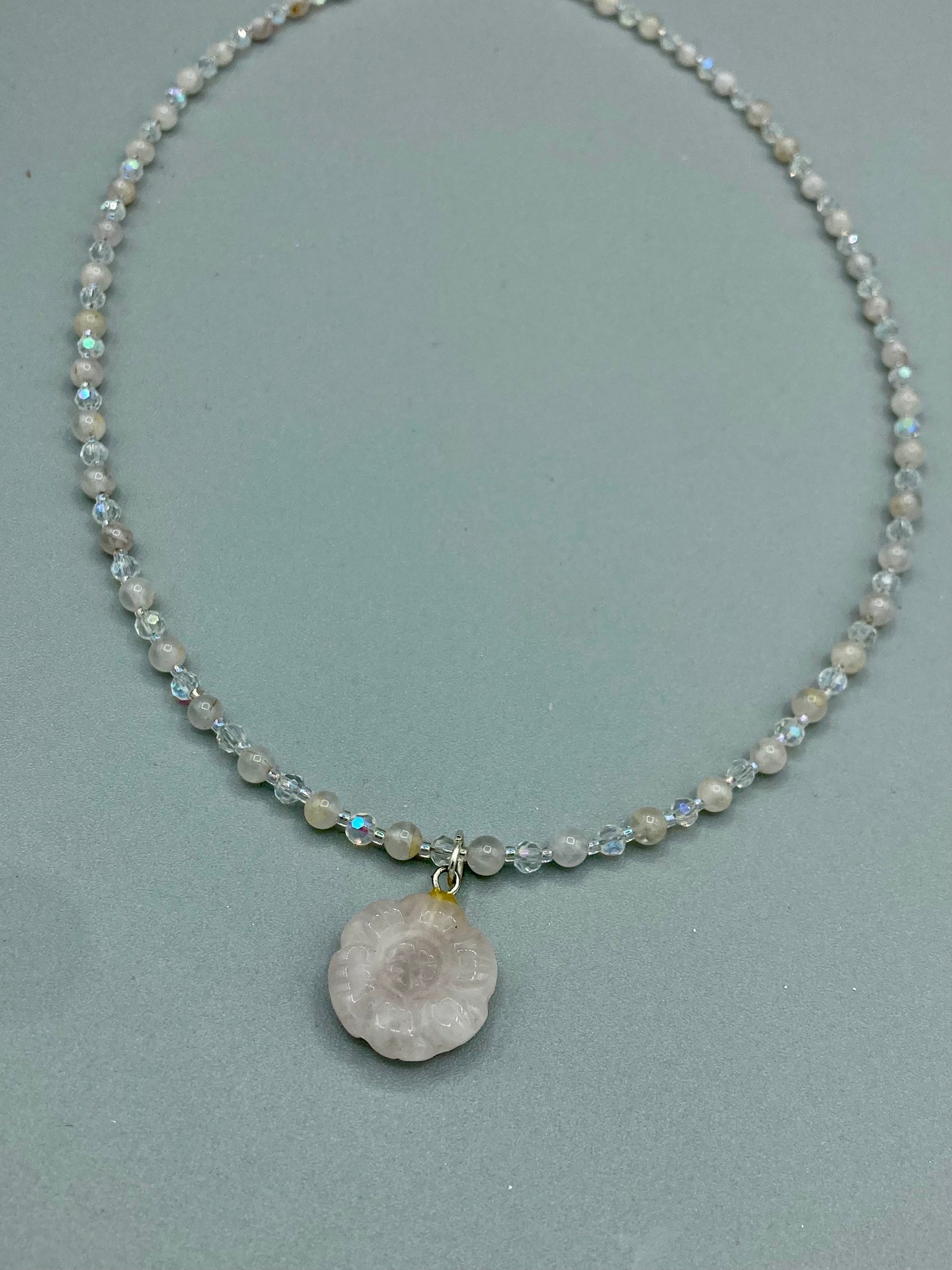 This elegant necklace is adorned with a beautiful rose quartz pendant featuring an intricate floral cutout, complemented by small round rose quartz beads with an iridescent glass finish.