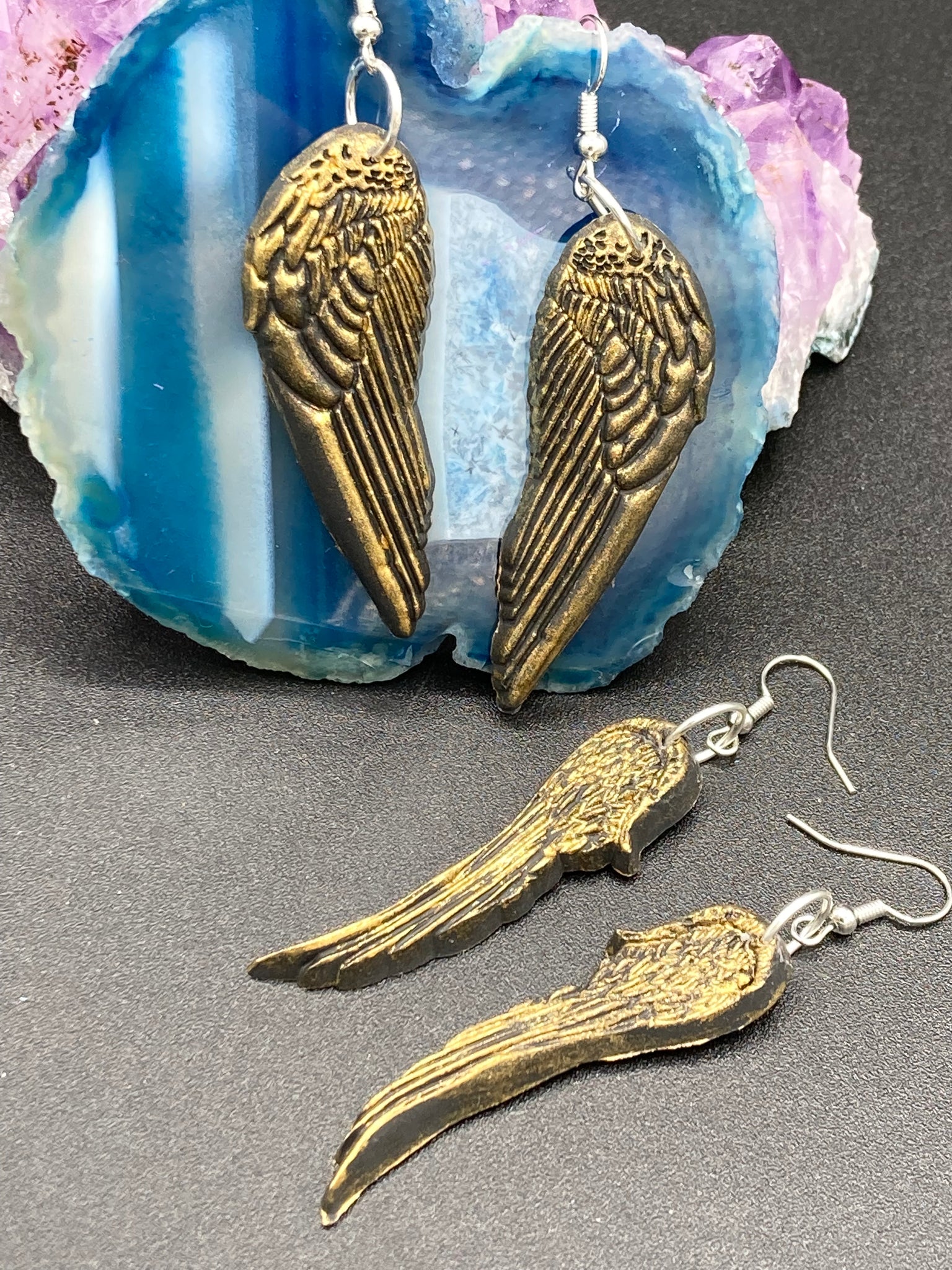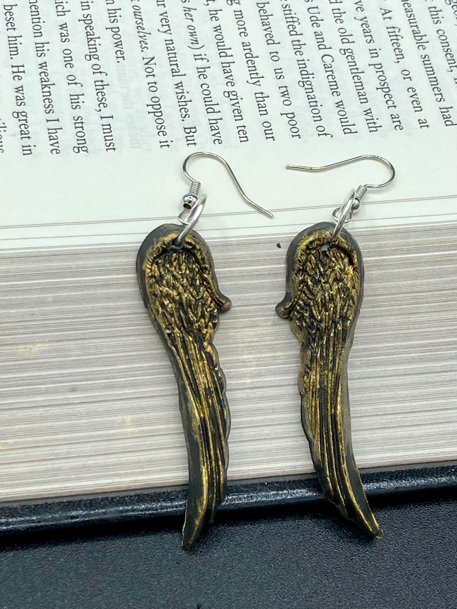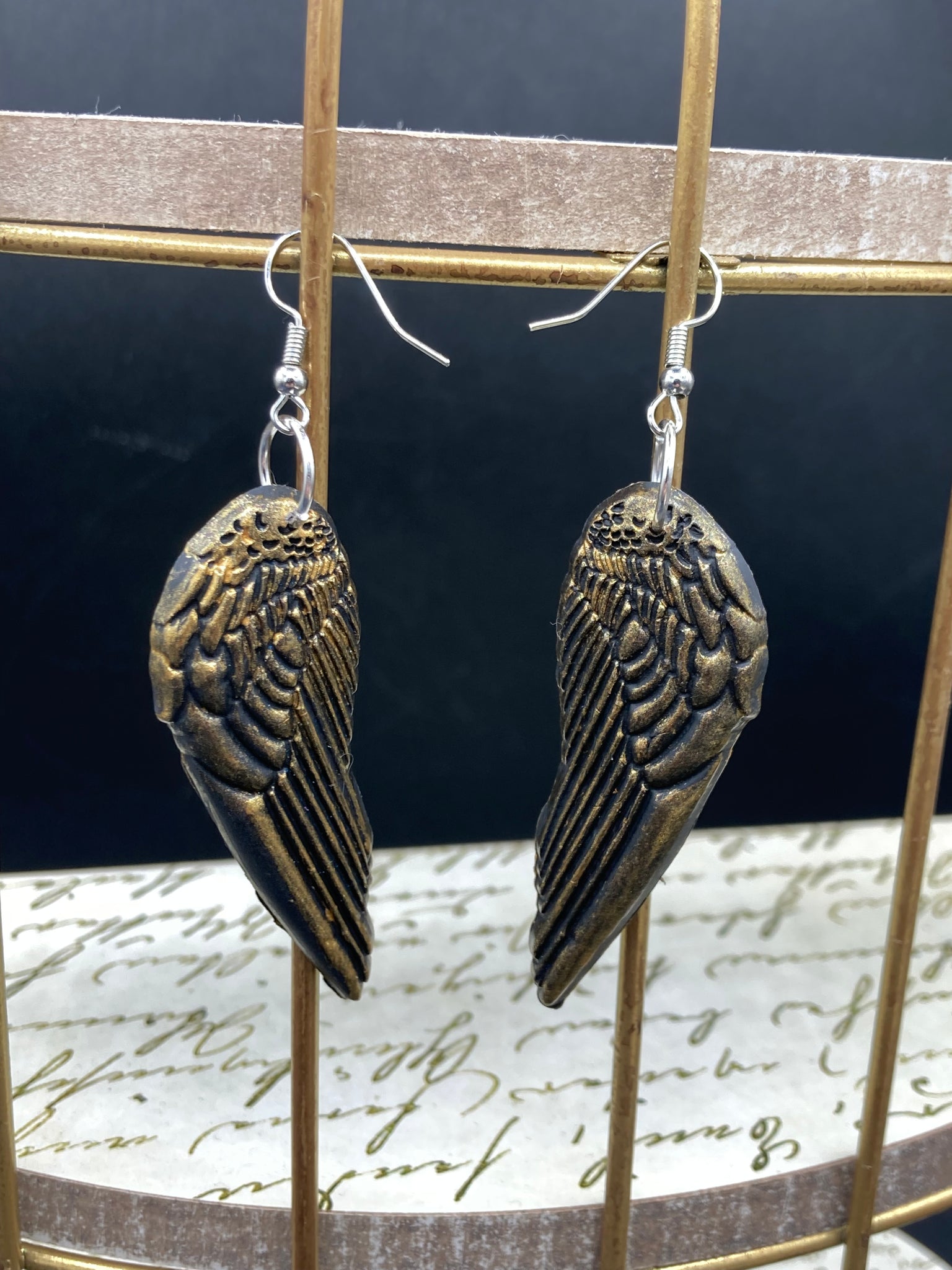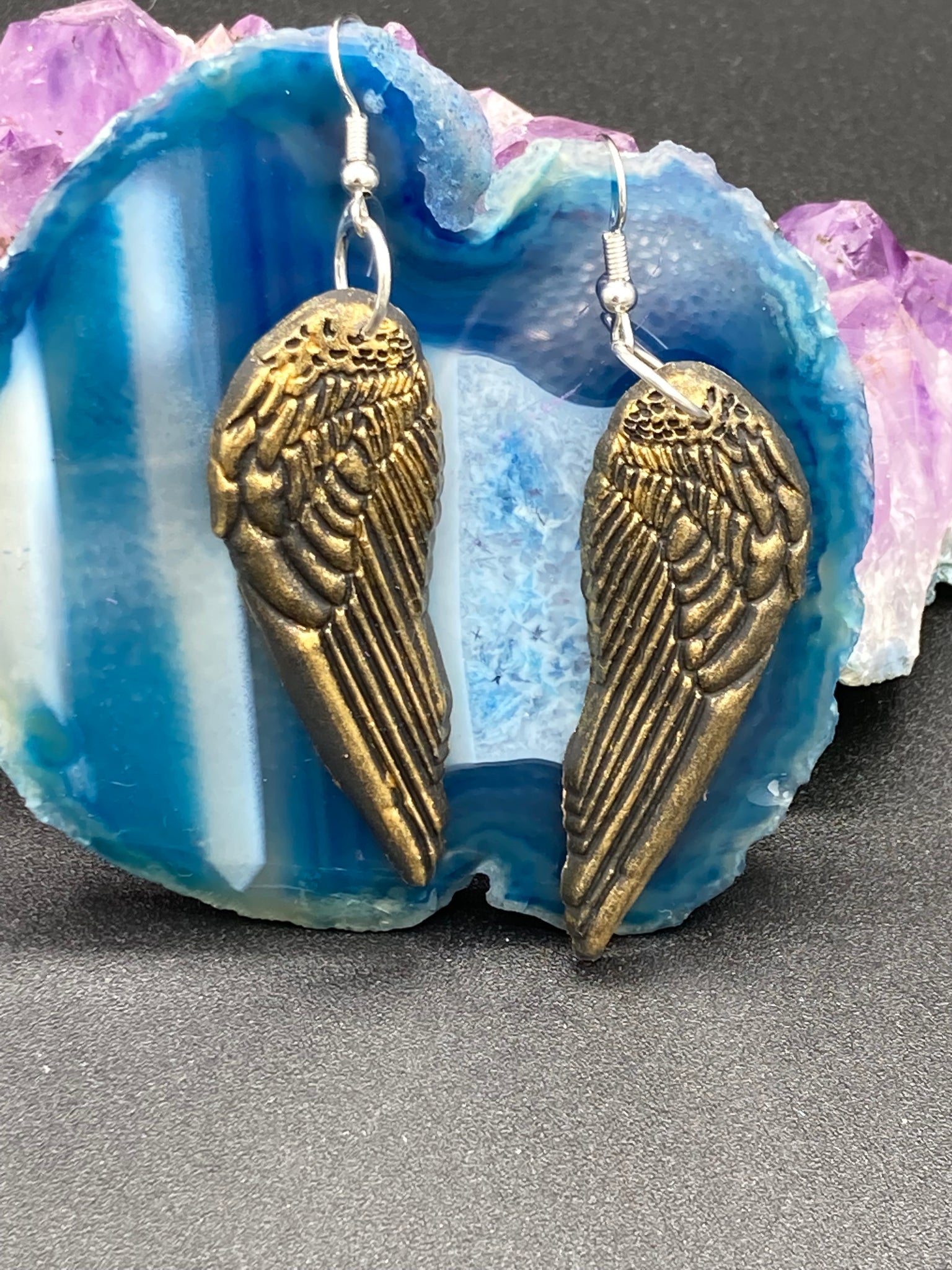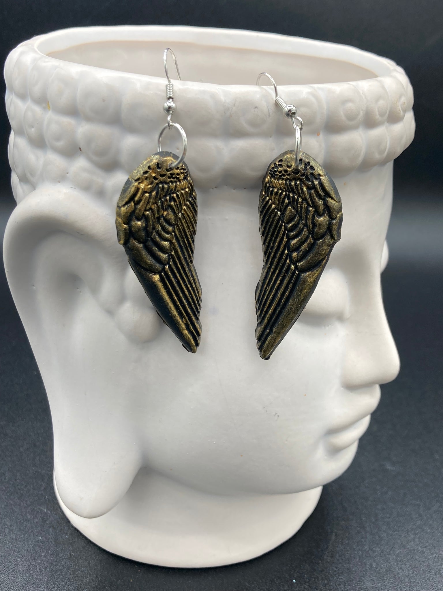 Sparkling gold tone angel wings earrings made of polymer clay. These earrings are designed to face forward when worn instead of the front wings showing on the side.