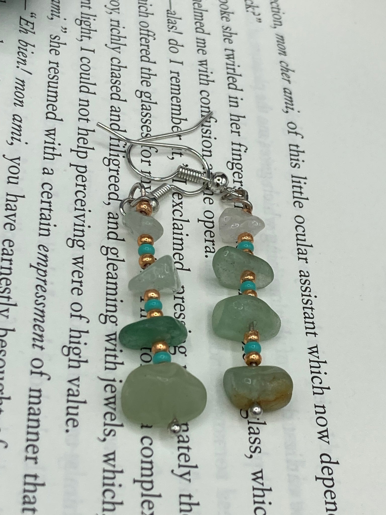 This simple yet elegant set of earrings features a single strand of natural green aventurine chip stones, accented by small turquoise and gold glass beads.
