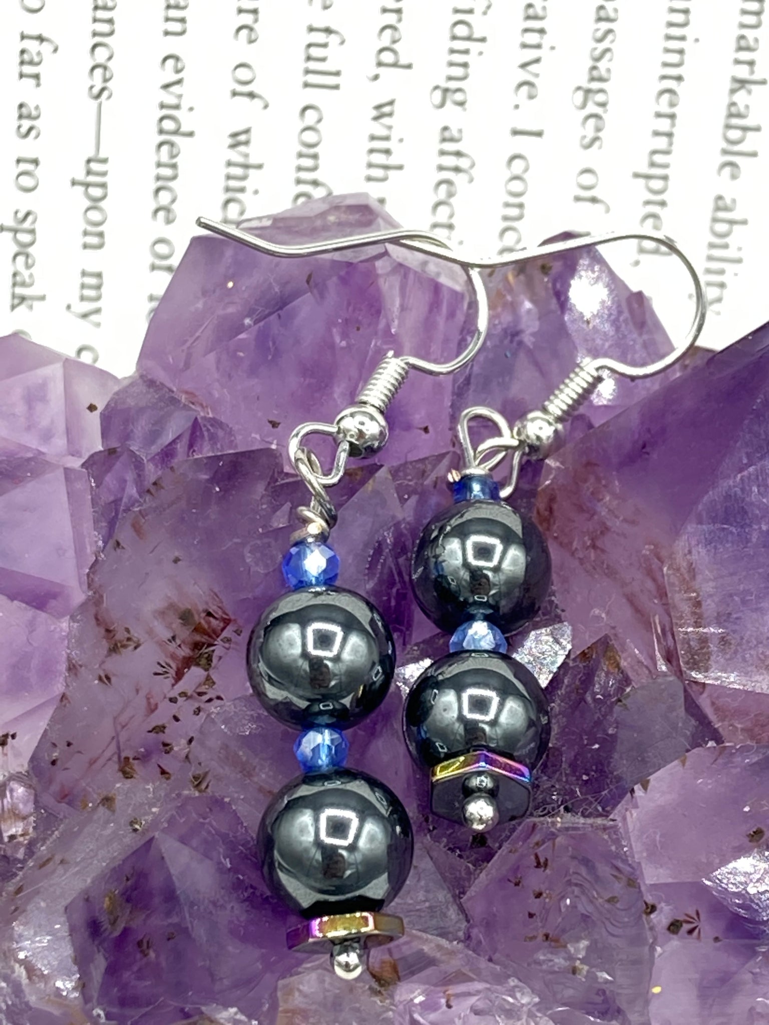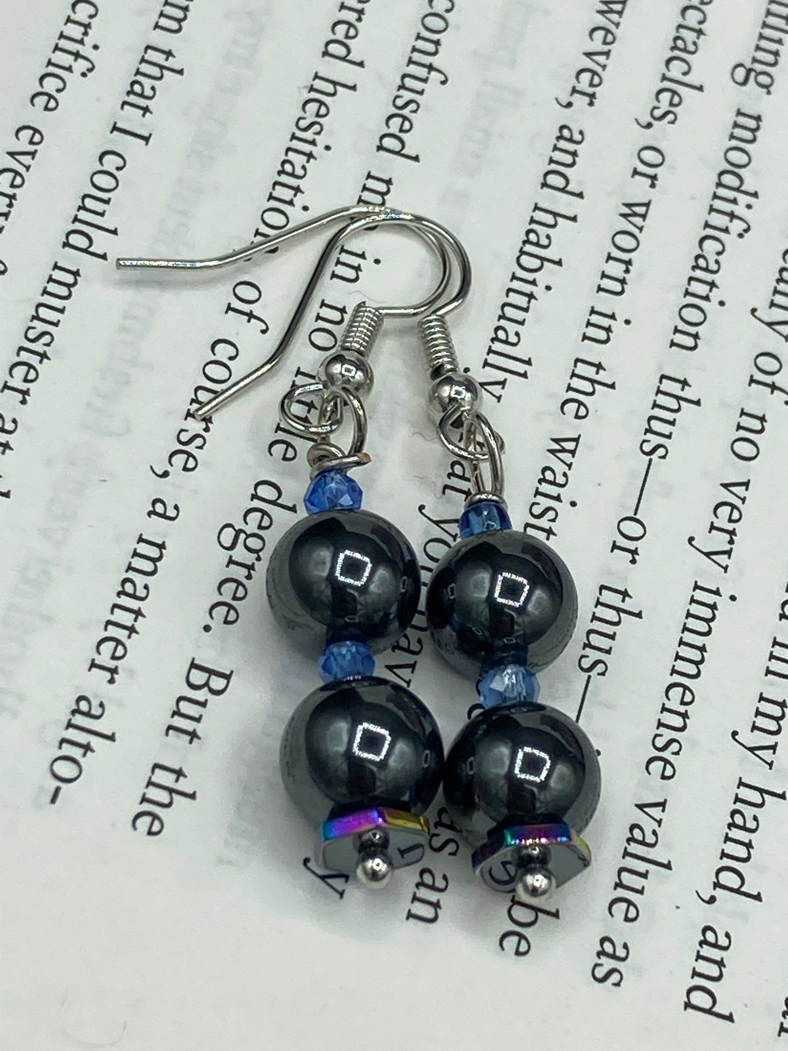These chic earrings, crafted with two Hematite beads and blue glass beads, provide a stylish accent.