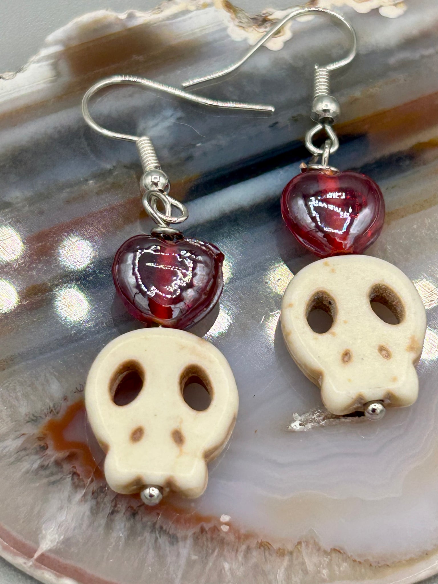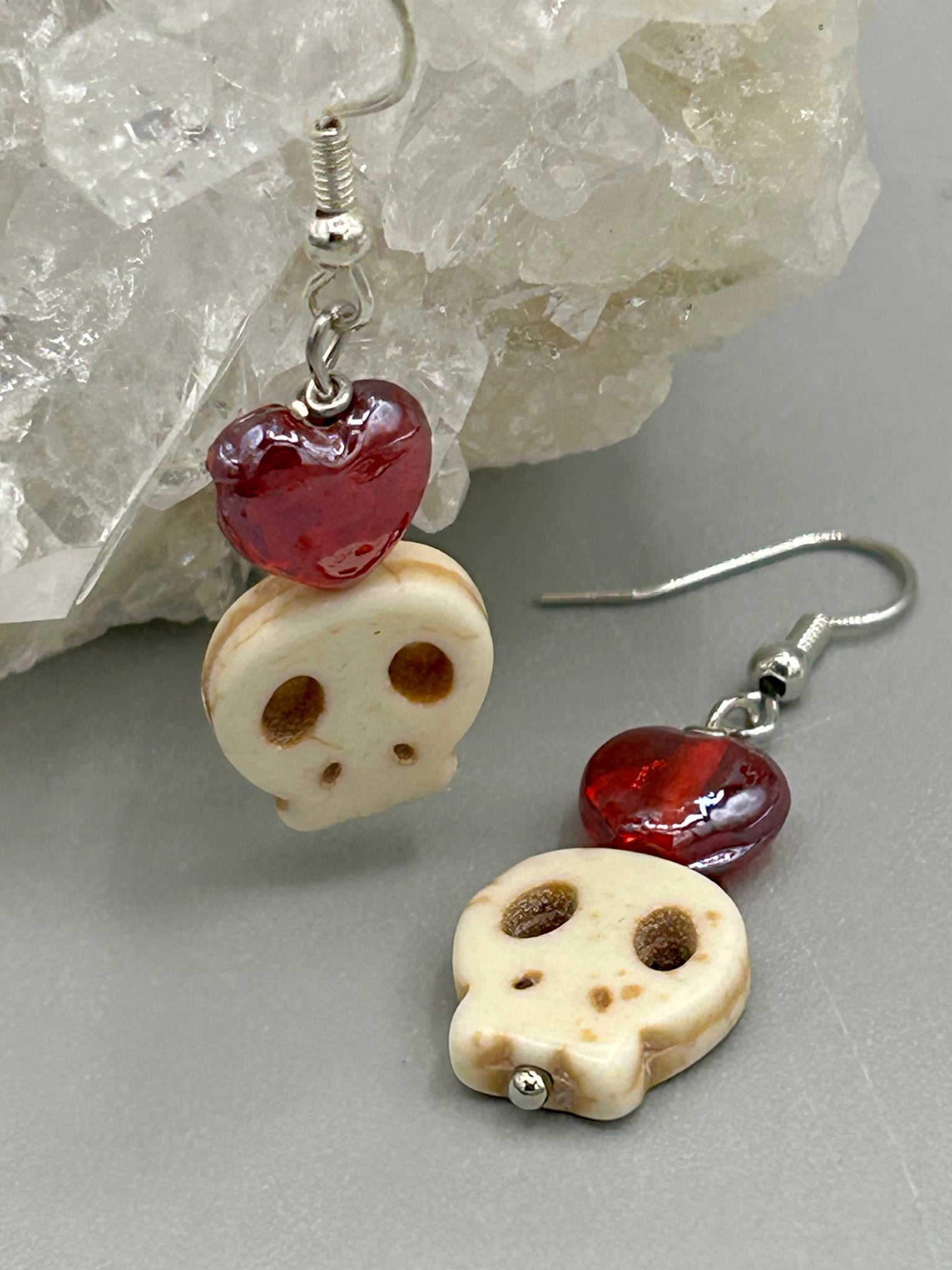 These stylish skull earrings are perfect for adding a unique flair to any outfit. Whether you're looking for a Dia De Los Muertos accessory or simply looking to draw inspiration, these goth pieces perfectly capture the vampire goth, witchy, dark, Chingona Cabrona, Latina Chicana styles. Howlite stone skull beaded earrings come with a ruby red heart-shaped glass beaded that has a very shimmery and vivid iridescent hue.