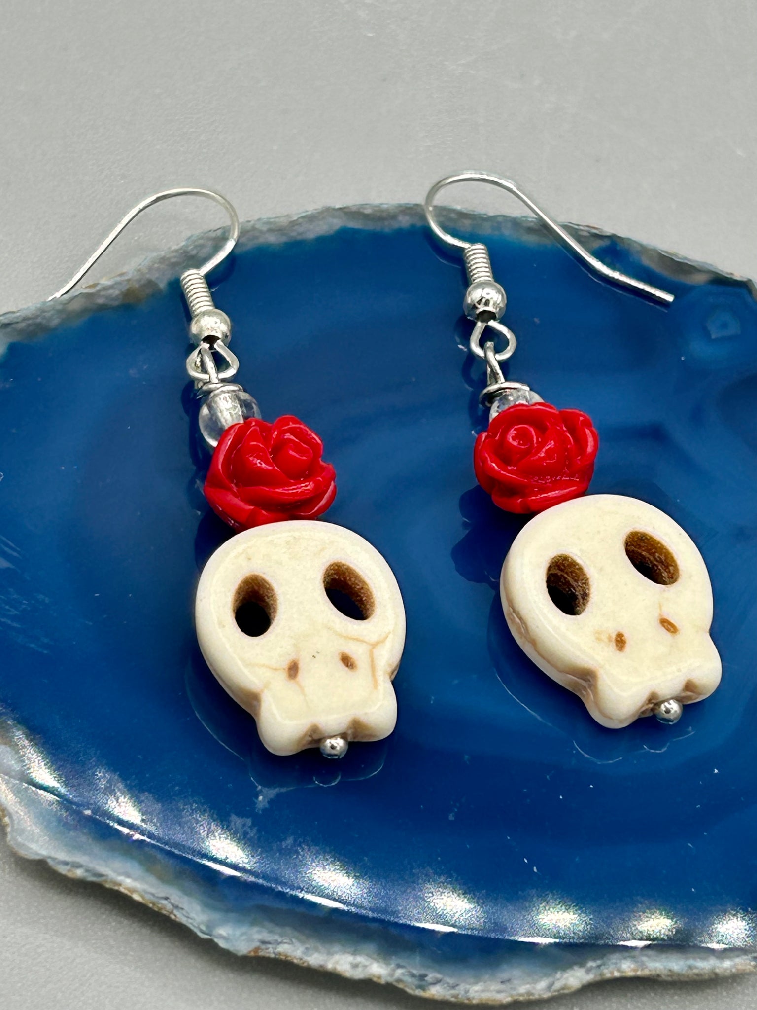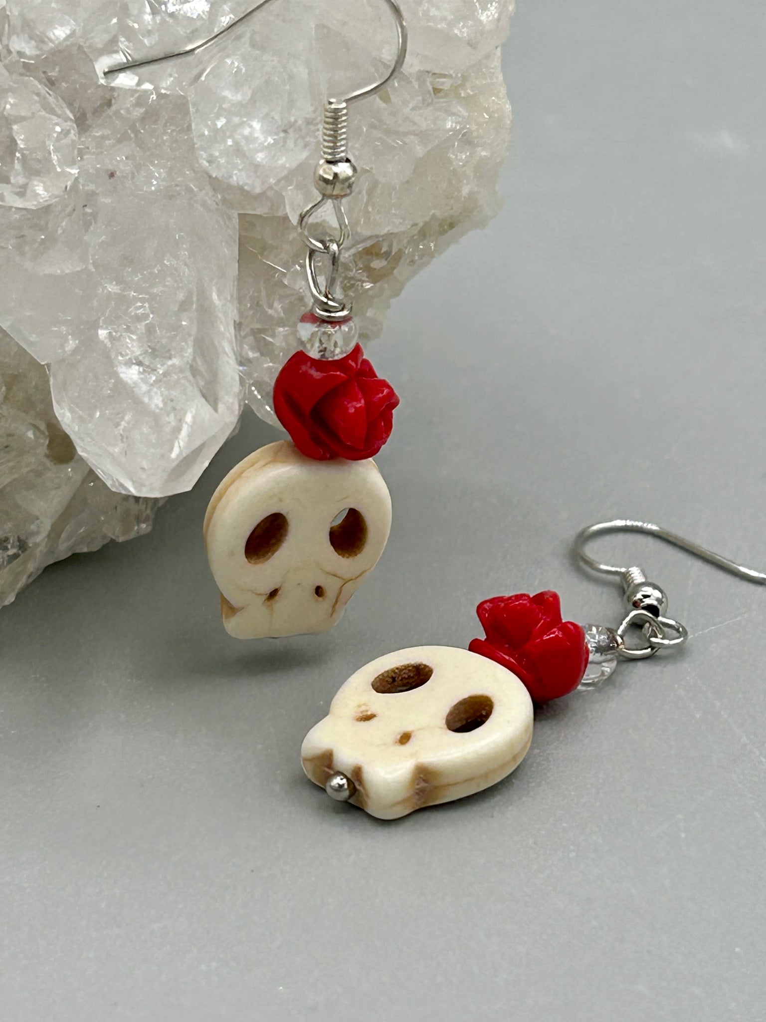 These stylish skull earrings are perfect for adding a unique flair to any outfit. Whether you're looking for a Dia De Los Muertos accessory or simply looking to draw inspiration, these goth pieces perfectly capture the vampire goth, witchy, dark, Chingona Cabrona, Latina Chicana styles. Howlite stone skull bead with red quartzize floral beads.