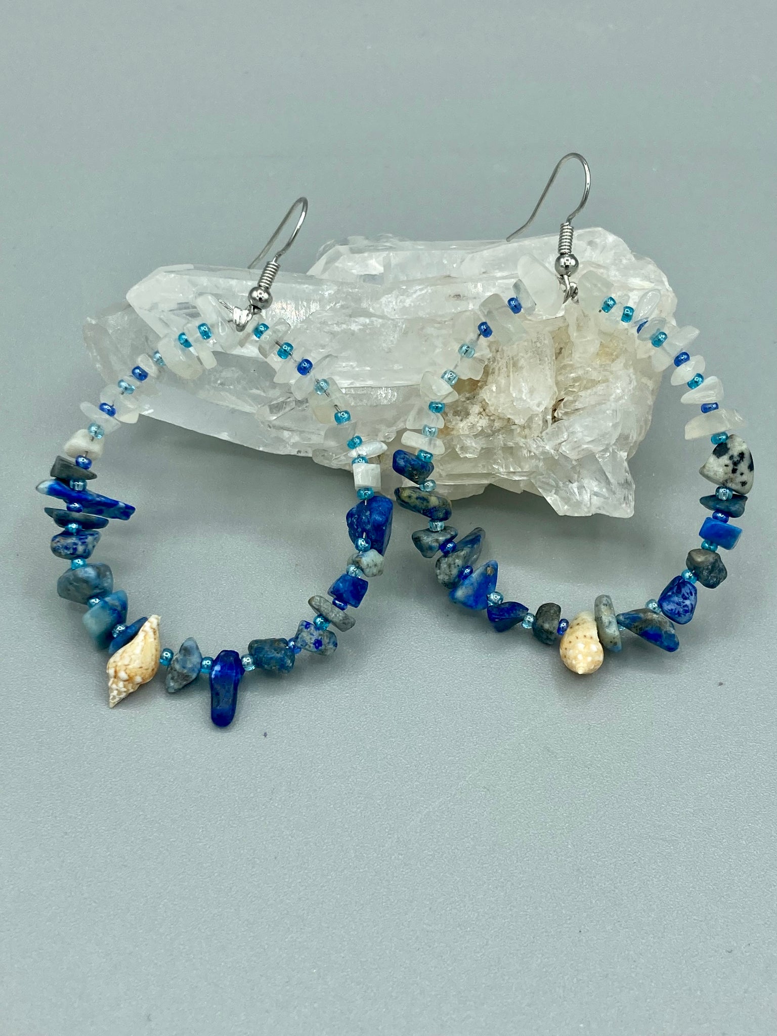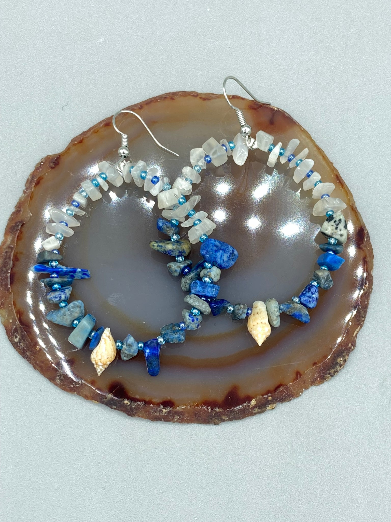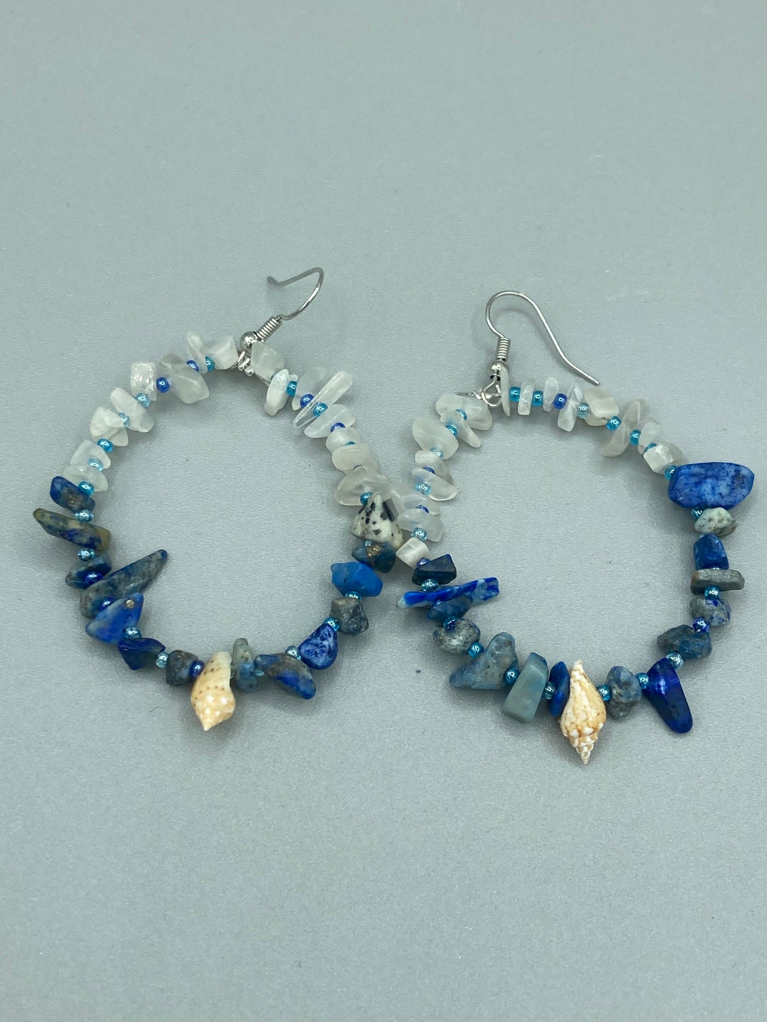 These earrings boast a beautiful combination of natural lapis and white moon stone chip stones, artfully inlaid with gold glass beads in a hoop formation. Dainty conch shells add a subtle touch of nature for a look that perfectly captures the beach vibes of summer. An ideal choice to complement any style.