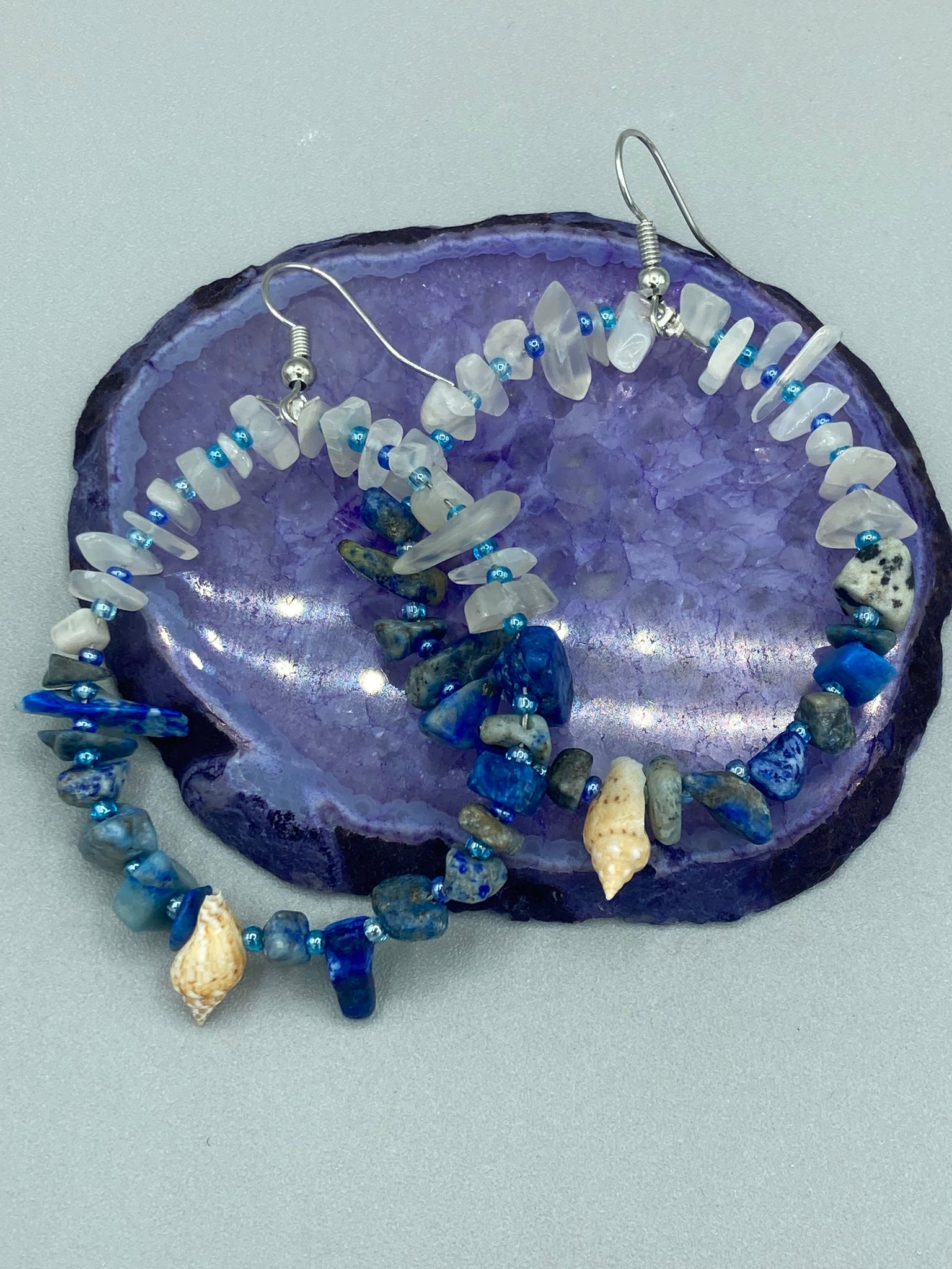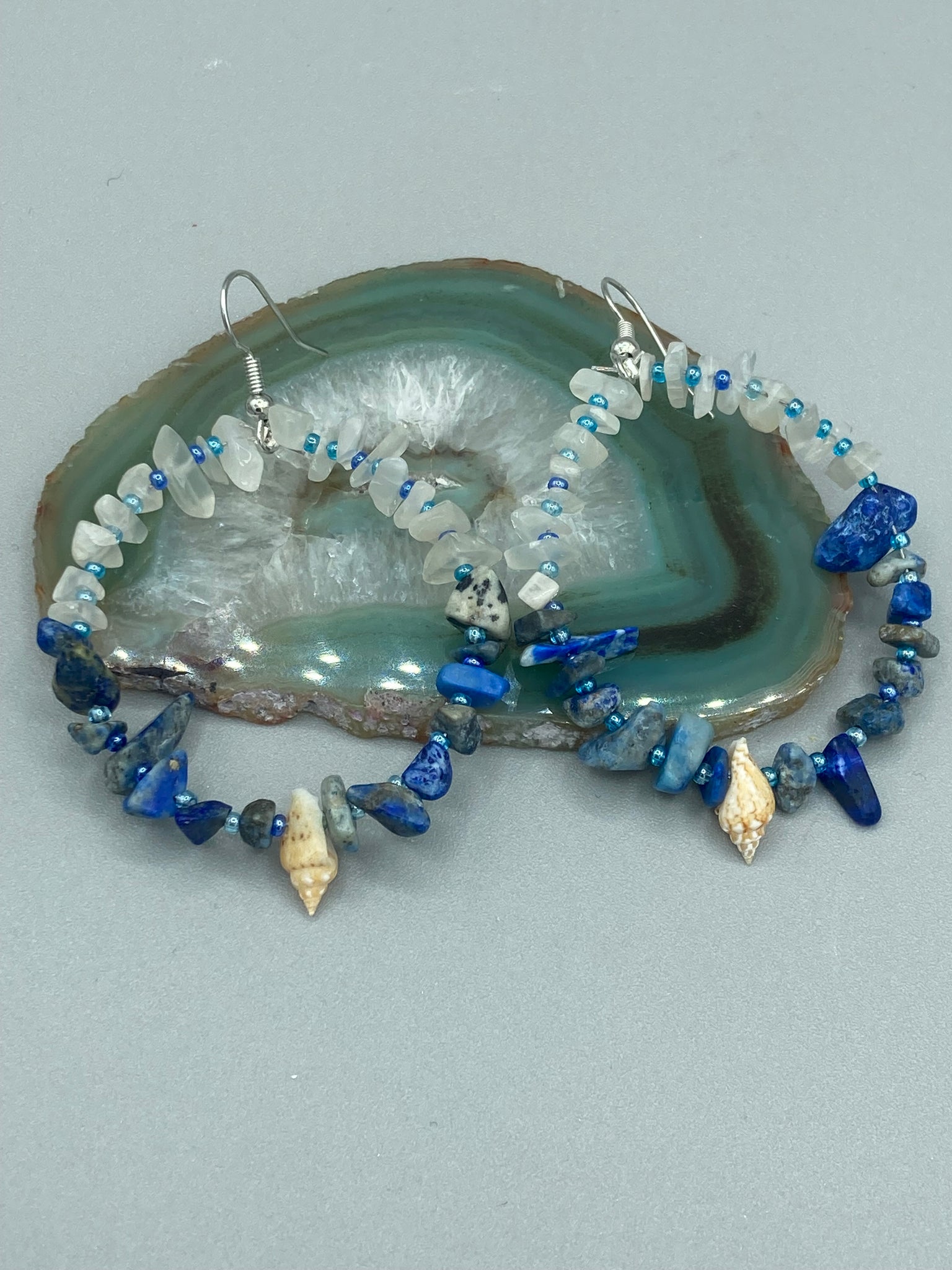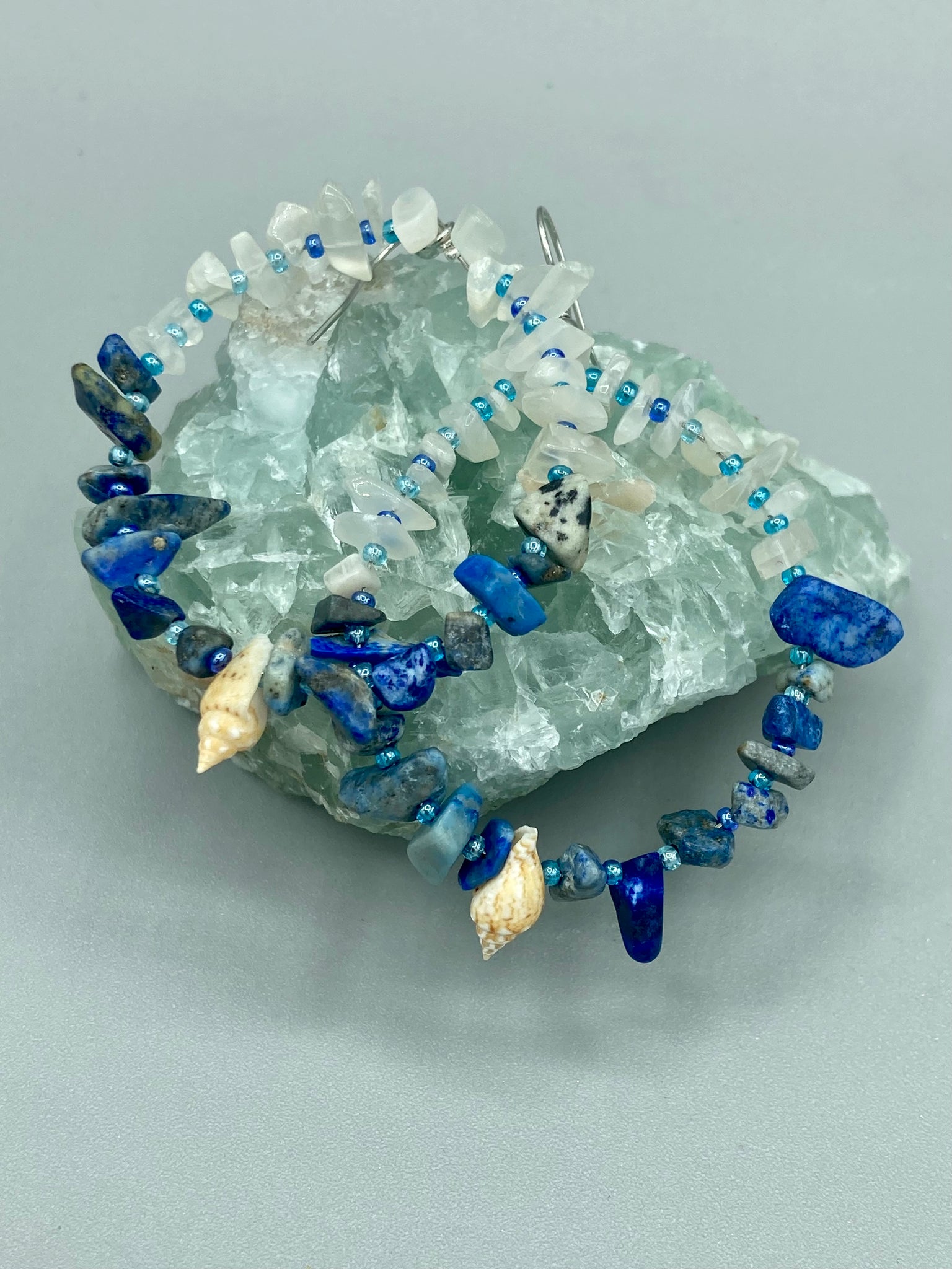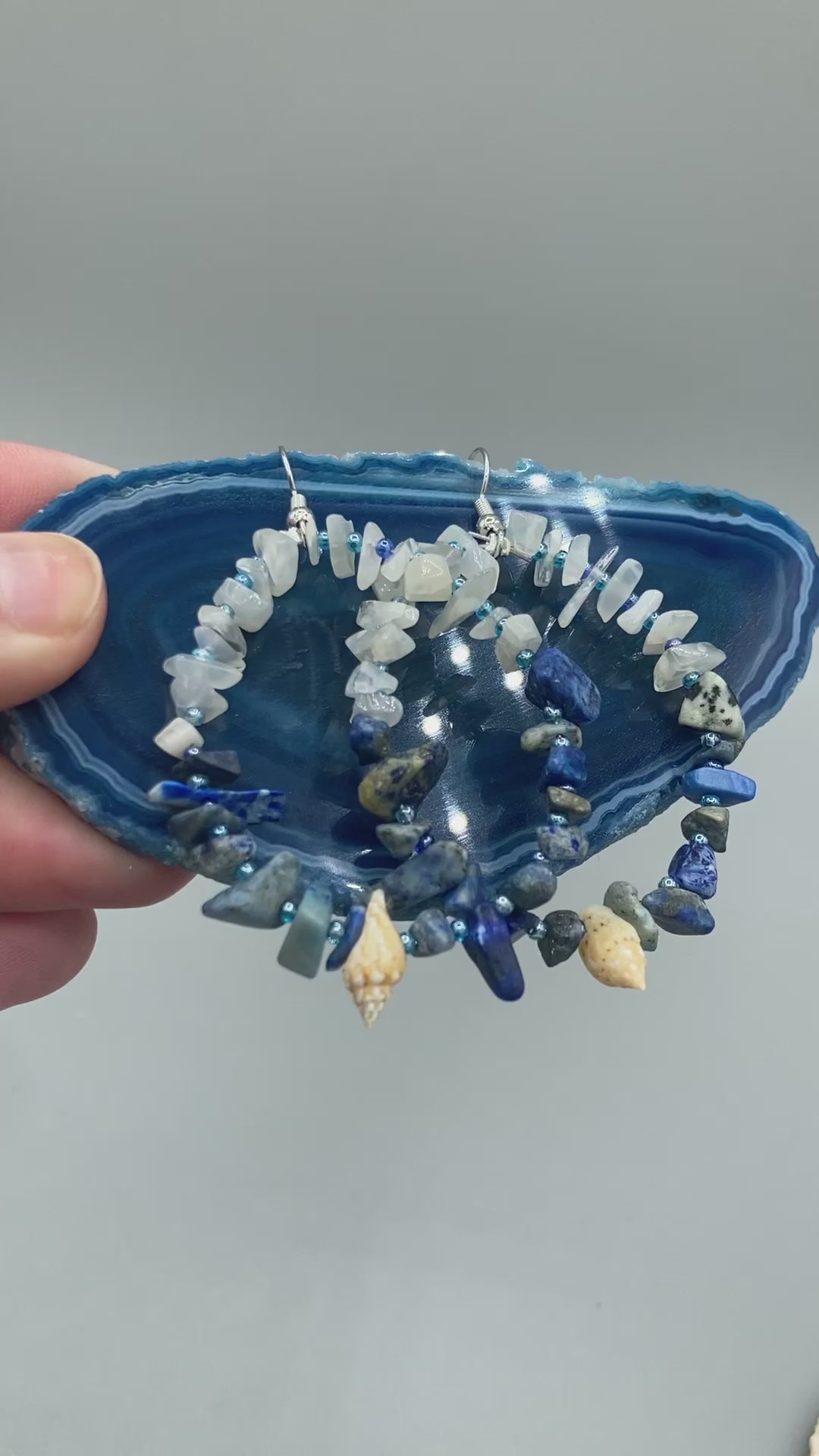 These earrings boast a beautiful combination of natural lapis and white moon stone chip stones, artfully inlaid with gold glass beads in a hoop formation. Dainty conch shells add a subtle touch of nature for a look that perfectly captures the beach vibes of summer. An ideal choice to complement any style.