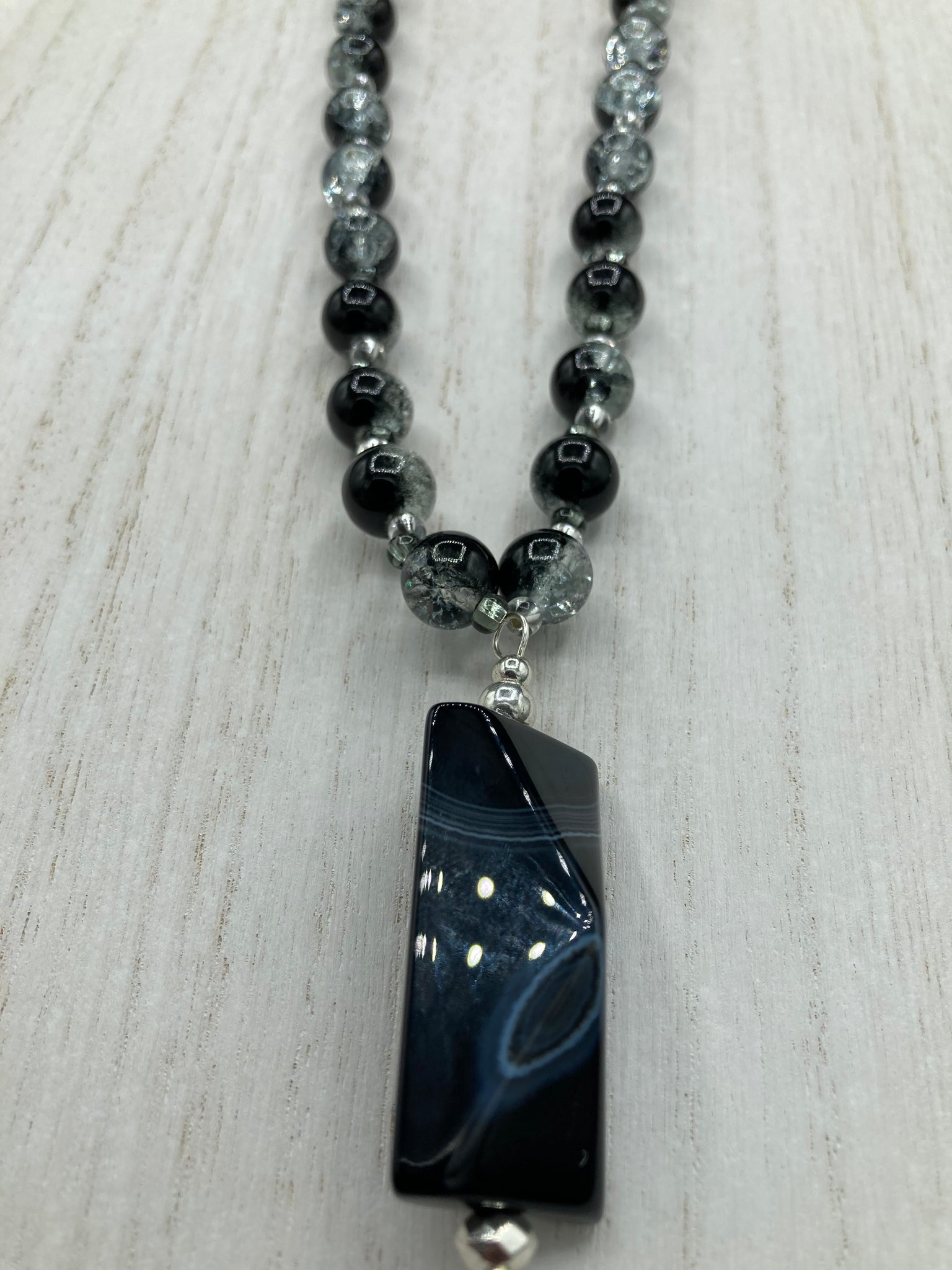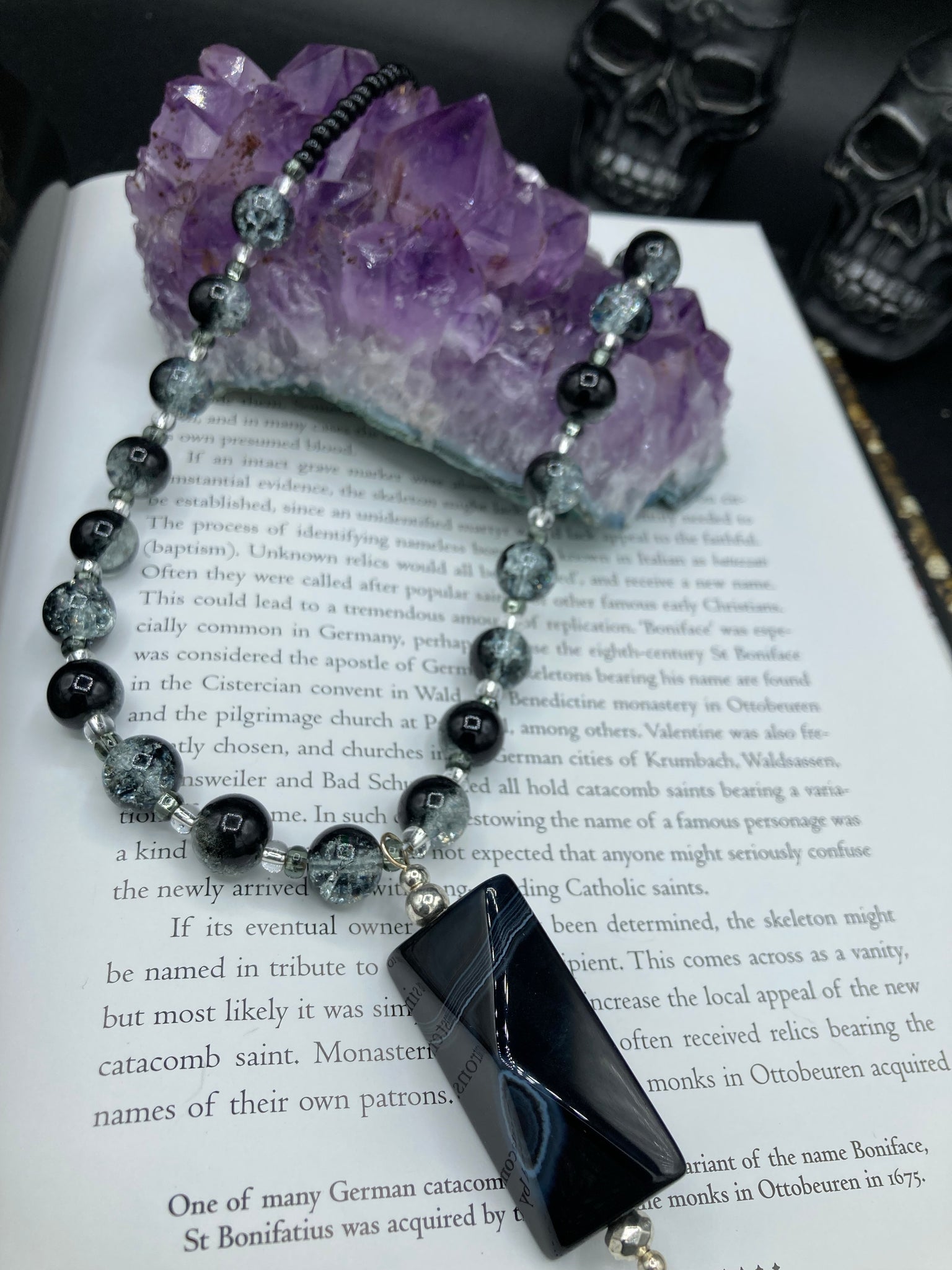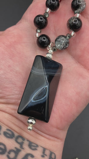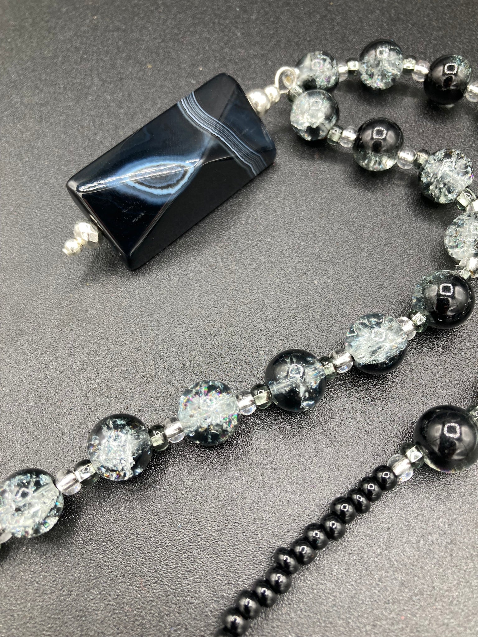 This black agate natural stone necklace features a unique rectangular pyramid shape and multi-colored glass beads. Perfect for all kinds of looks, from cocktail attire to shabby chic to elegant goth styles, this necklace is as versatile as it is stylish and will complete any outfit. The set includes matching earrings, making it a must-have addition to any jewelry collection.