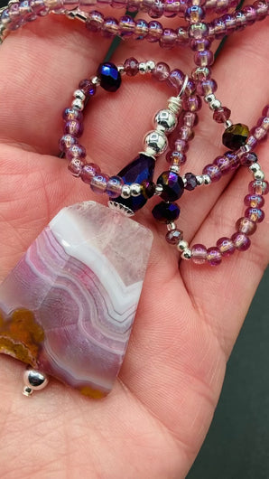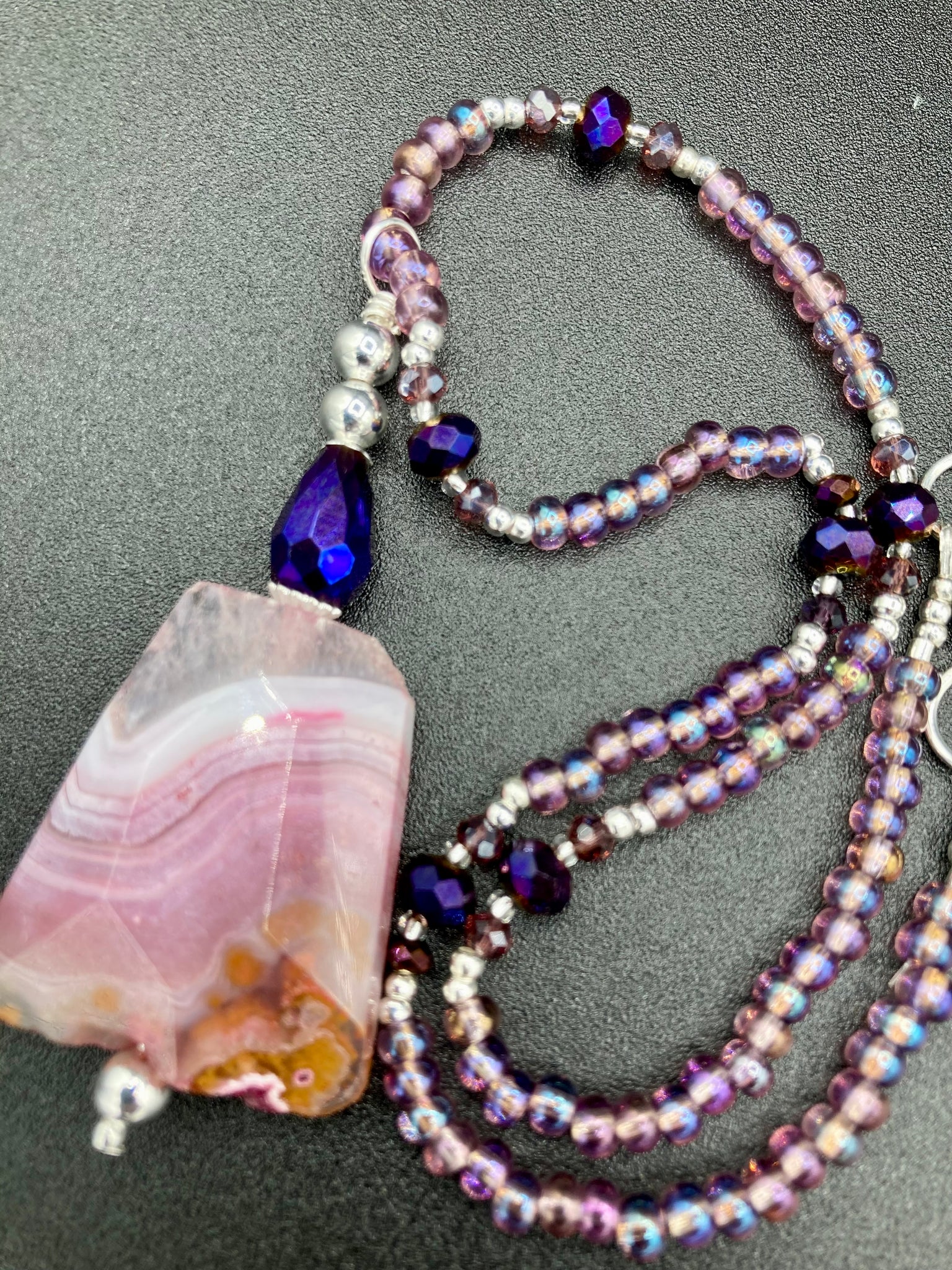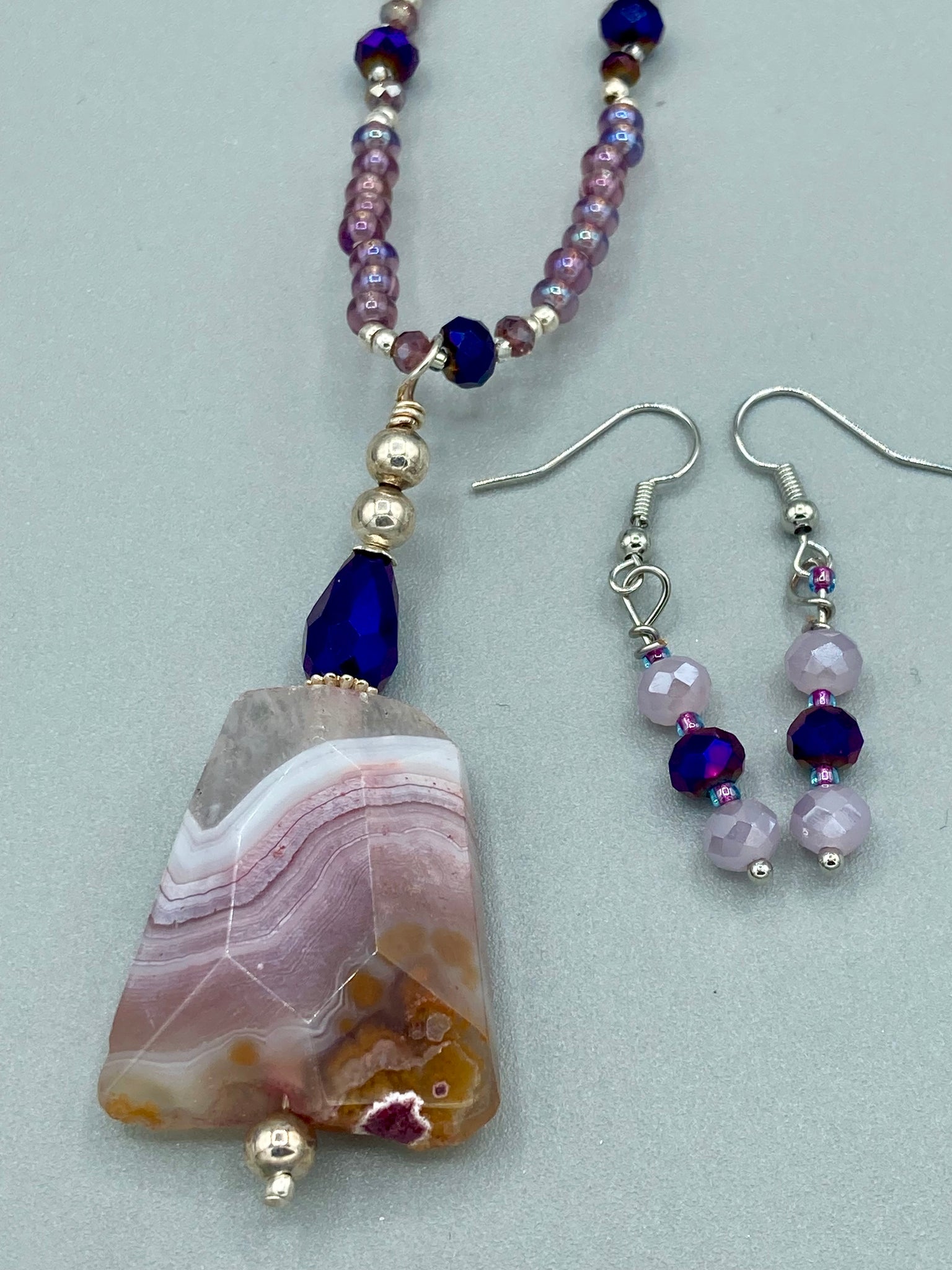 A soft dusty rose agate pendant is accompanied by shimmery beads of dusty rose, blue, dark pink, and gold. Adorned with large deep purple glass beads with a hint of gold shimmer, this stunning necklace set evokes a rose garden.