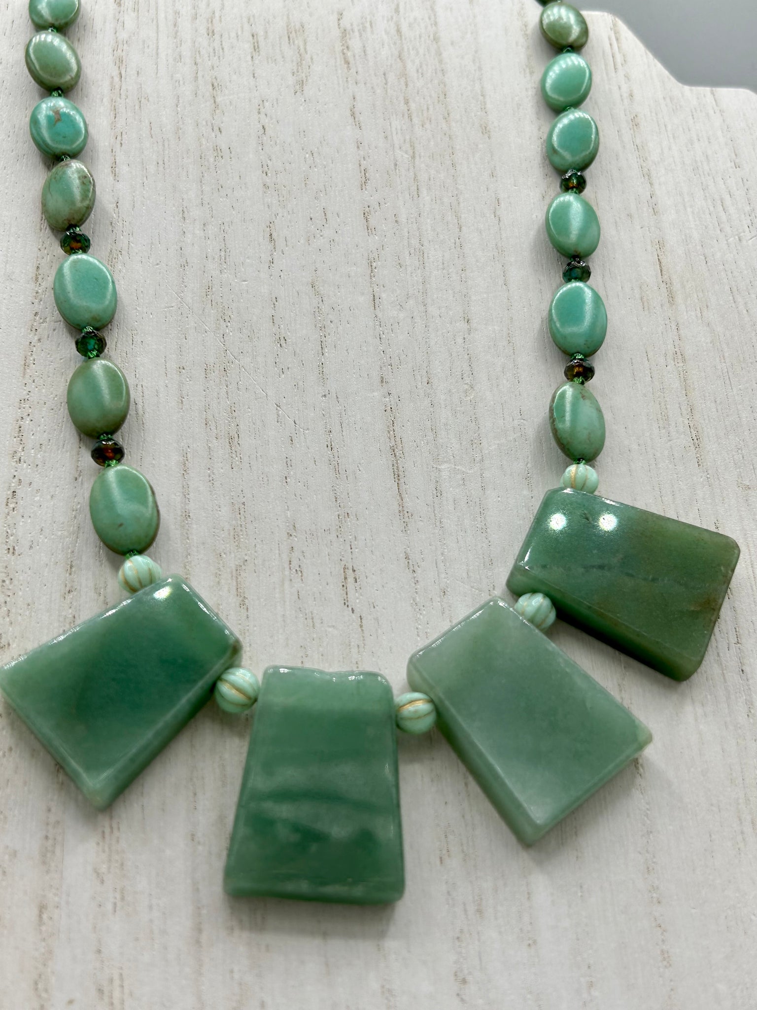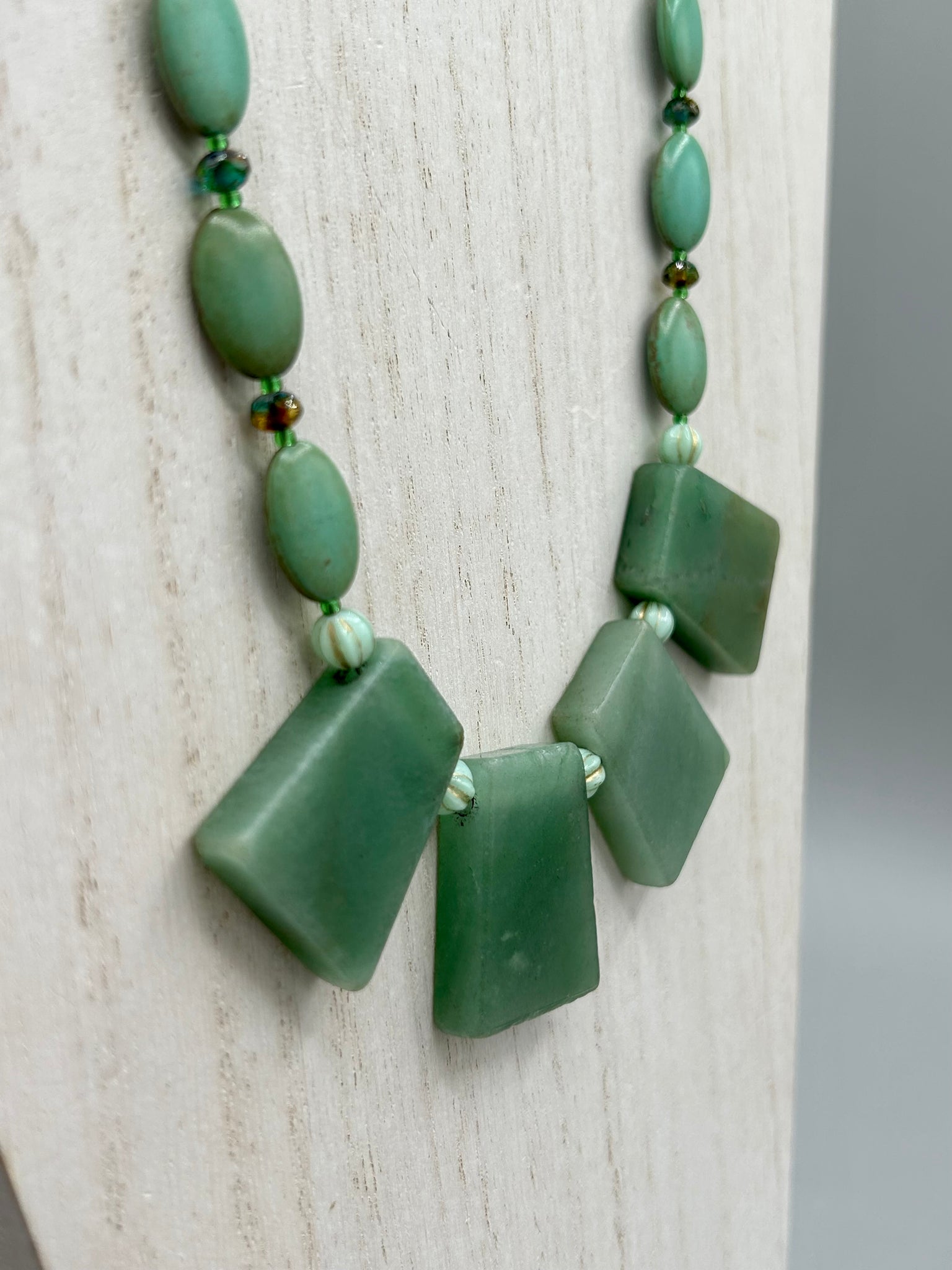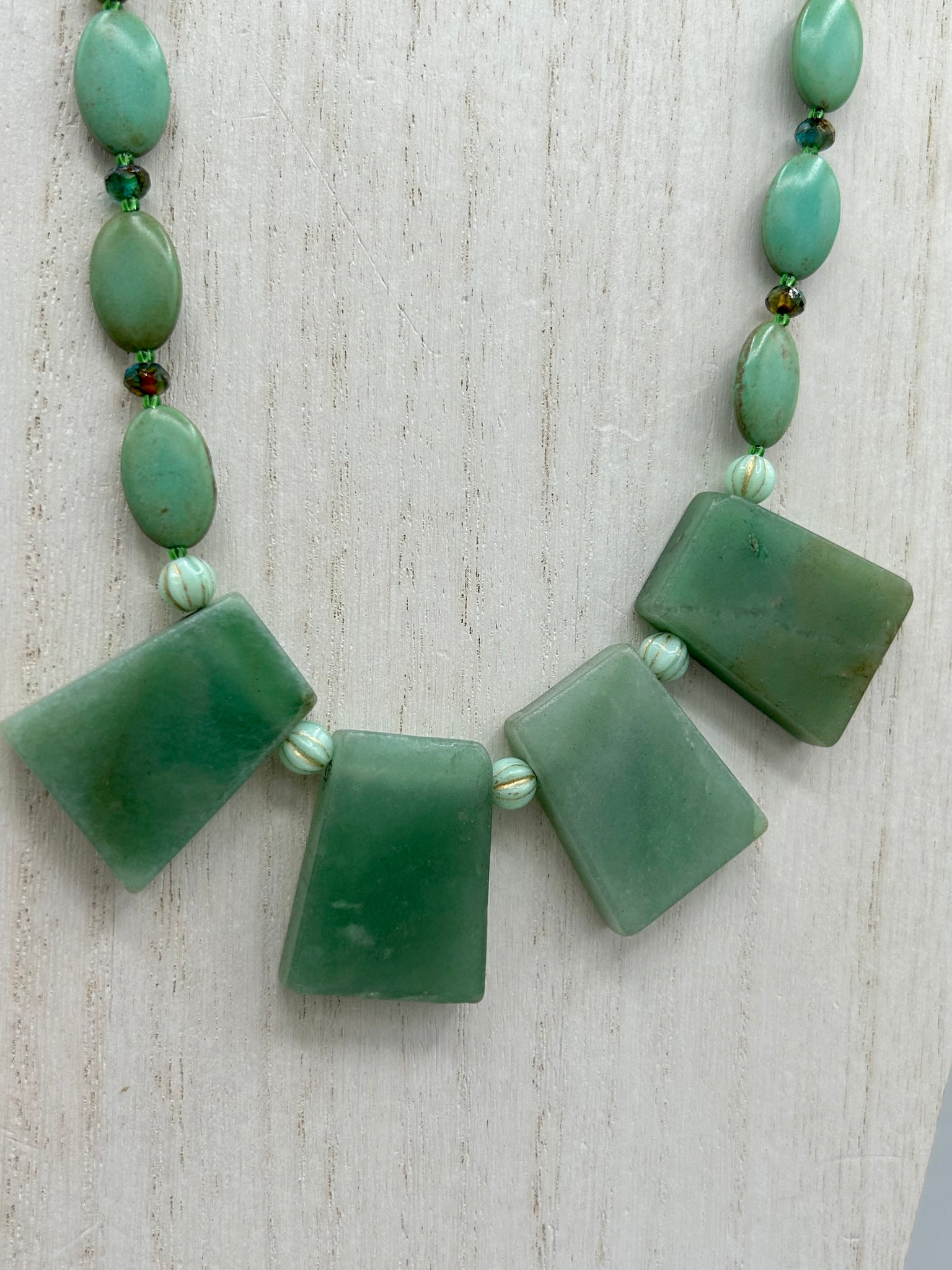 This hand crafted necklace features a large trapezoid-shaped green aventurine stone, mint green melon beads with gold shimmer, and teal glass beads with an amber tone. Intricately arranged together, this piece offers genuine stones and an elegant bohemian style.