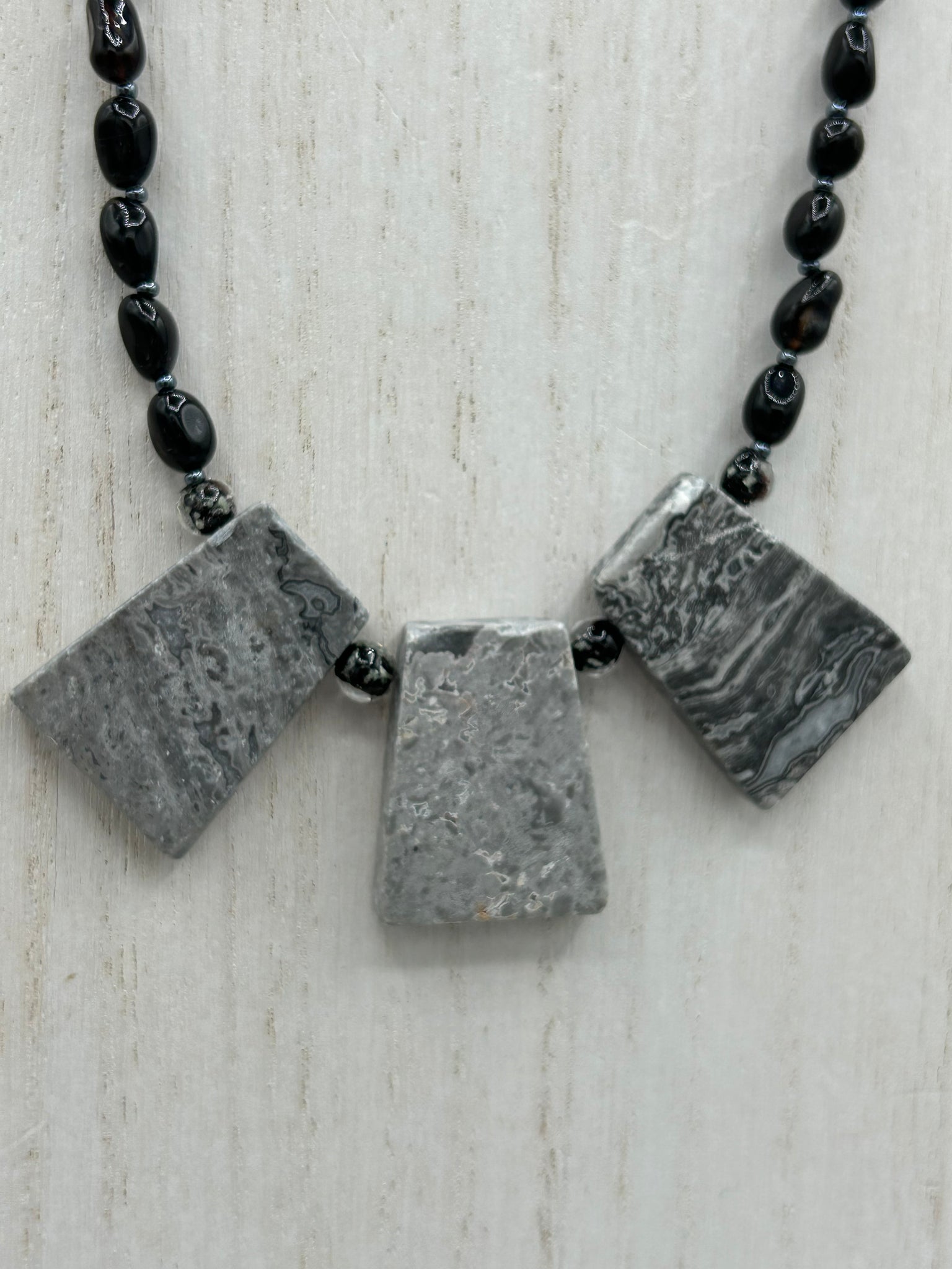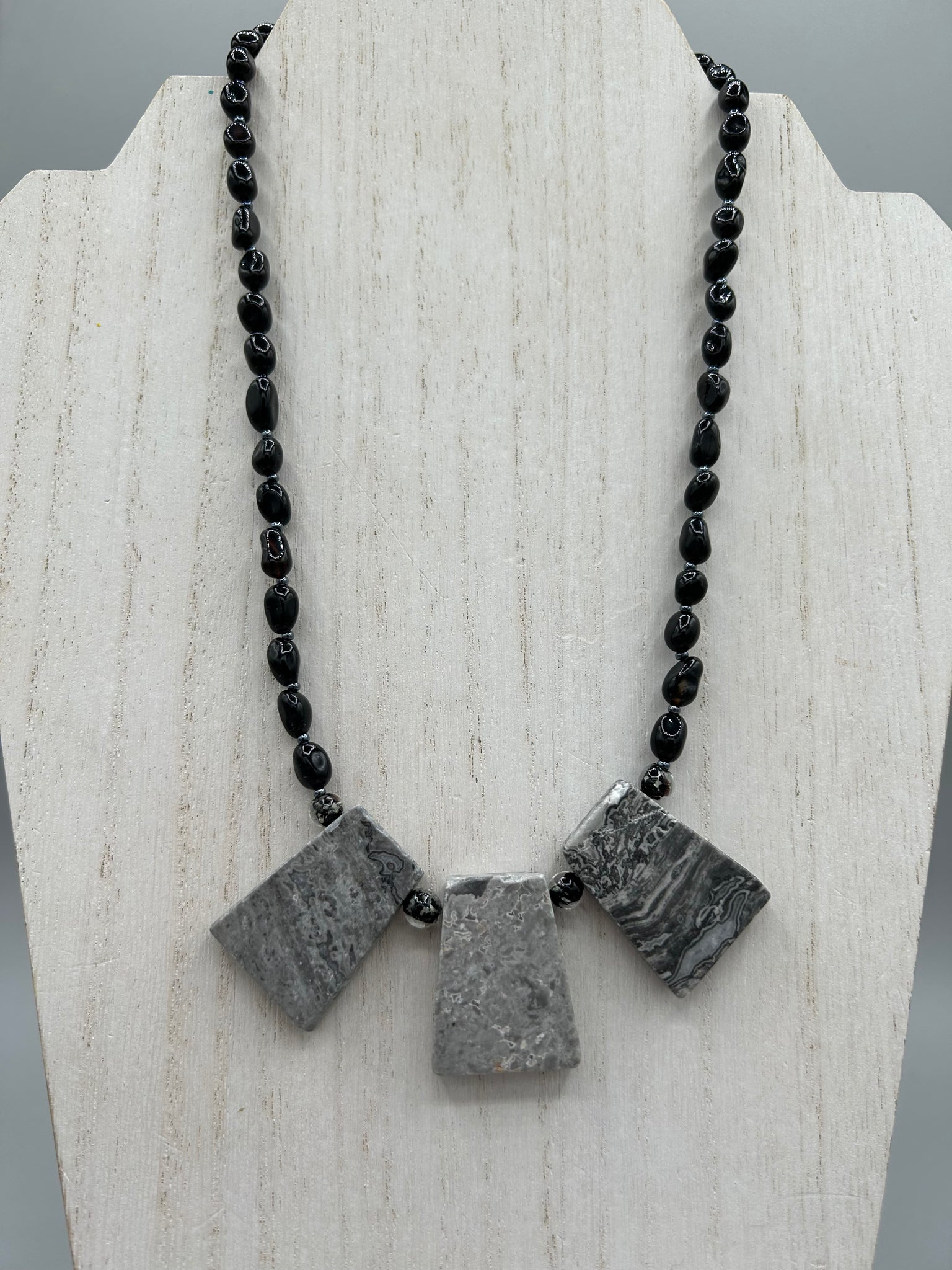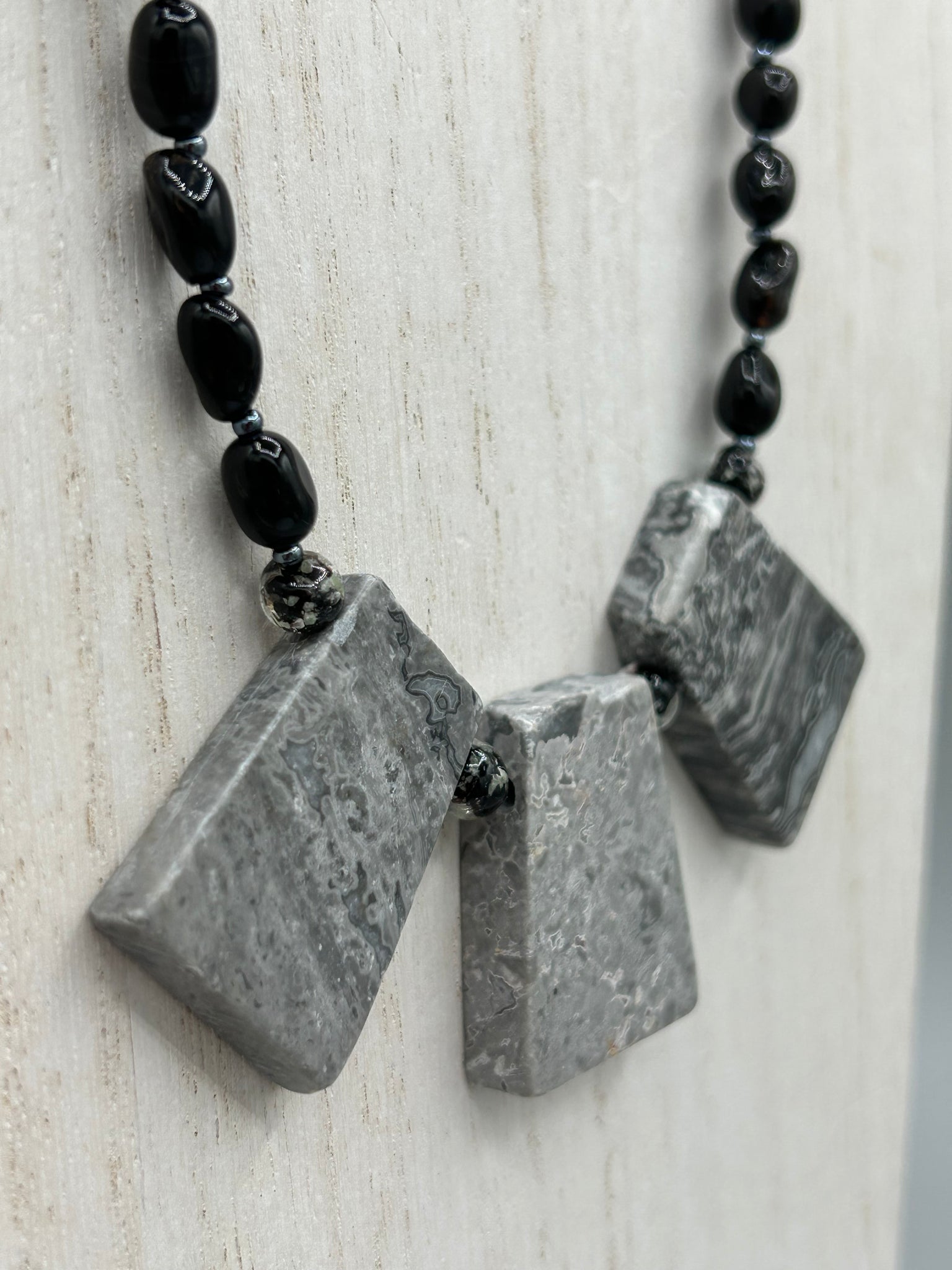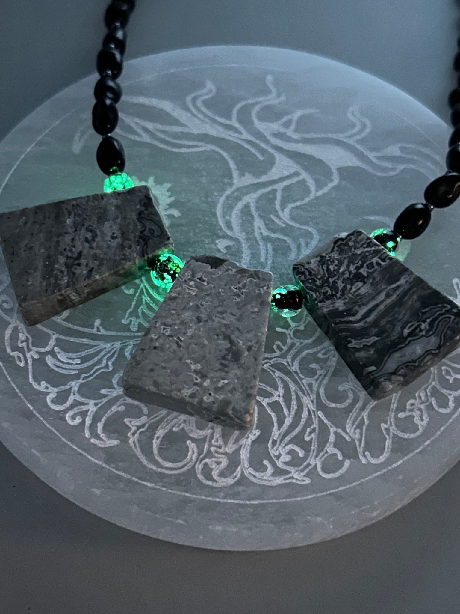 This rustic necklace features an eye-catching large trapezoid-shaped Picasso jasper and black agate combo set in a unique and chic design. For an added fun touch, four glass beads in the middle are glow in the dark. Handcrafted from genuine stones, this necklace is perfect for any bohemian look.