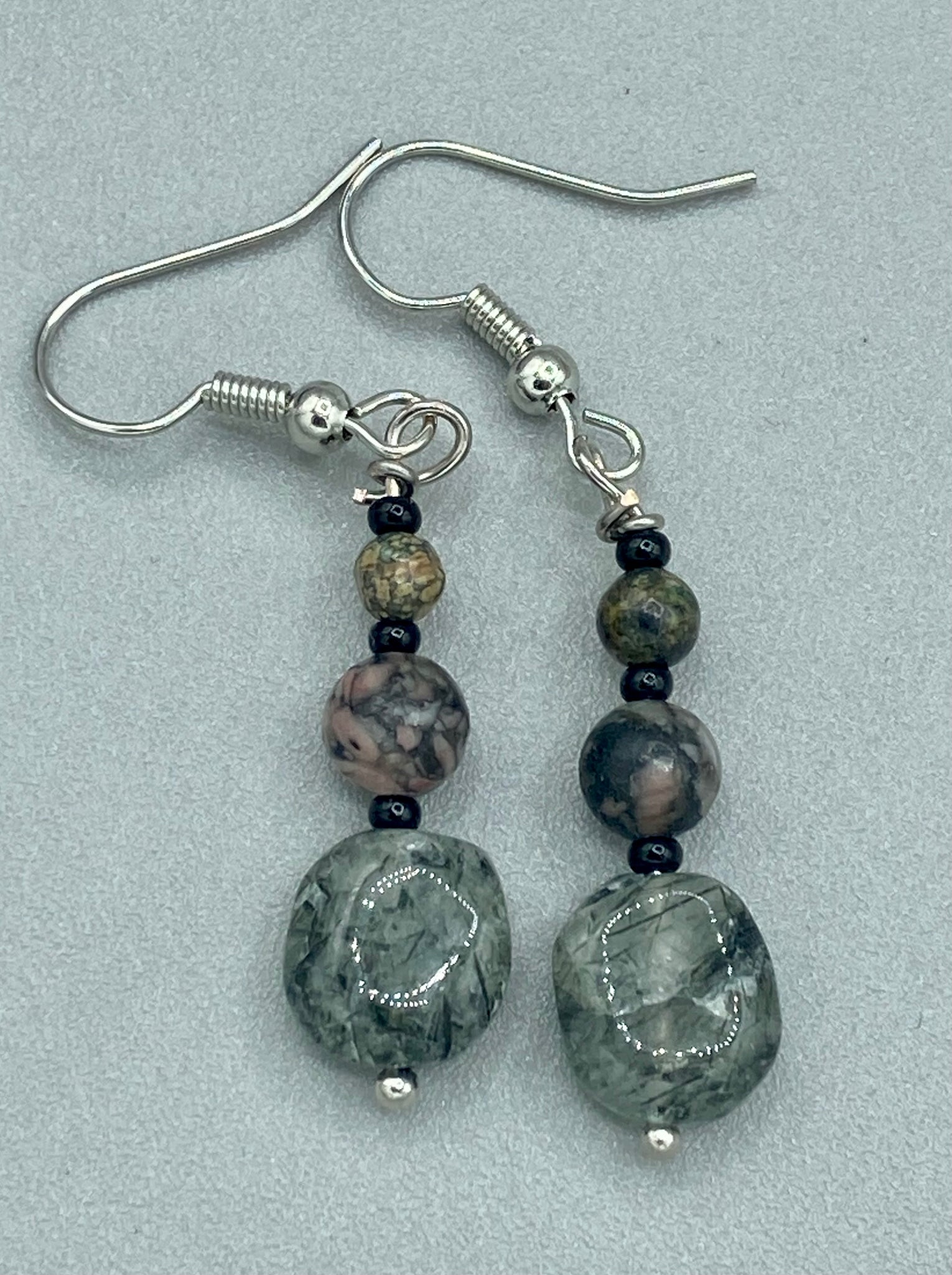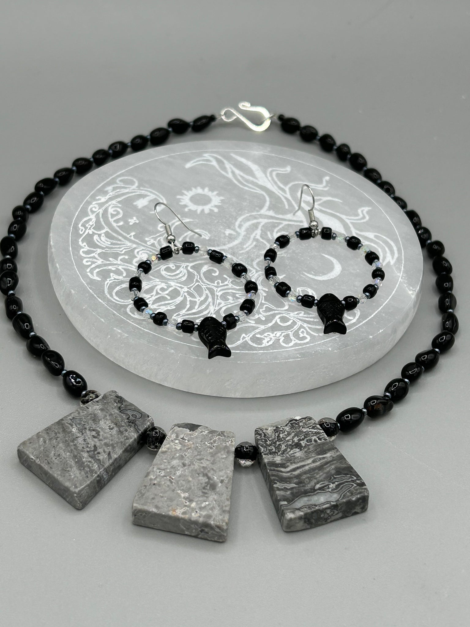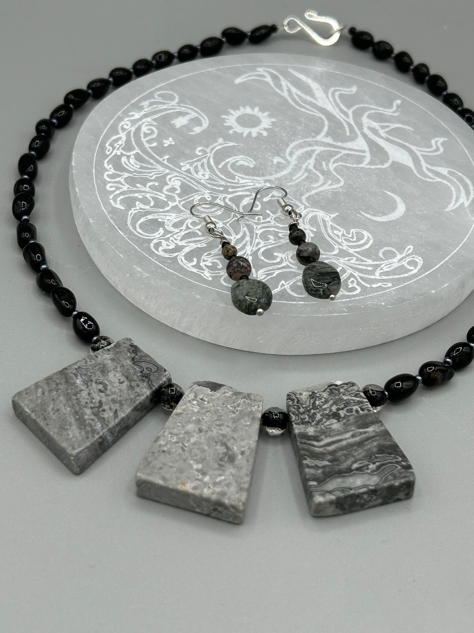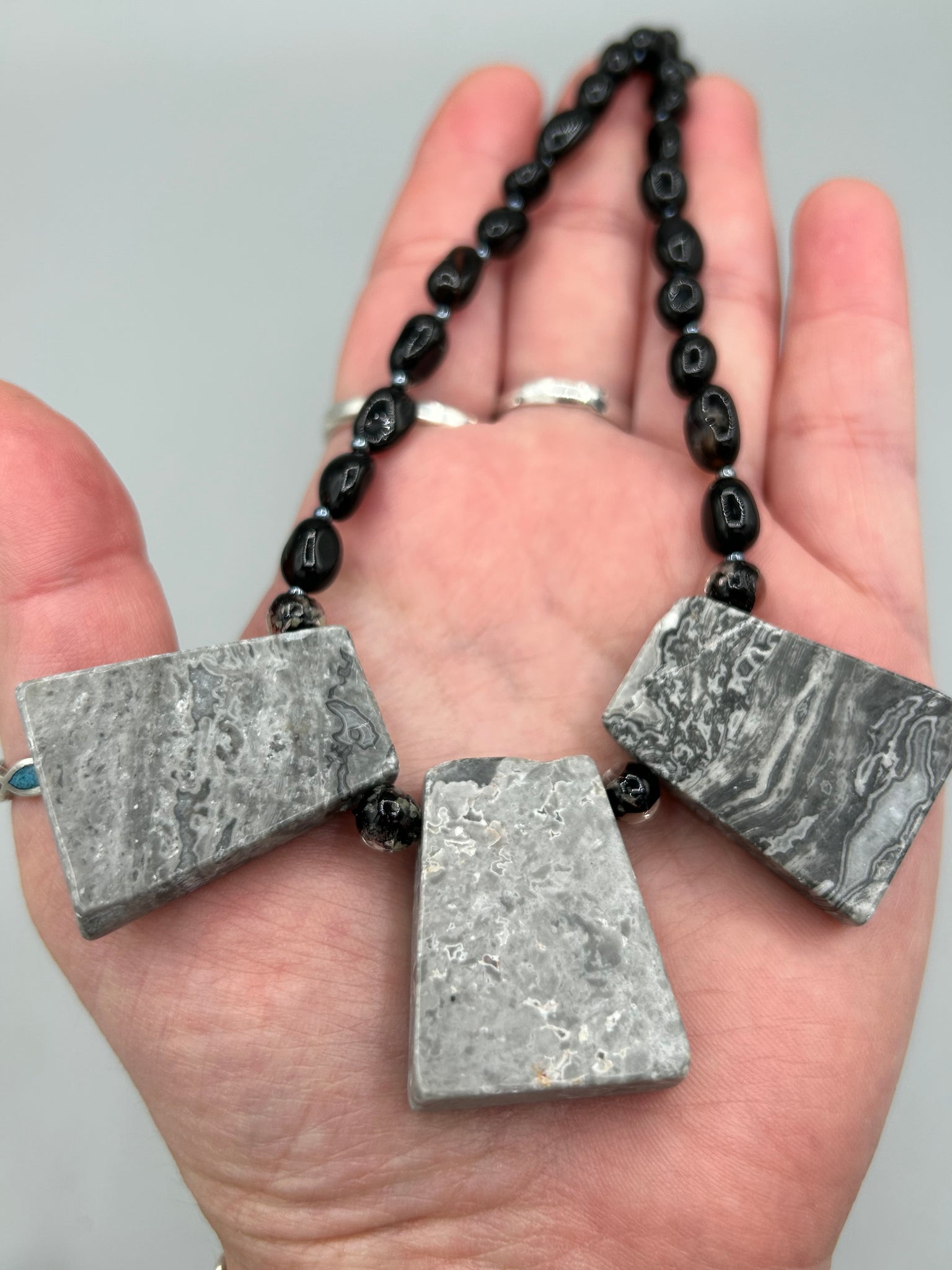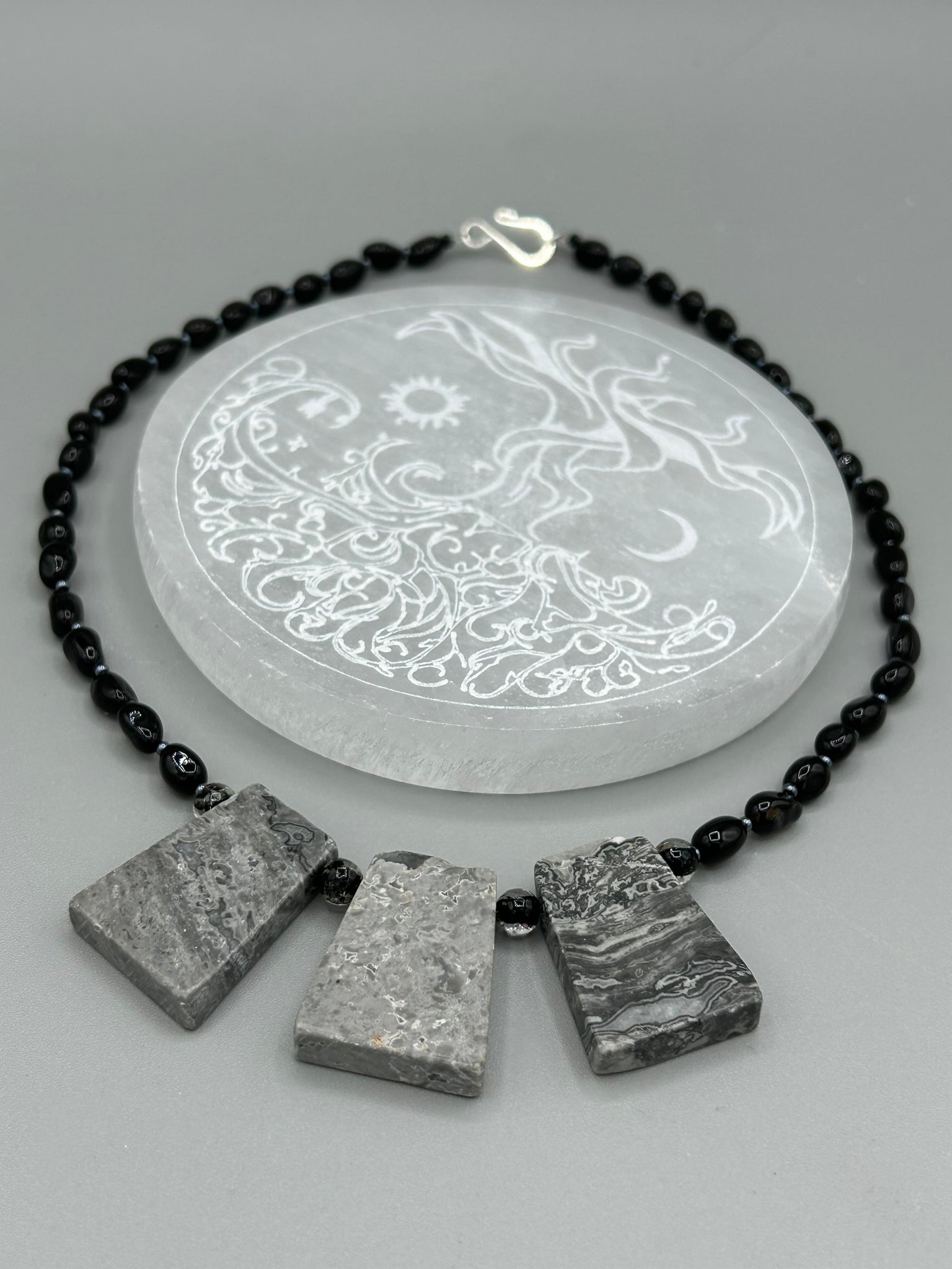 This rustic necklace features an eye-catching large trapezoid-shaped Picasso jasper and black agate combo set in a unique and chic design. For an added fun touch, four glass beads in the middle are glow in the dark. Handcrafted from genuine stones, this necklace is perfect for any bohemian look.