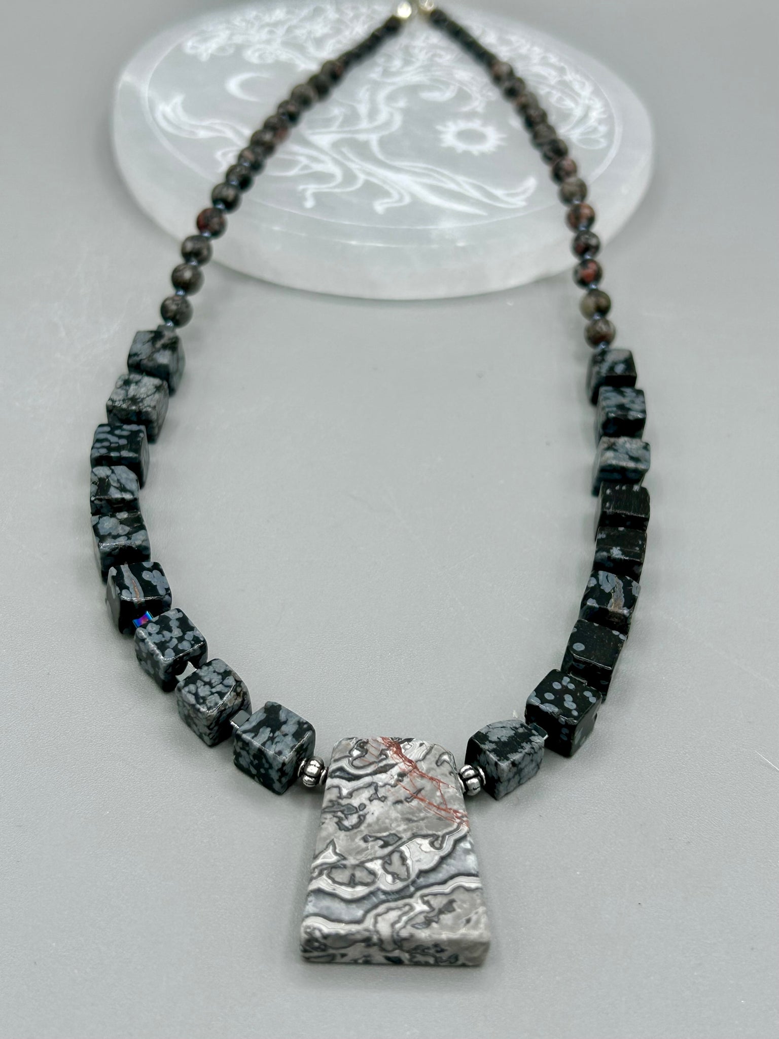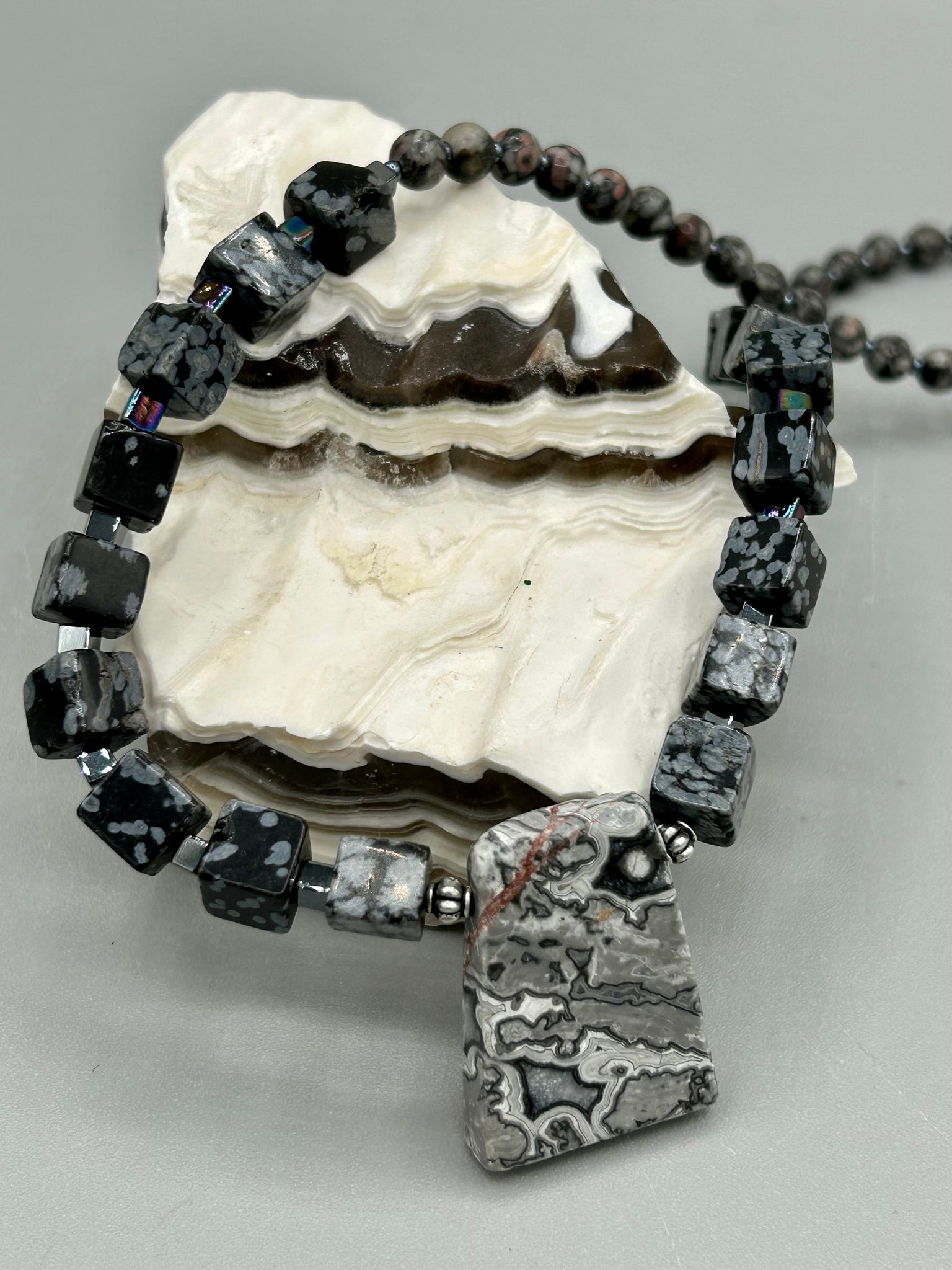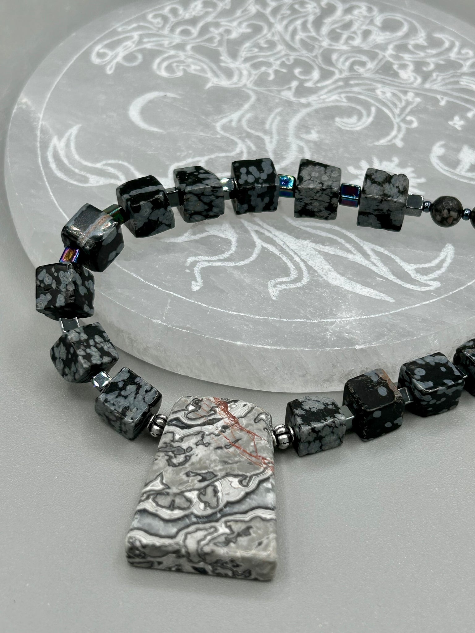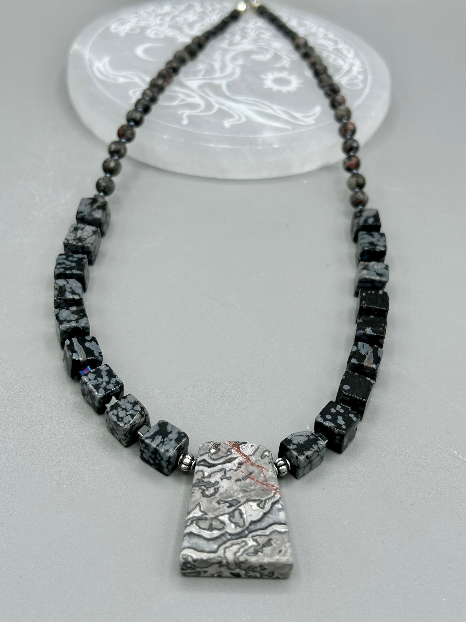 This rustic necklace features an eye-catching large trapezoid-shaped Picasso jasper, hematite, square-shaped snowflake obsidian combo set in a unique and chic design. Handcrafted from genuine stones, this necklace is perfect for any bohemian look.