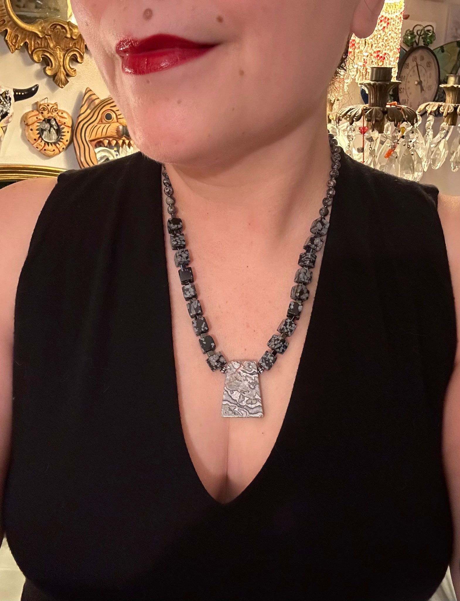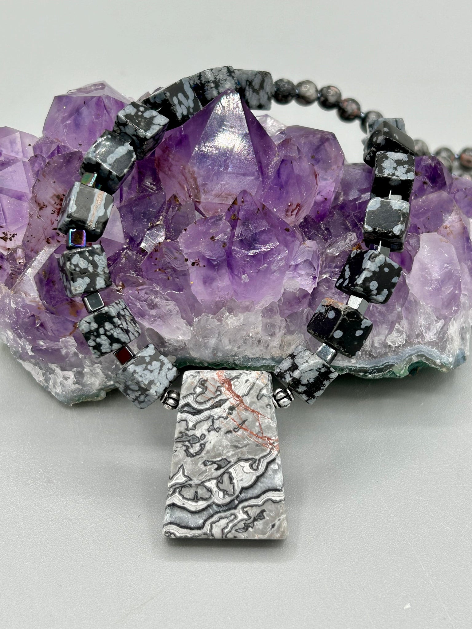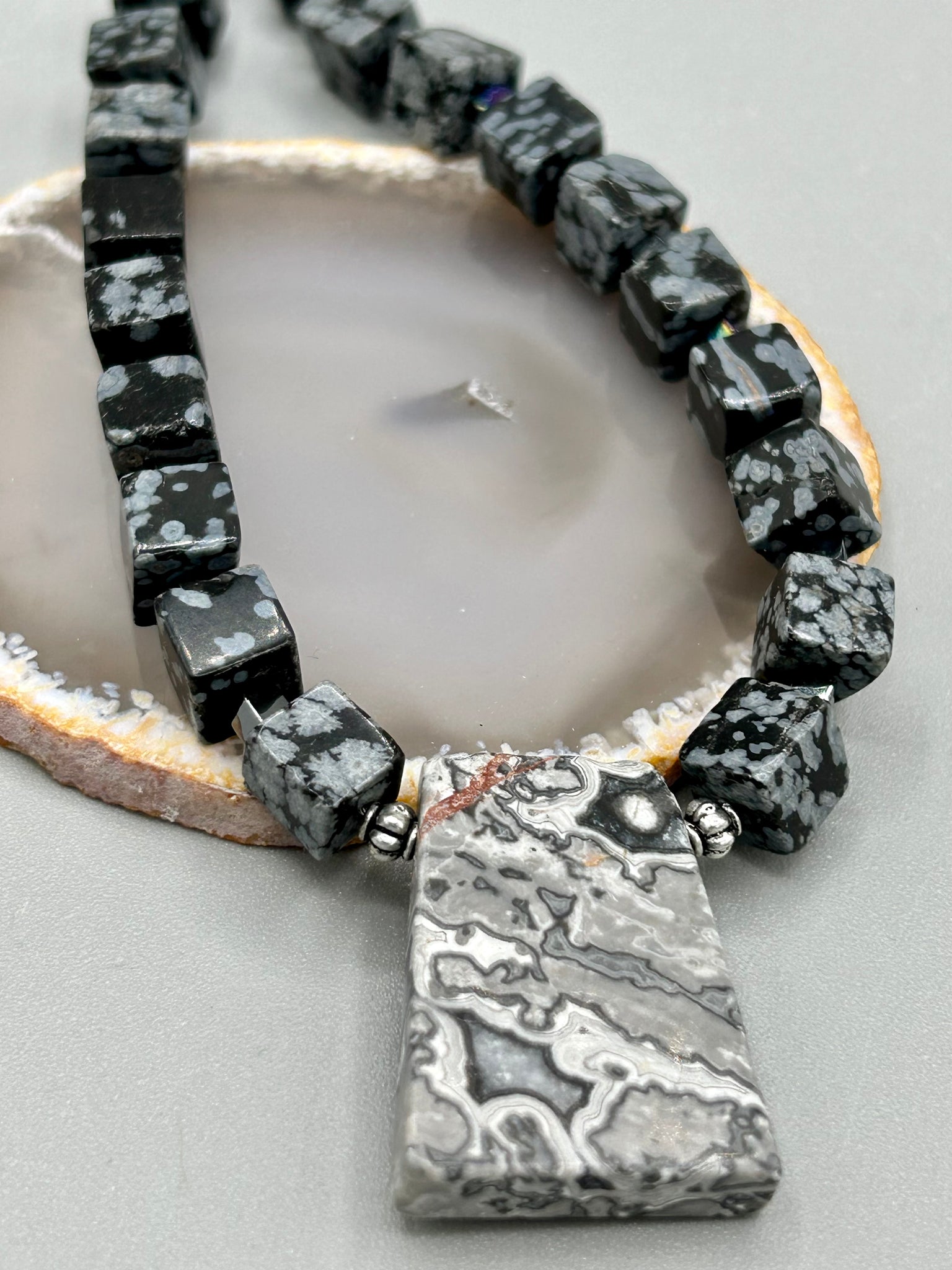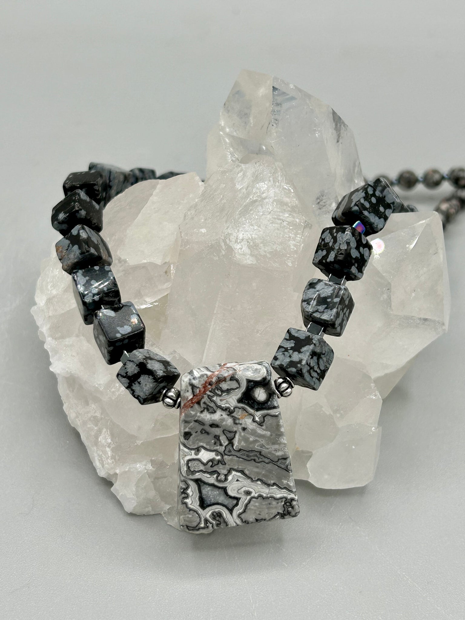 This rustic necklace features an eye-catching large trapezoid-shaped Picasso jasper, hematite, square-shaped snowflake obsidian combo set in a unique and chic design. Handcrafted from genuine stones, this necklace is perfect for any bohemian look.