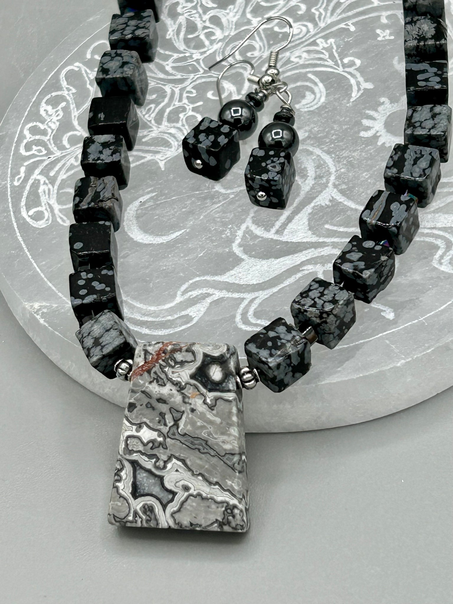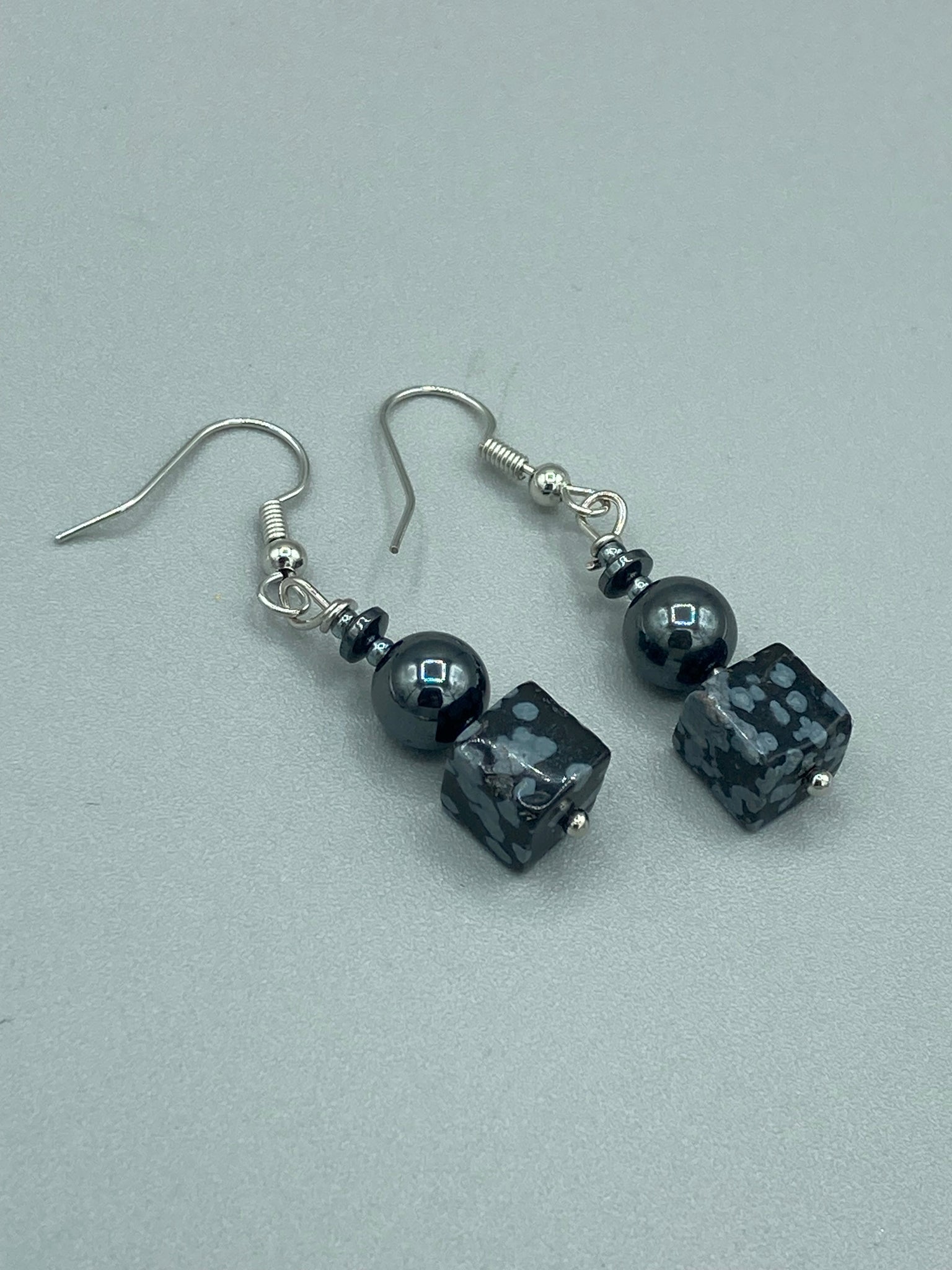 Snowflake Obsidian and Hematite Earrings: 1 1/4” in length