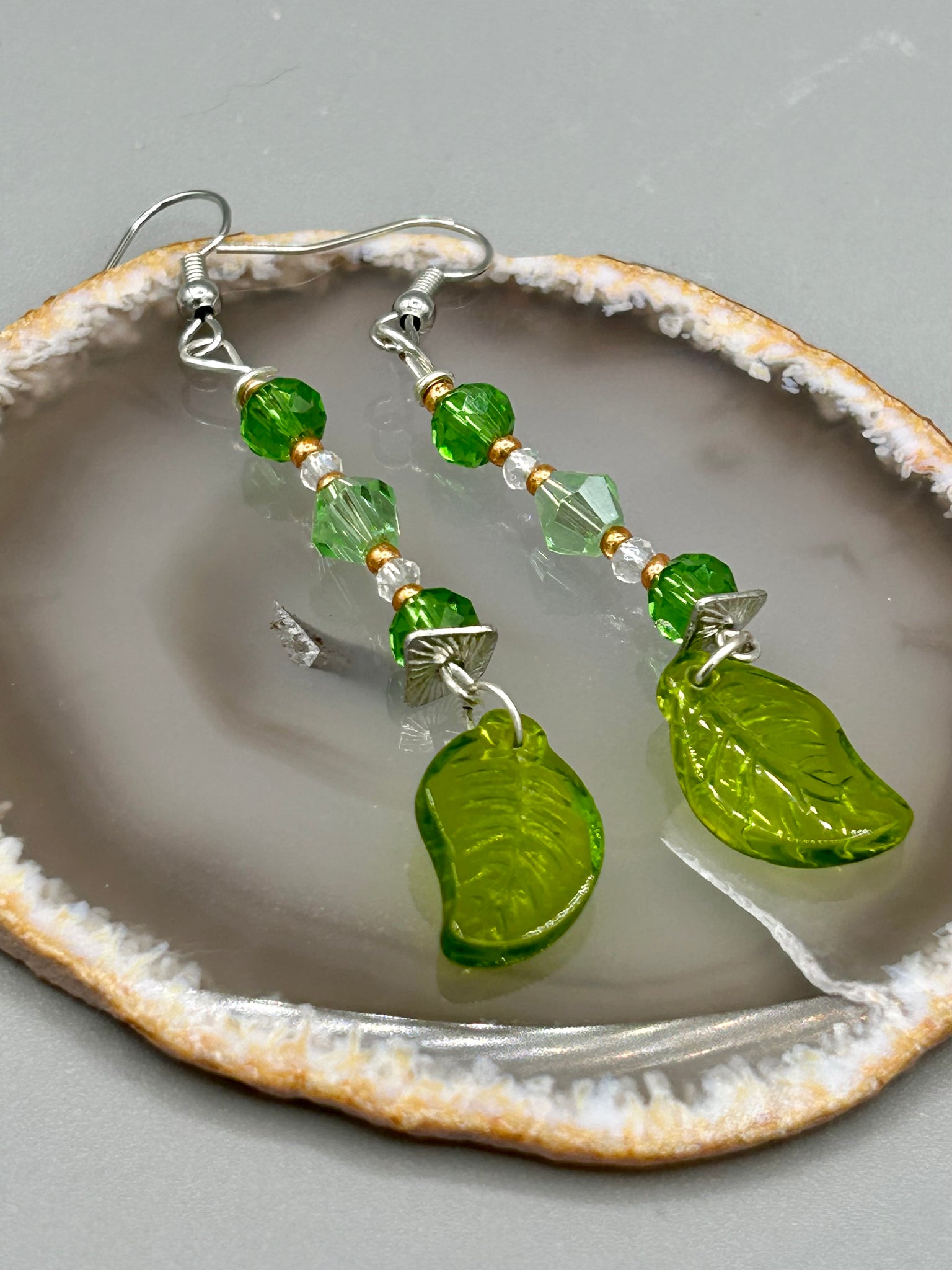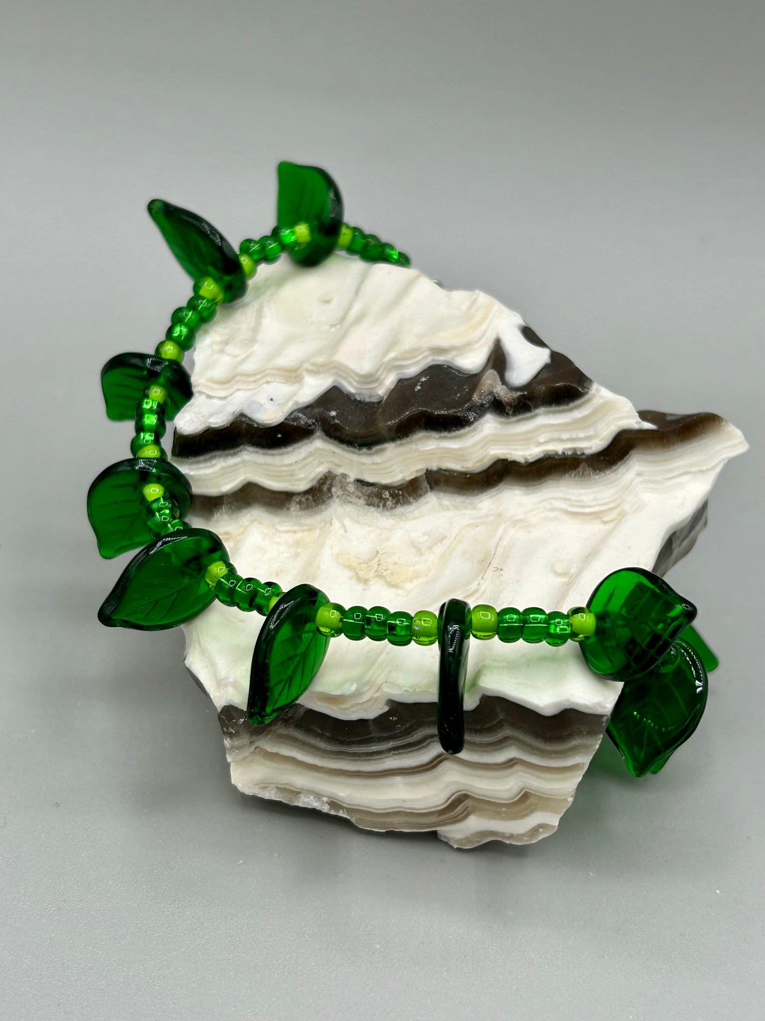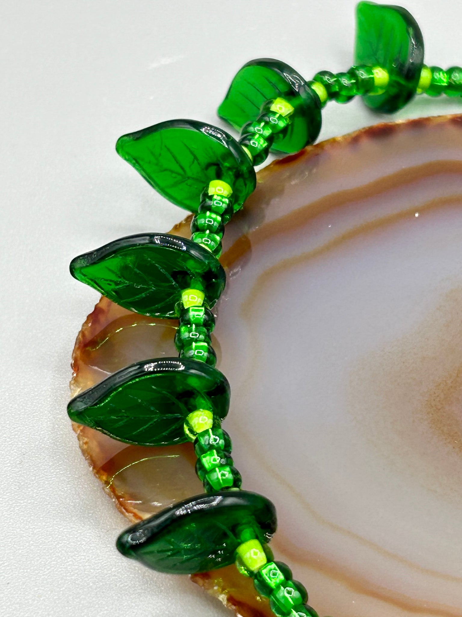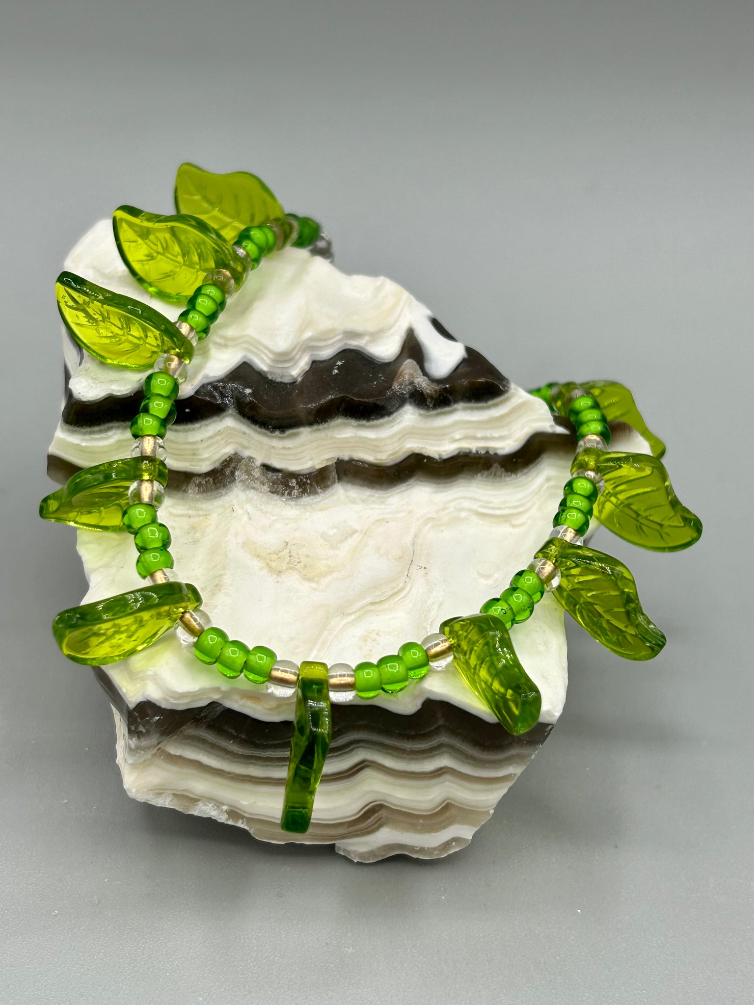 This nature-inspired jewelry is crafted from shimmering glass beads in shades of light and dark green as well as clear iridescent and gold tones. Light and dark green glass leaf beaded anklet and earrings provide intricate detailing. Crafted with metal wire and a barrel screw clasp, they offer a secure fit.
