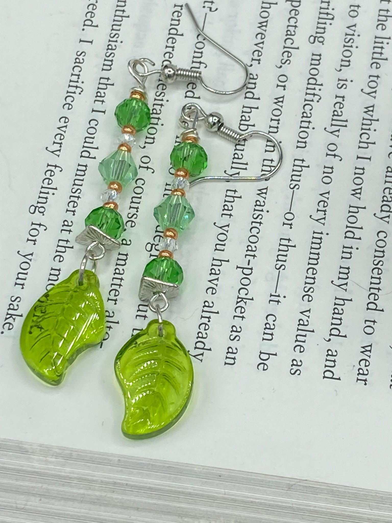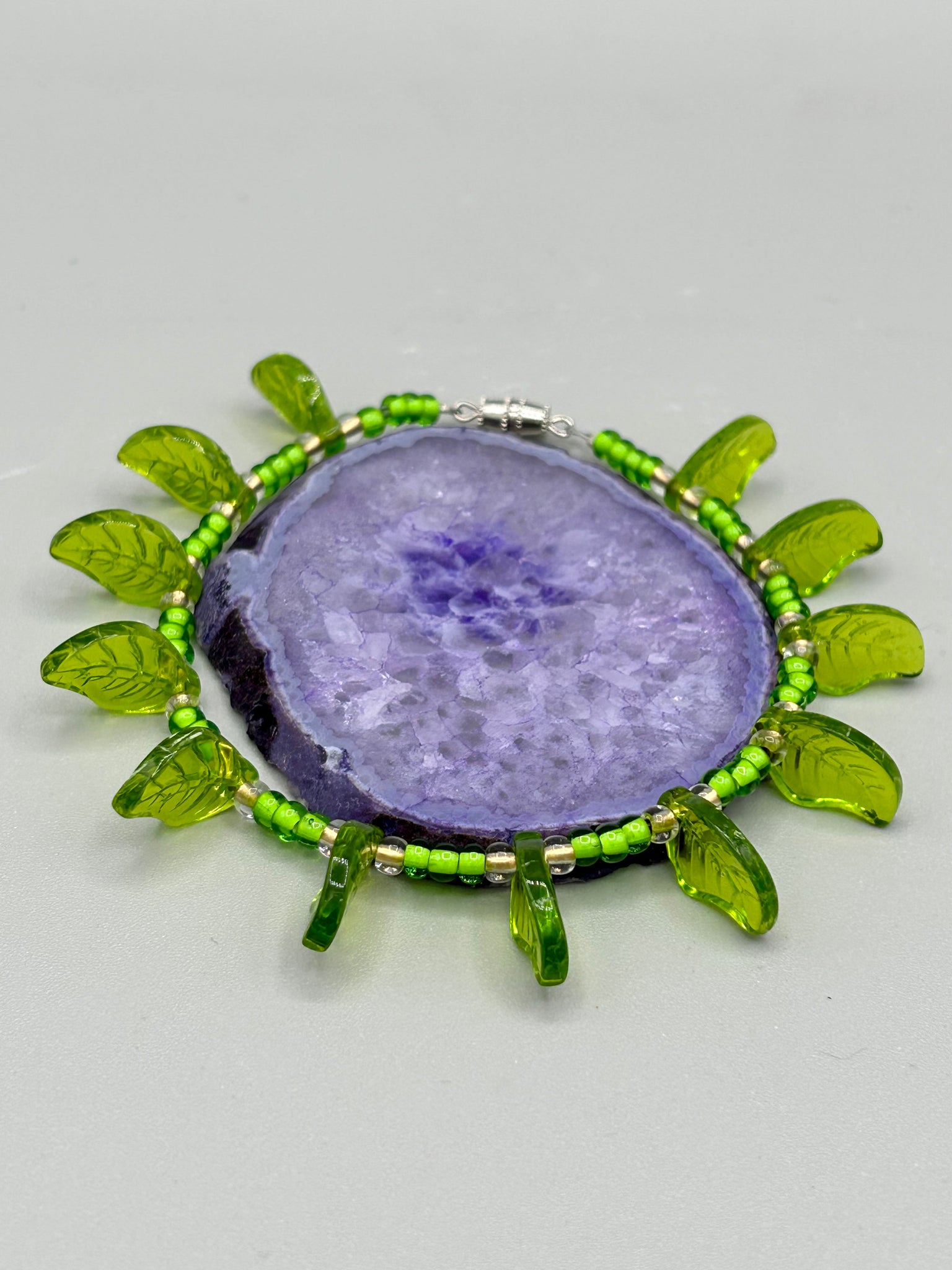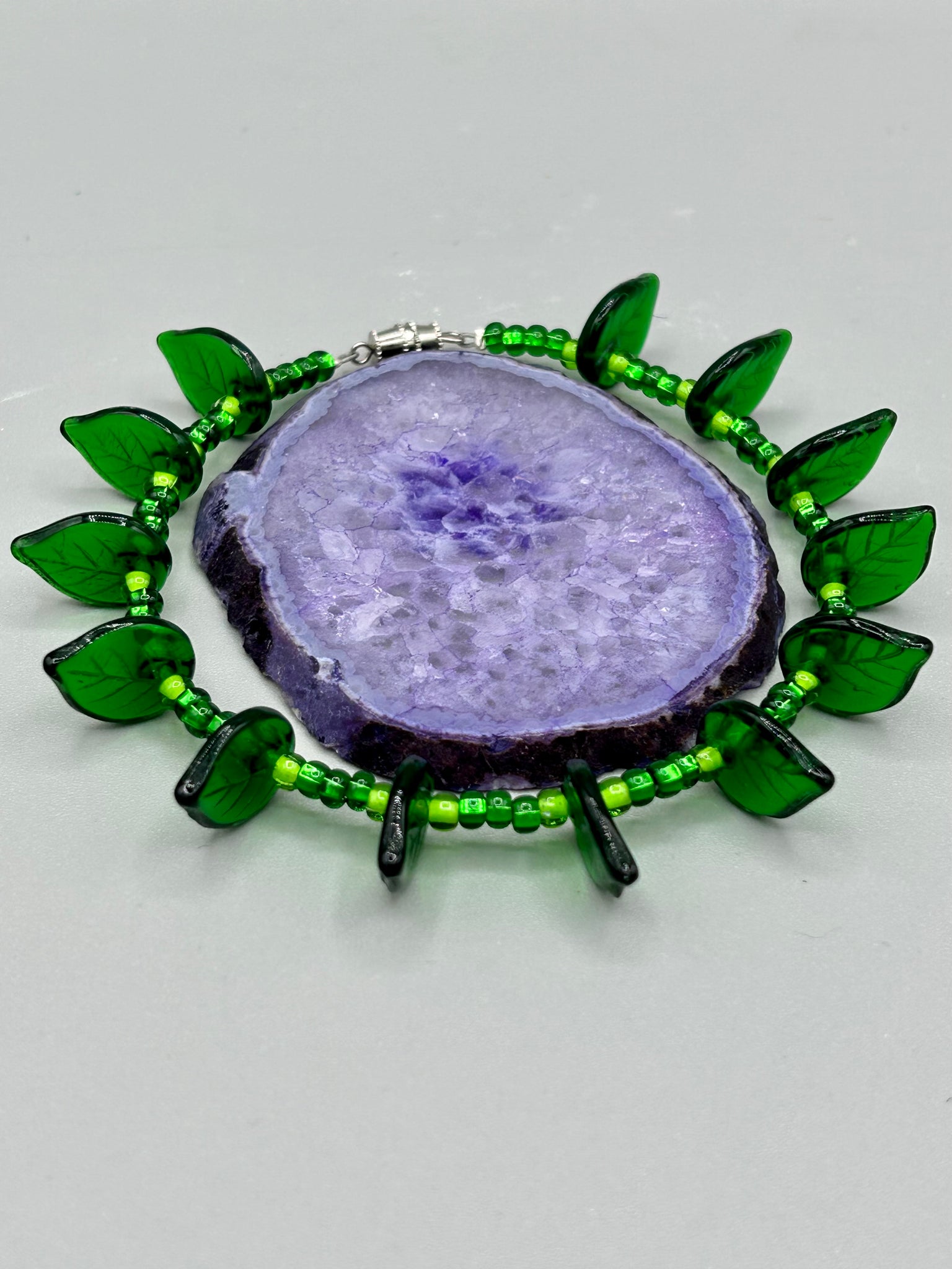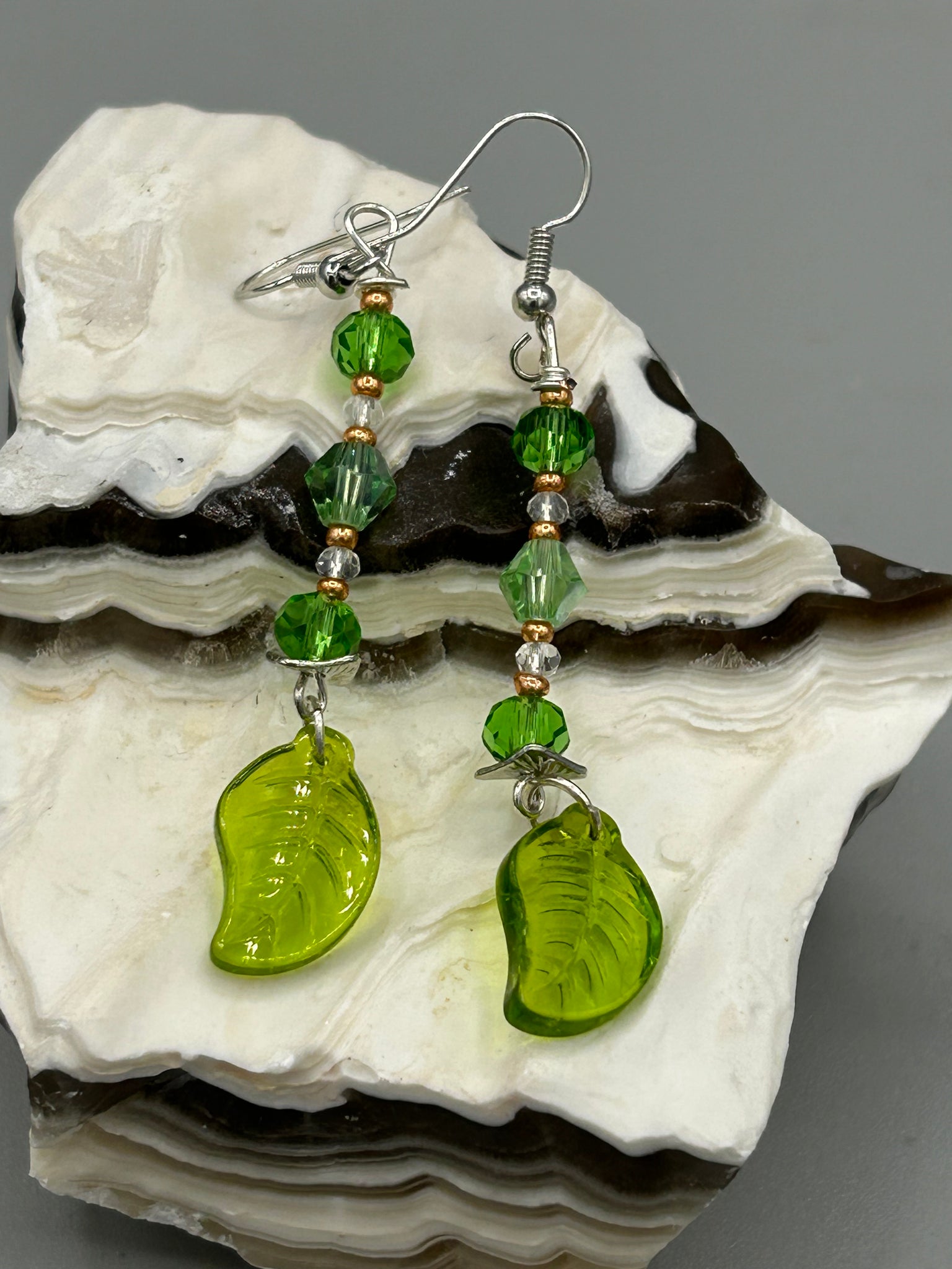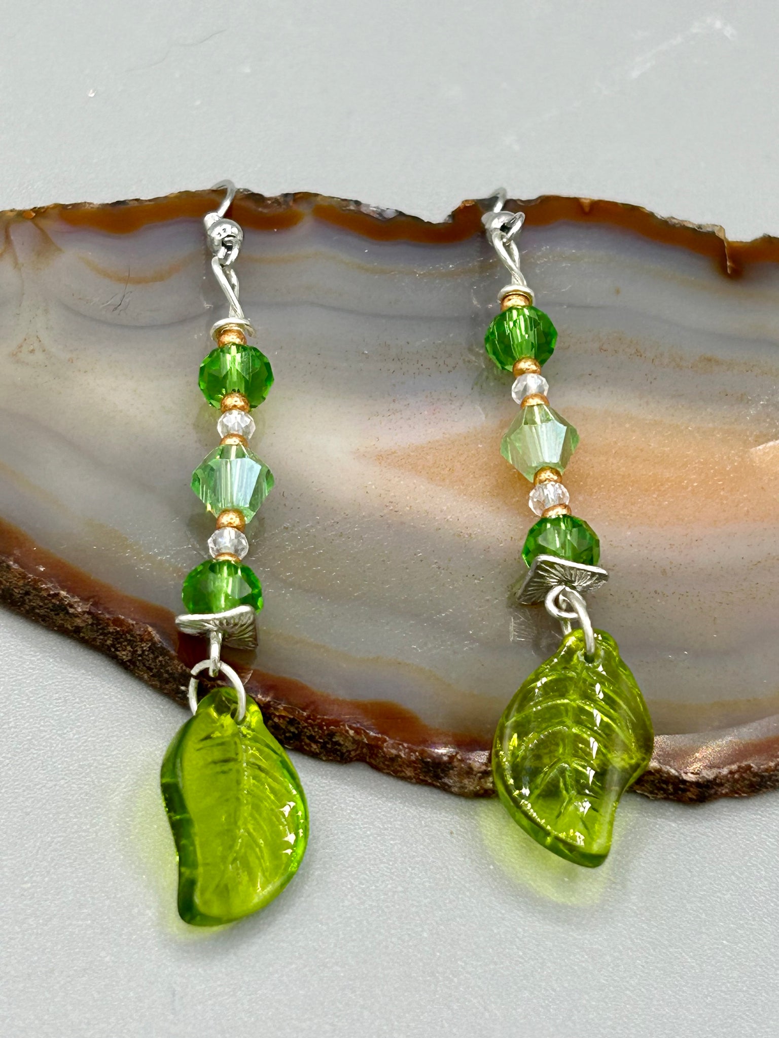 This nature-inspired jewelry is crafted from shimmering glass beads in shades of light and dark green as well as clear iridescent and gold tones. Light and dark green glass leaf beaded anklet and earrings provide intricate detailing. Crafted with metal wire and a barrel screw clasp, they offer a secure fit.